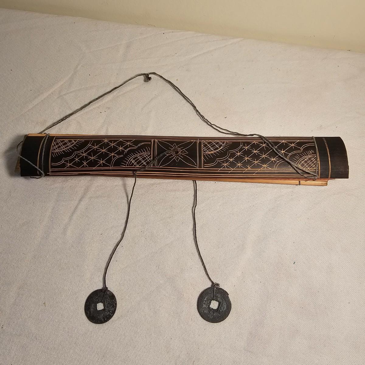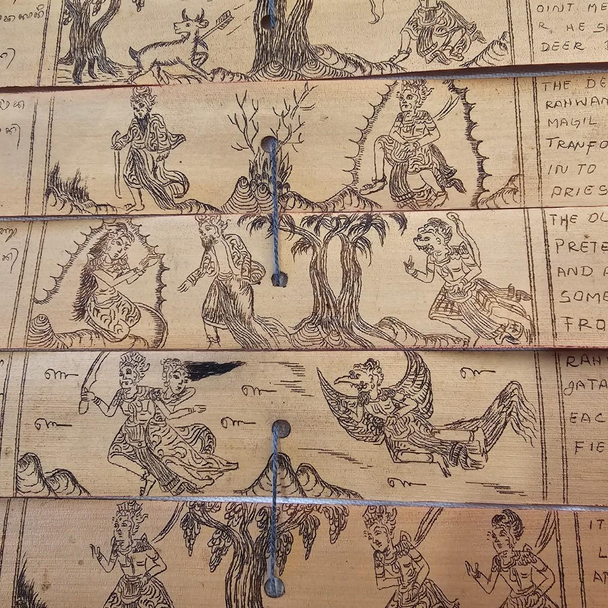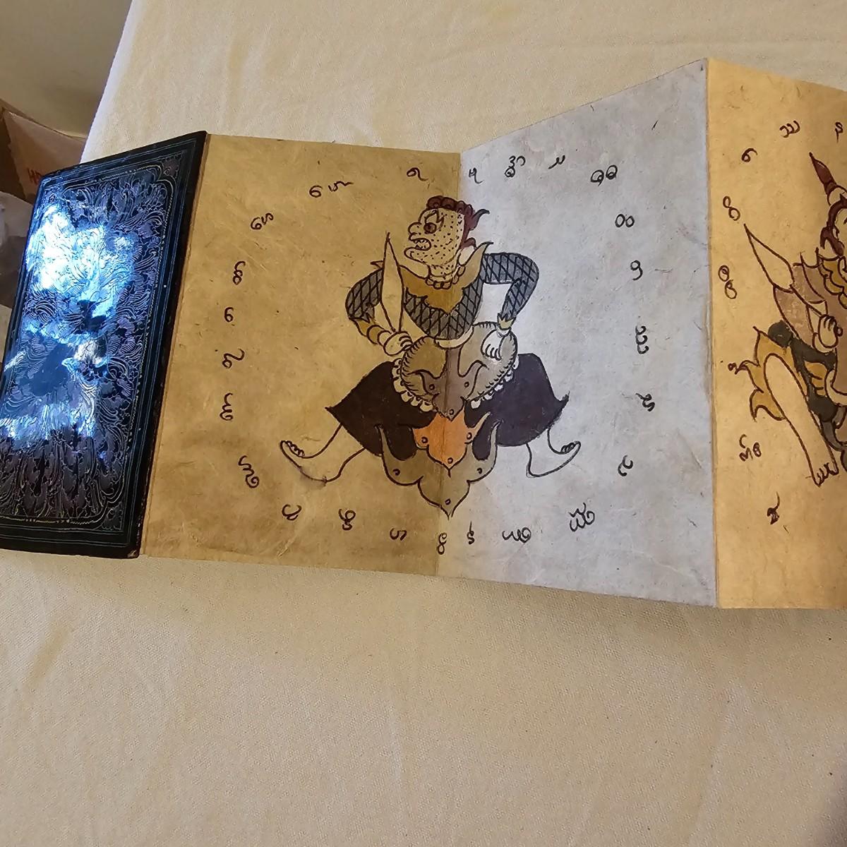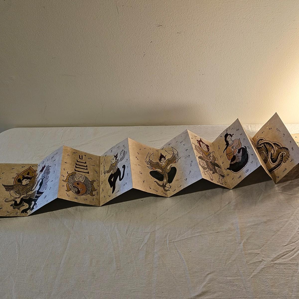 Beautiful small book with wood block prints on paper, book accordians to show images on both sides. Book is 6.75" x 48" open and 4.25" x 6.75" closed. Stylized bird and design on both outside covers. Palm leaf scroll has carved outside ends, opens to reveal a story in two different languages and a pictorial to accompany it. 11" x 14.5" open and 11" x 1.5" closed. Has two square hole vintage coins attached by cords. See photos for details. Shipping available.