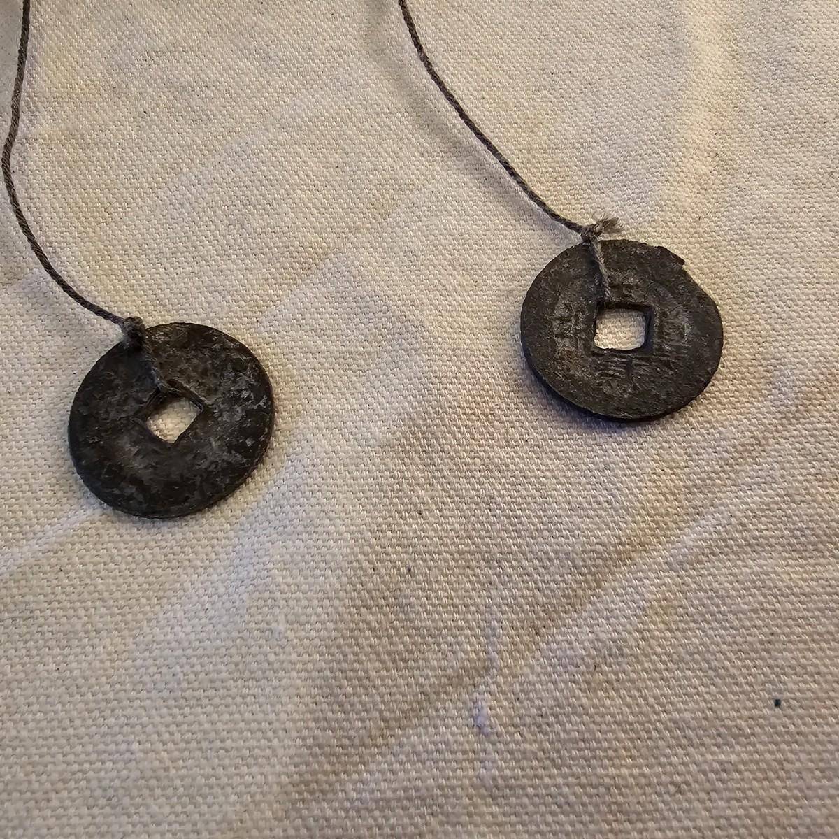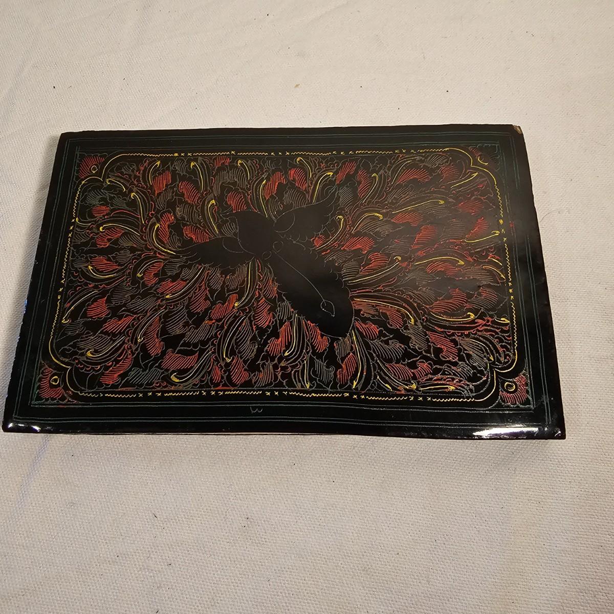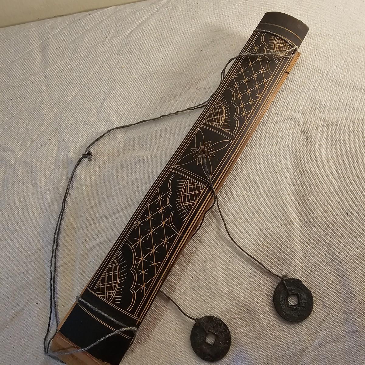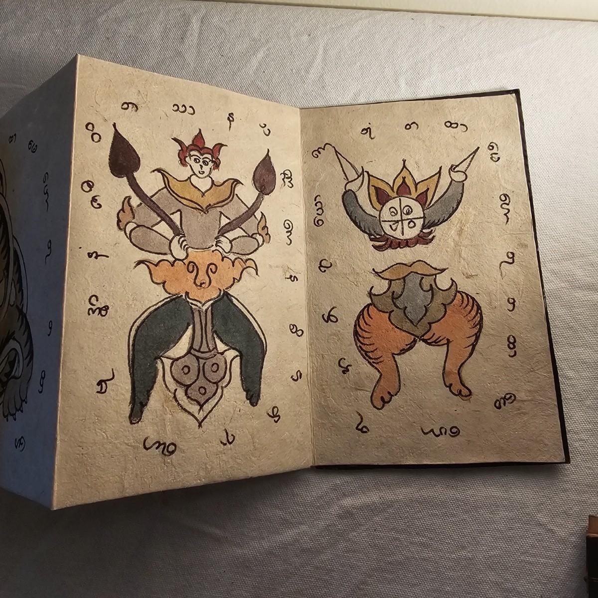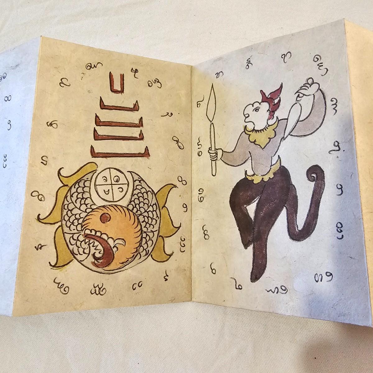 Beautiful small book with wood block prints on paper, book accordians to show images on both sides. Book is 6.75" x 48" open and 4.25" x 6.75" closed. Stylized bird and design on both outside covers. Palm leaf scroll has carved outside ends, opens to reveal a story in two different languages and a pictorial to accompany it. 11" x 14.5" open and 11" x 1.5" closed. Has two square hole vintage coins attached by cords. See photos for details. Shipping available.