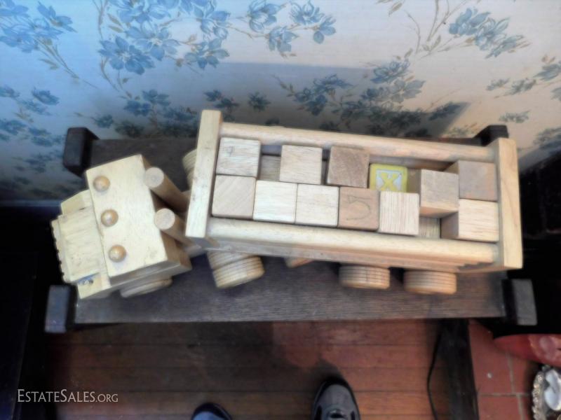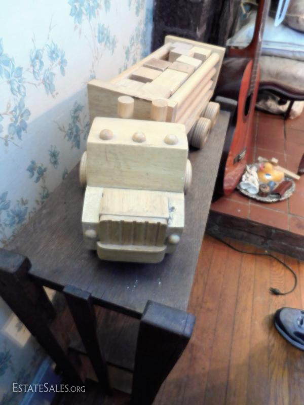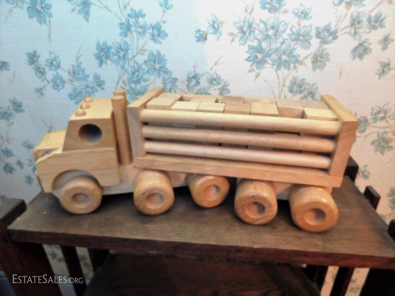 Nice wood block toy truck hauler. Two piece unit with trailer full of wood blocks. Working round wood wheels.