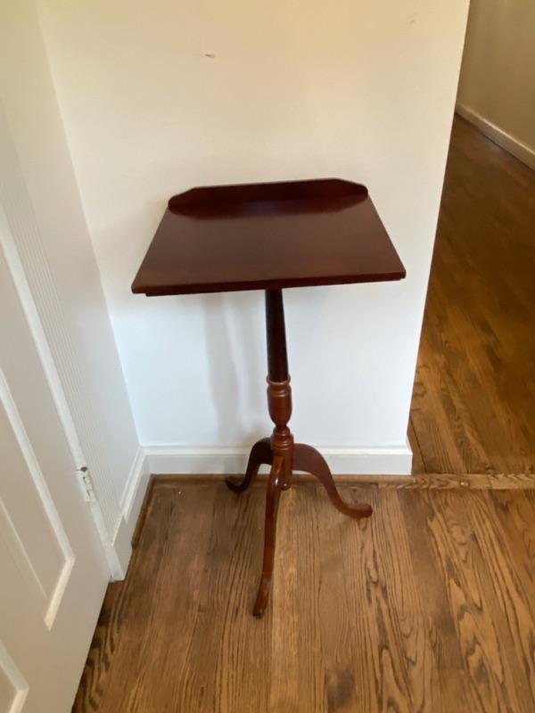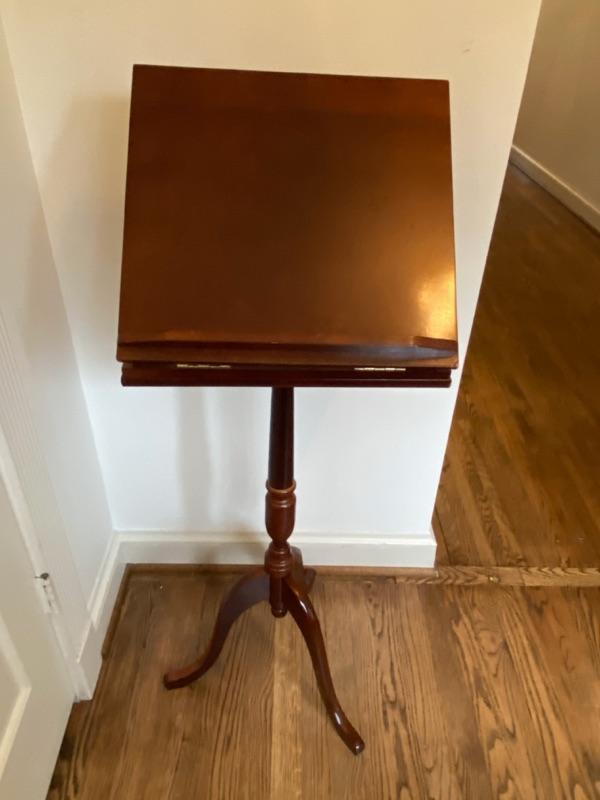 Cherry wood with gloss finish book, music, or art display stand. Height is 33 inches when closed and 43 when book platform open. Book platform is 15" X 16 ".