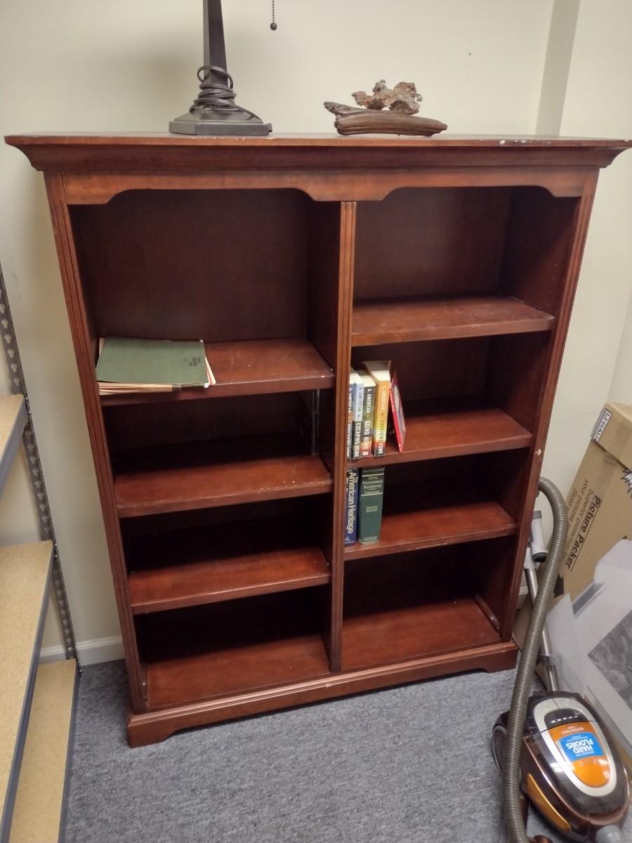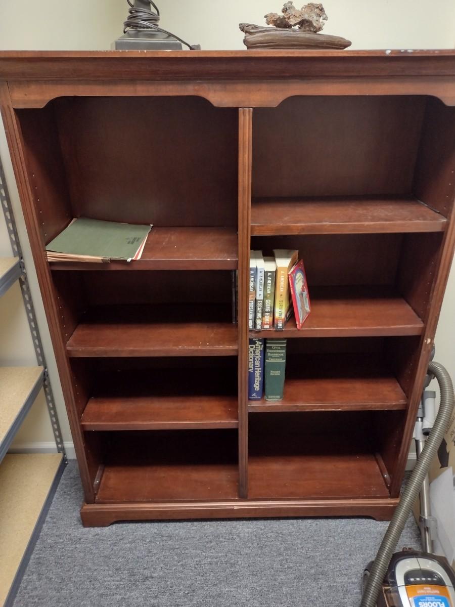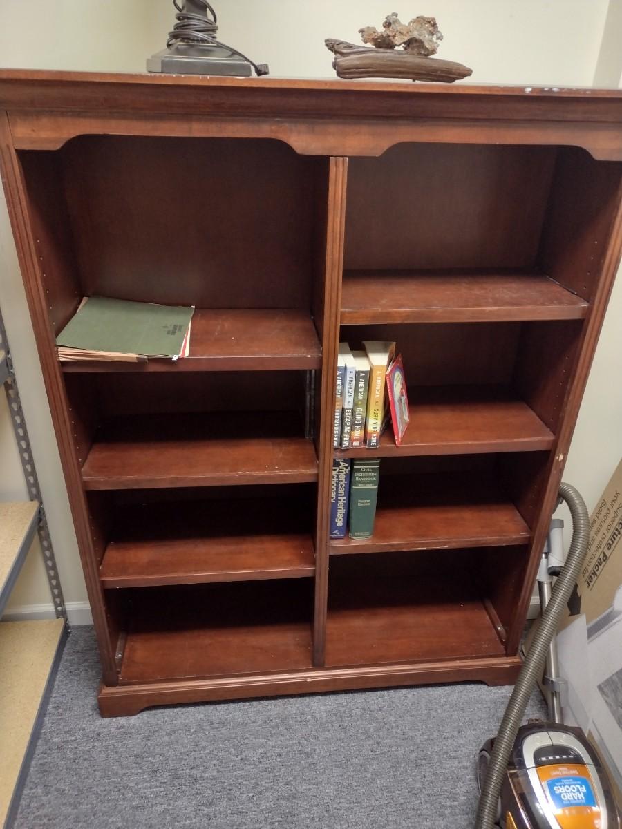 Wood Bookcase (No Contents) downstairs item. Expect some scratches and wear to the finish