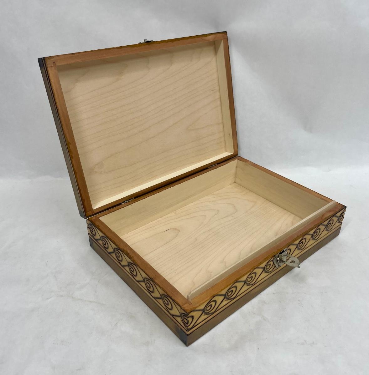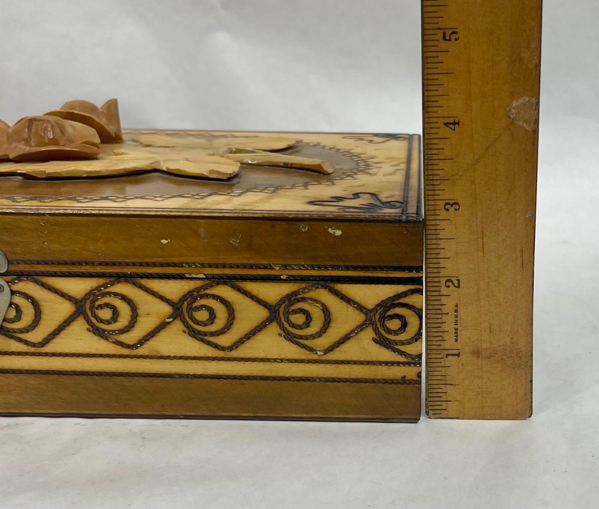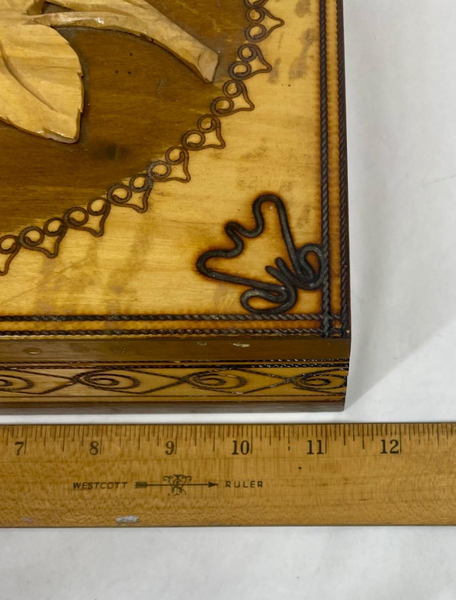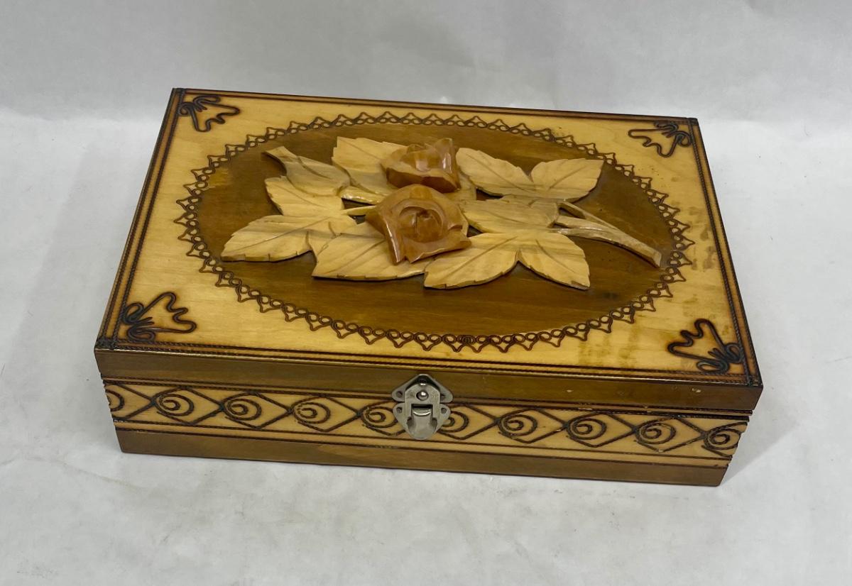 Store your little "treasures" in this pretty carved wood box. Entirely made of solid wood, with a beautiful patina and a nice carving work representing leaves and flowers of a rose, this box will quickly find its place on a coffee table or side table, Excellent, near-new condition. Approx. 11" x 8" x 3".