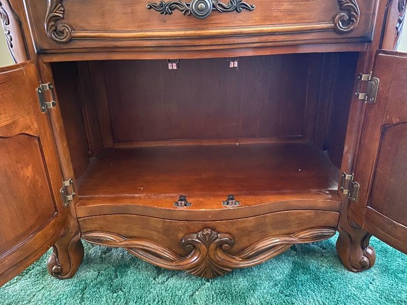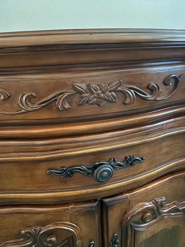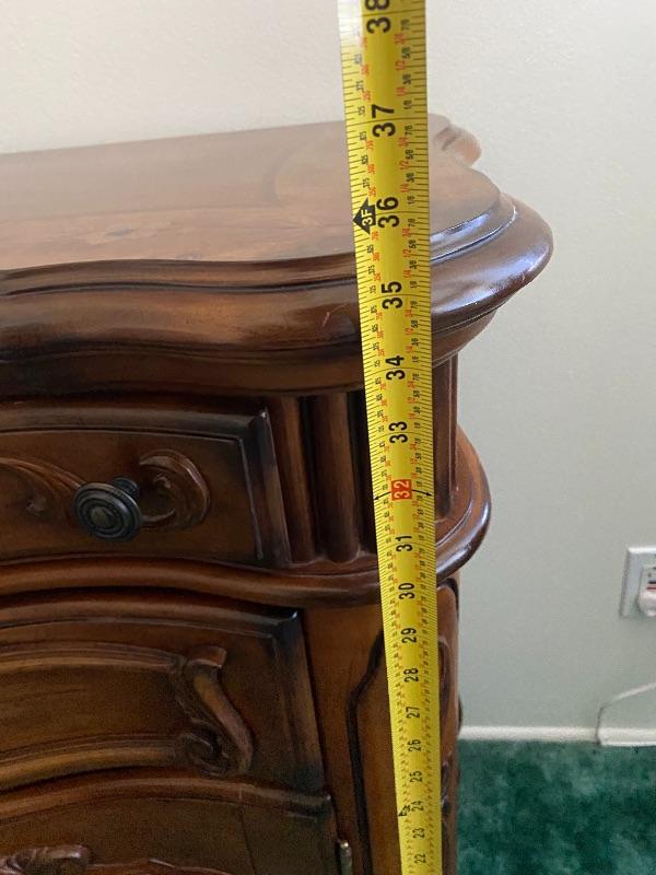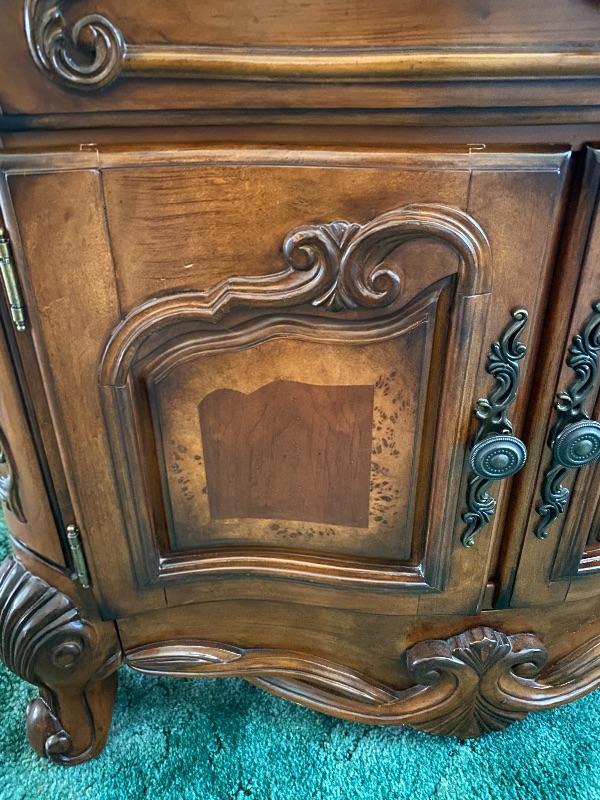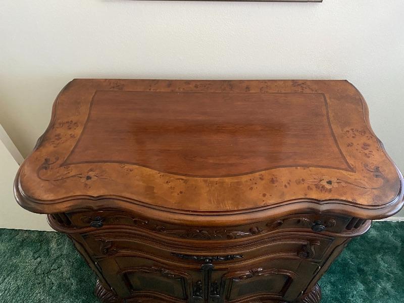Wood buffet cabinet by AICO Michael Amini. Solid wood. Has 2 felted drawers and a lower cabinet. Good condition. The top has a wonderful inlaid flower design to it. Stands almost 36", is almost 35" wide and is about 19" deep.