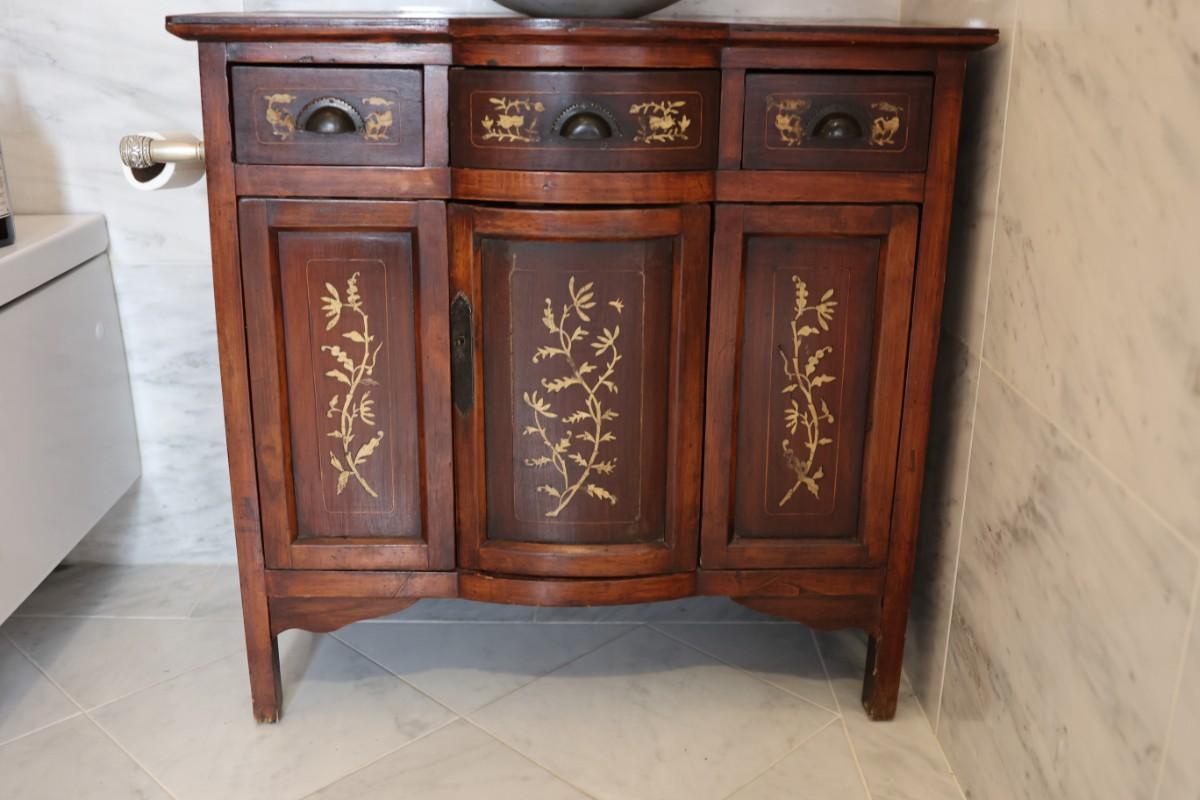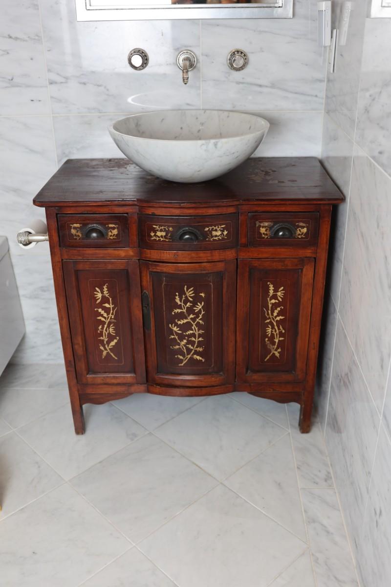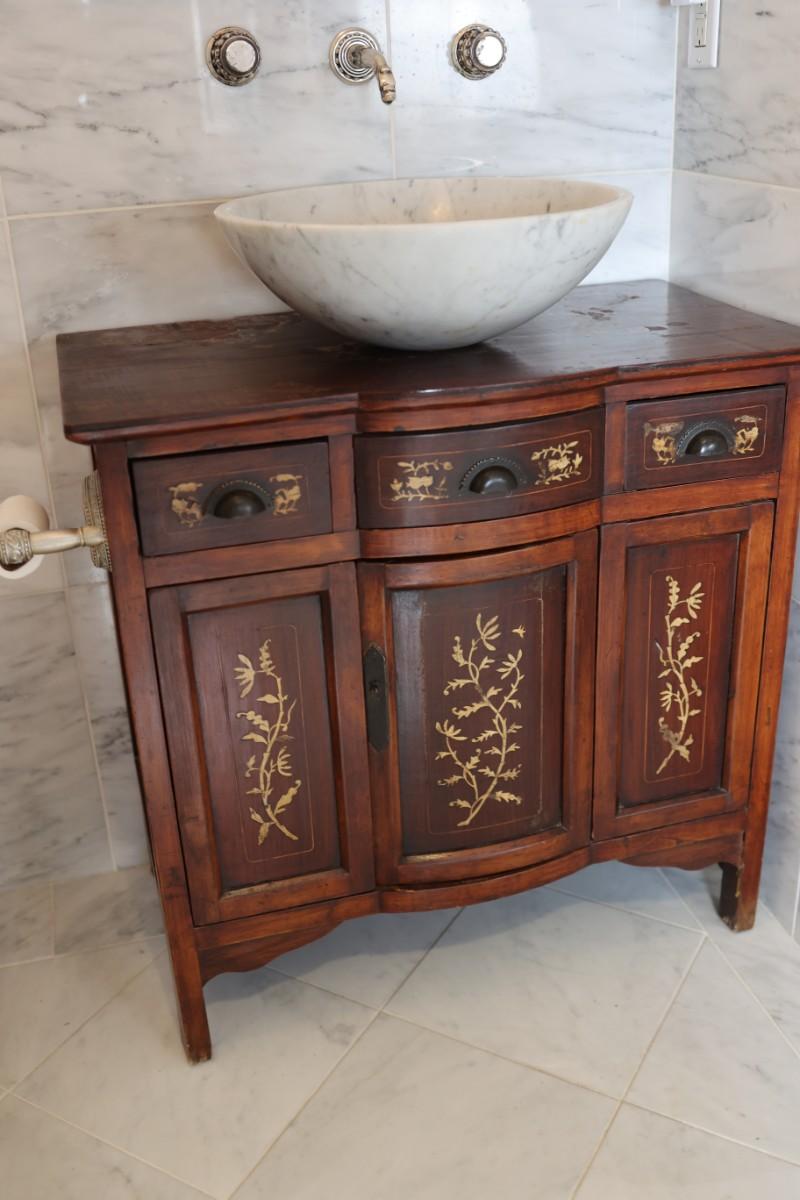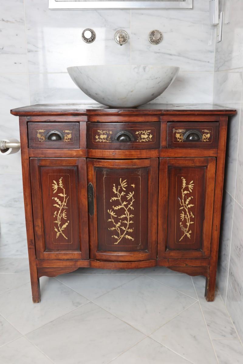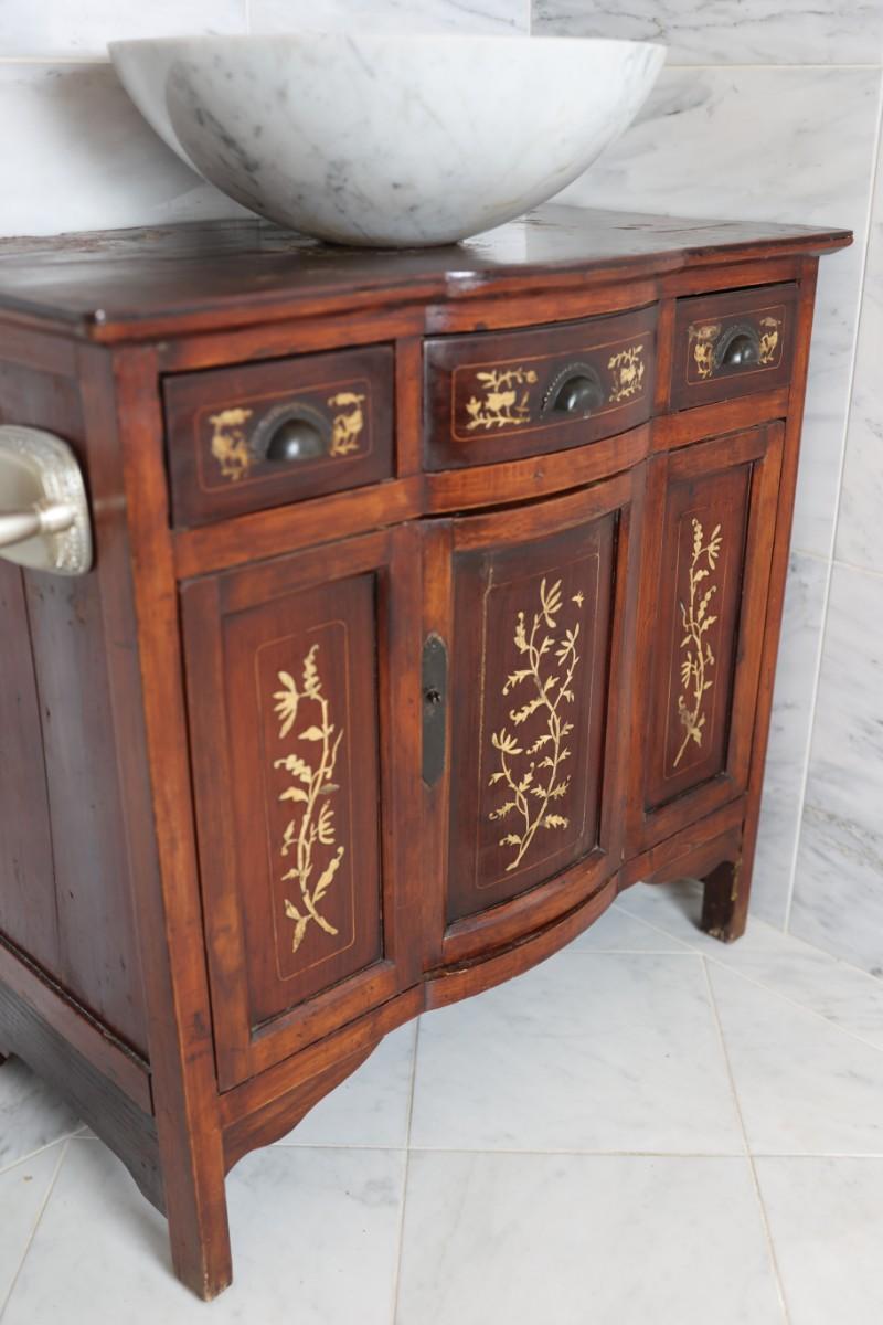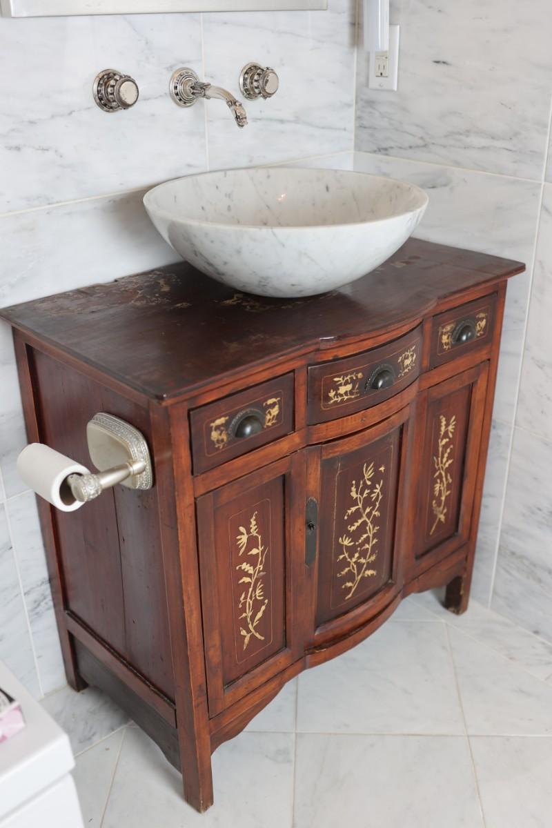 Wood Cabinet Vanity with Marble Vessel Sink and Gold Floral Detail