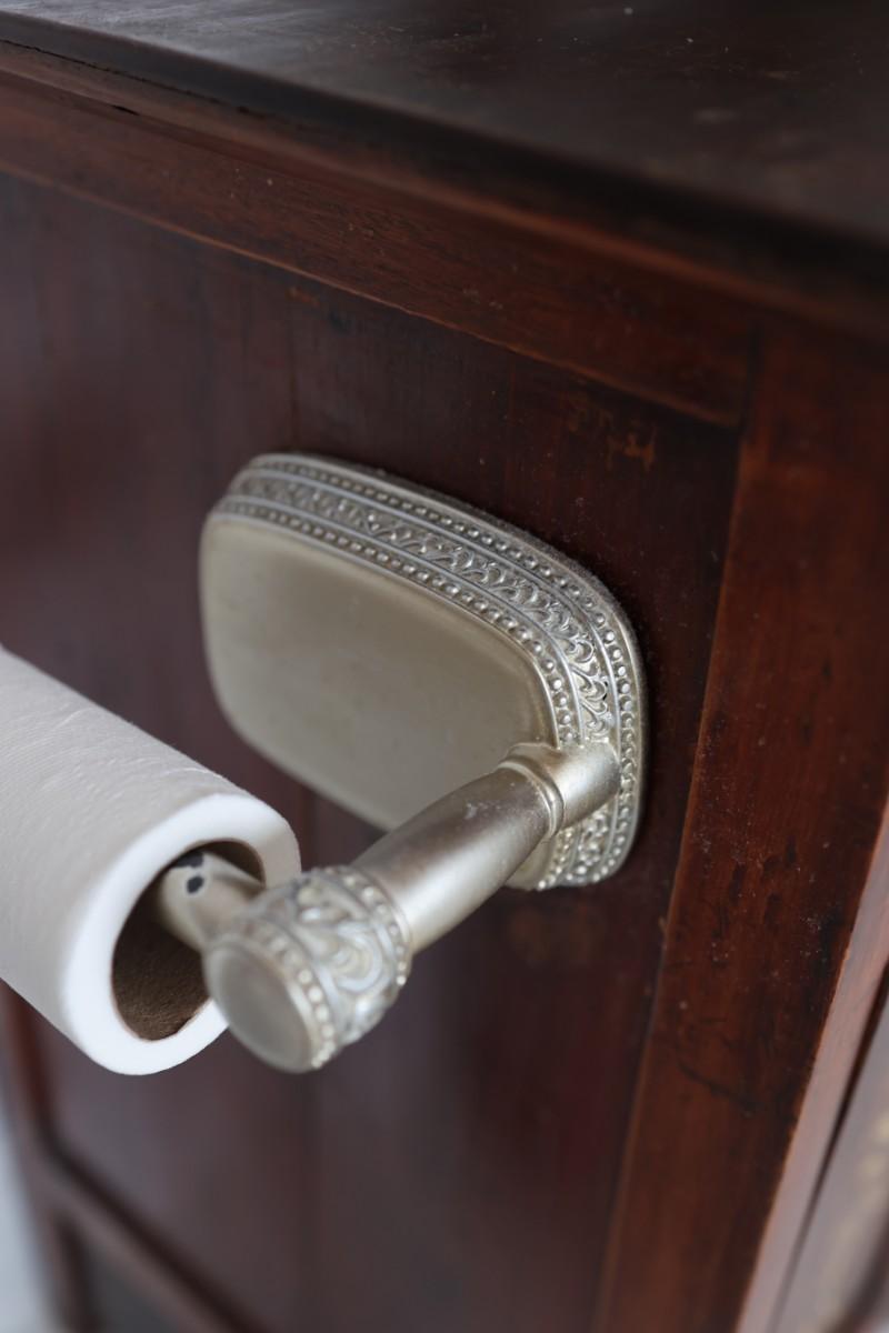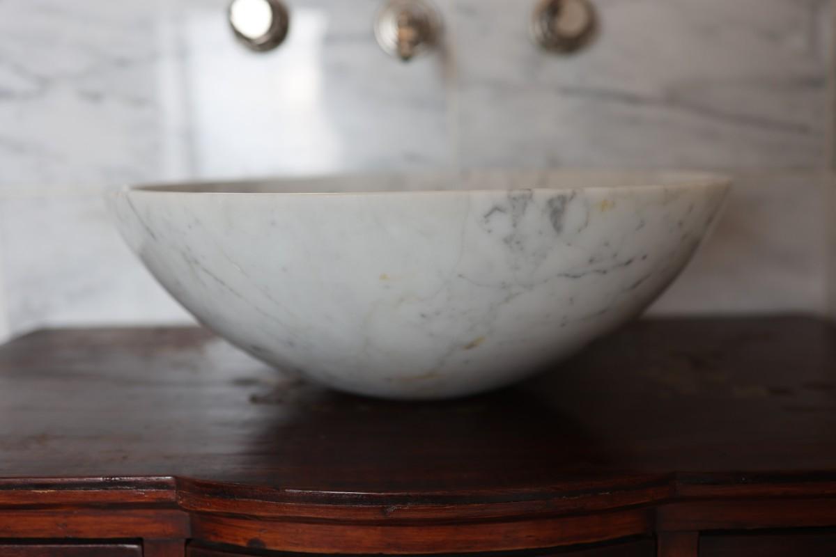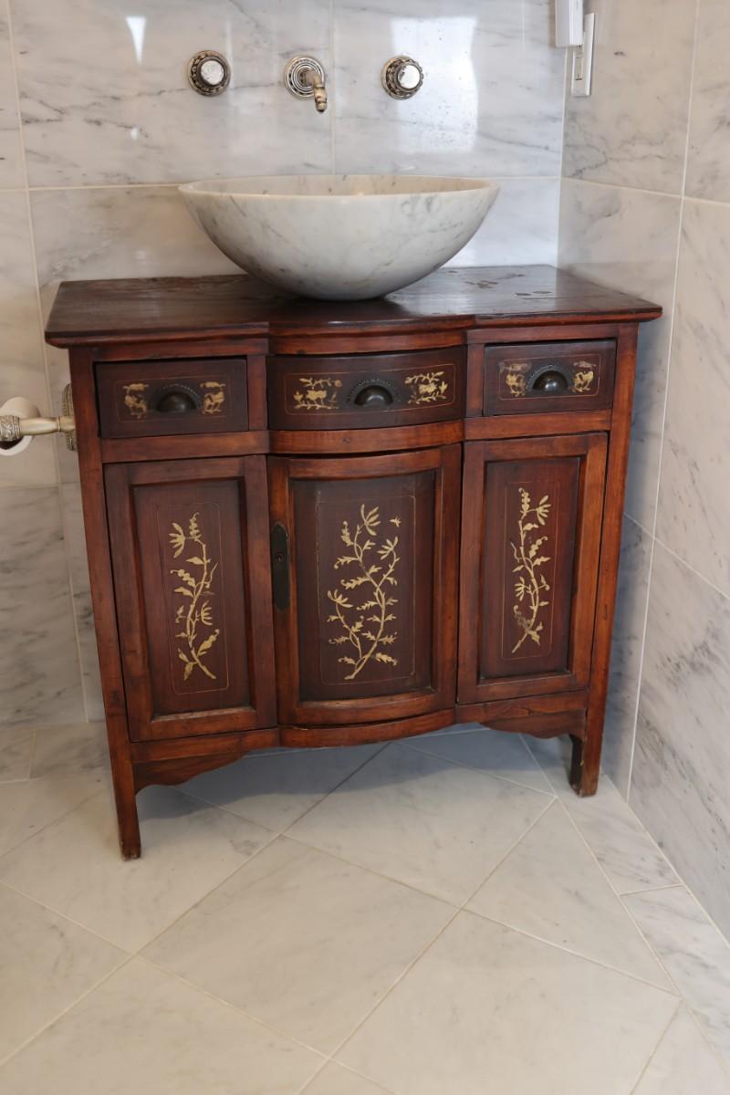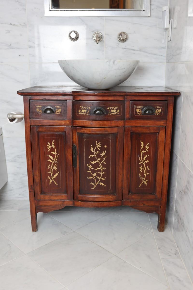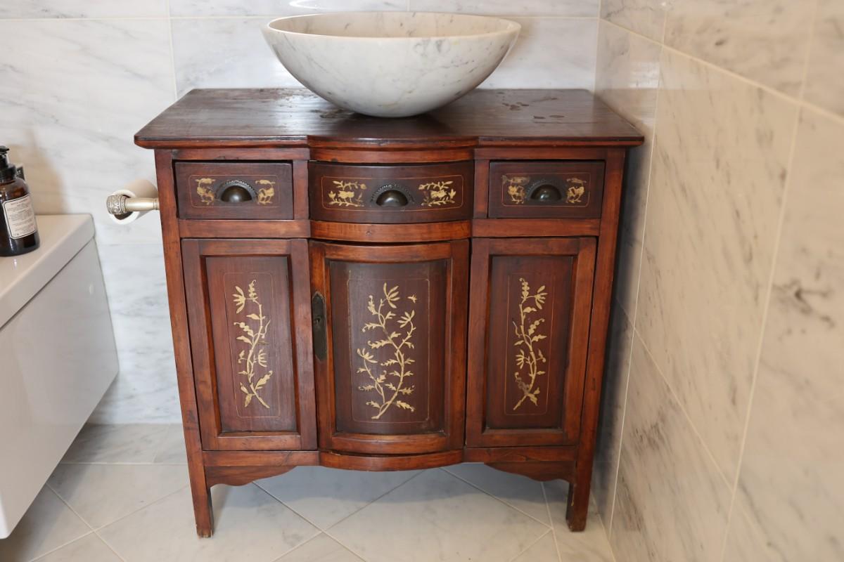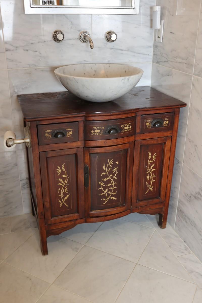 Wood Cabinet Vanity with Marble Vessel Sink and Gold Floral Detail
