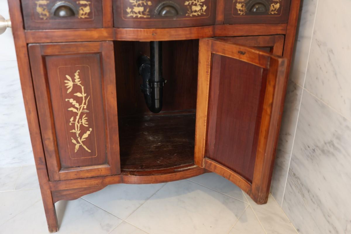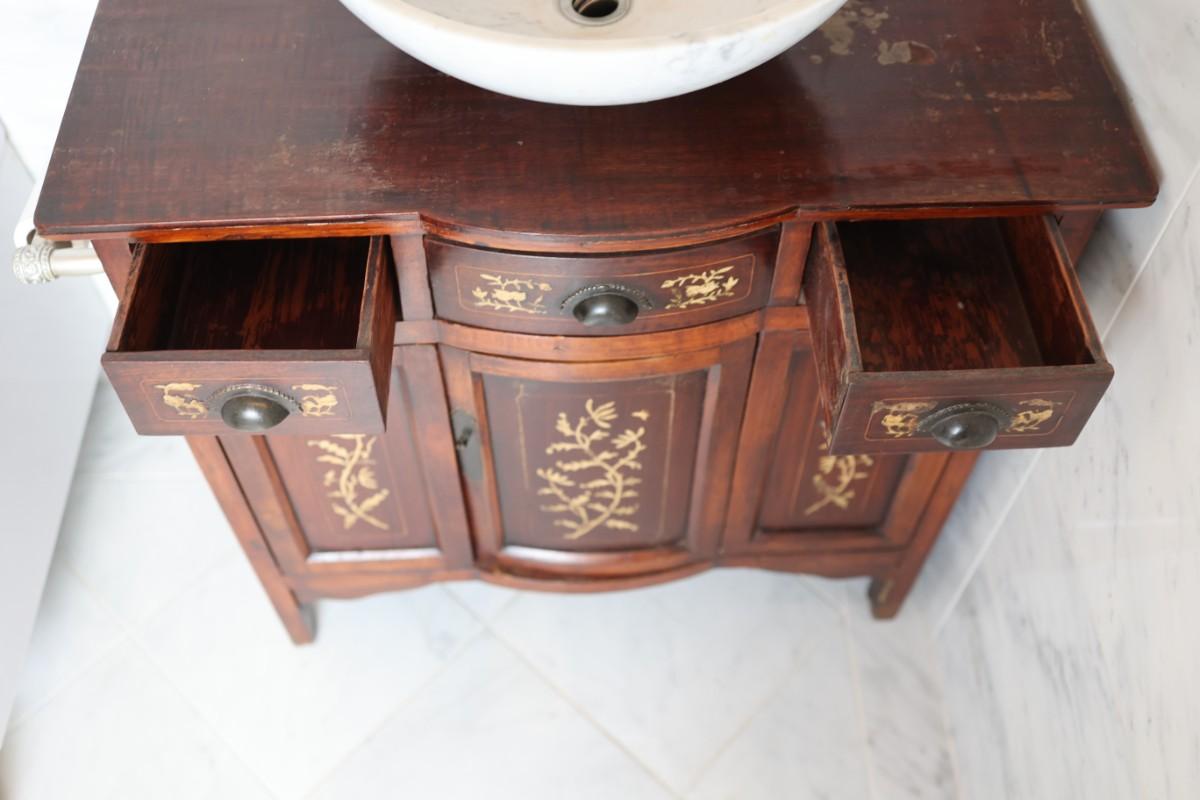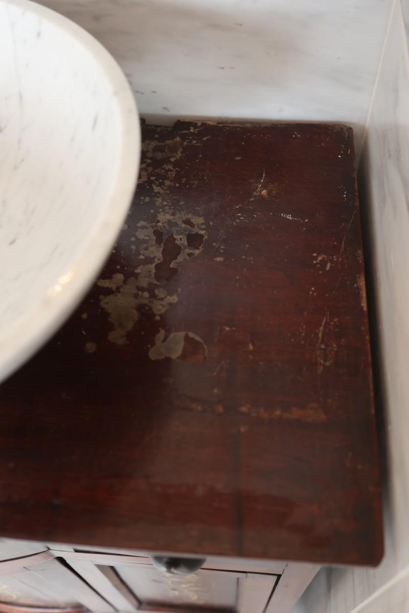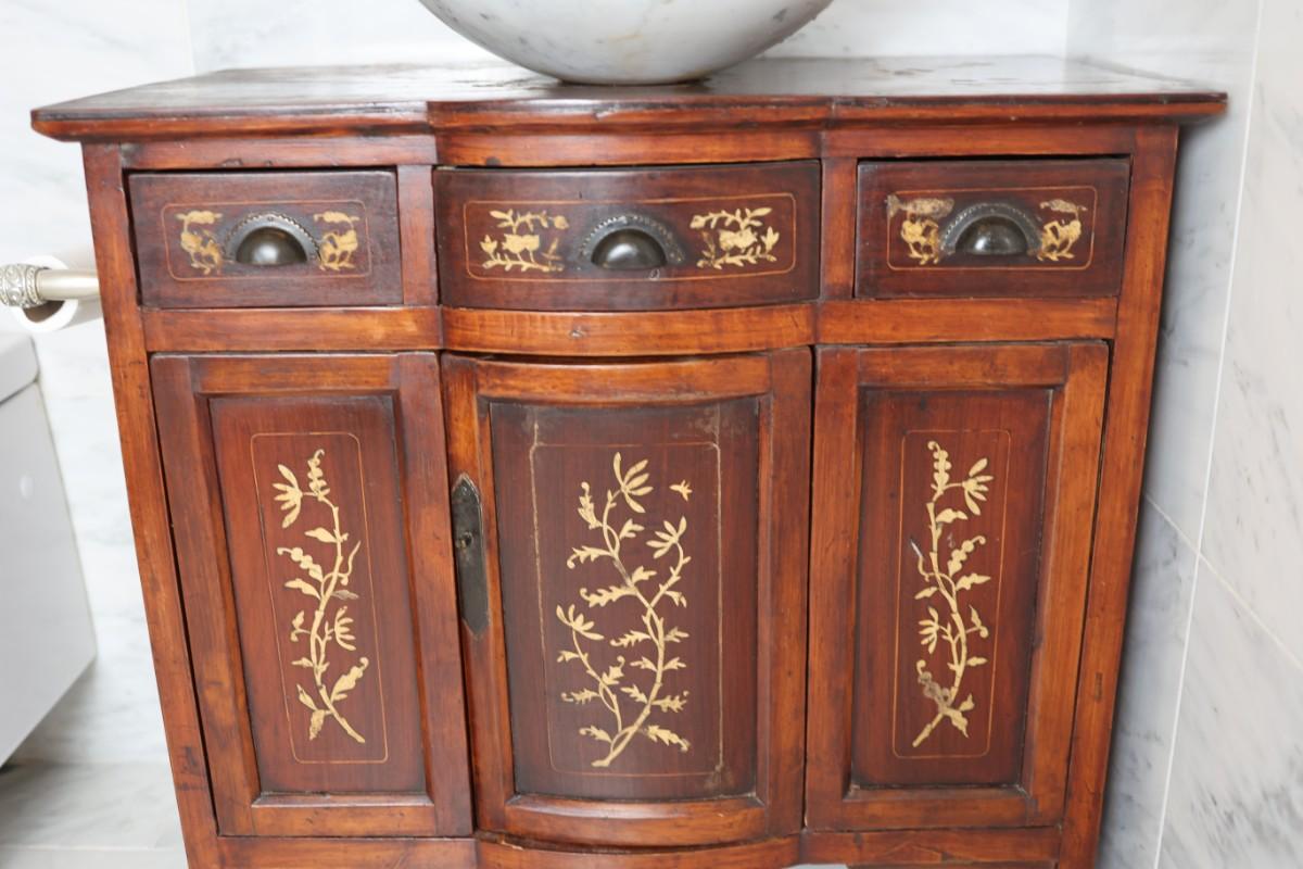 Charming wooden vanity cabinet featuring gold-painted floral panels and three drawers with round metal pulls. Topped with a round white marble vessel sink. The cabinet shows notable wear to the top surface (see photos), and the sink has discoloration around the drain. A great candidate for refinishing or repurposing. Plumbing fixtures not included; sold as-is.