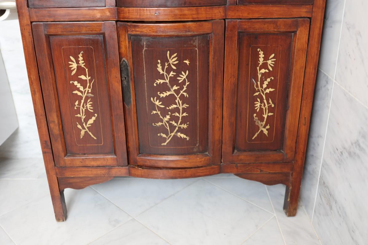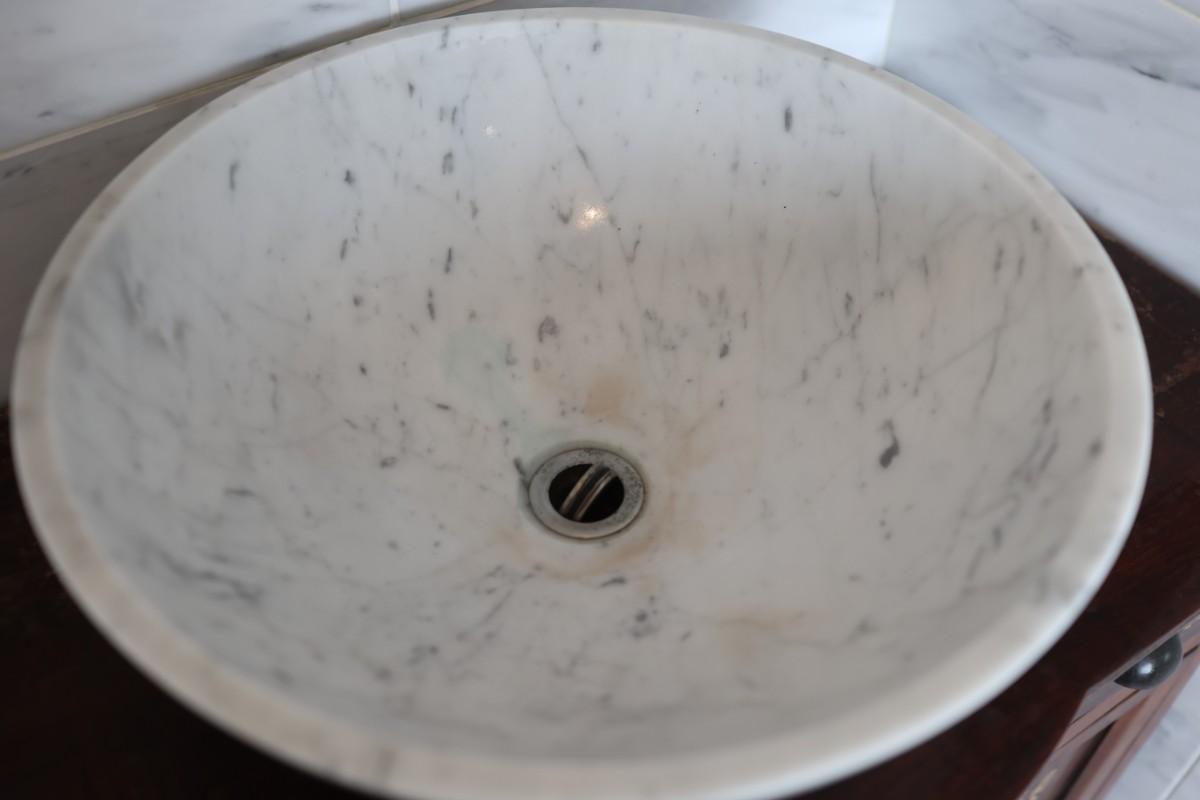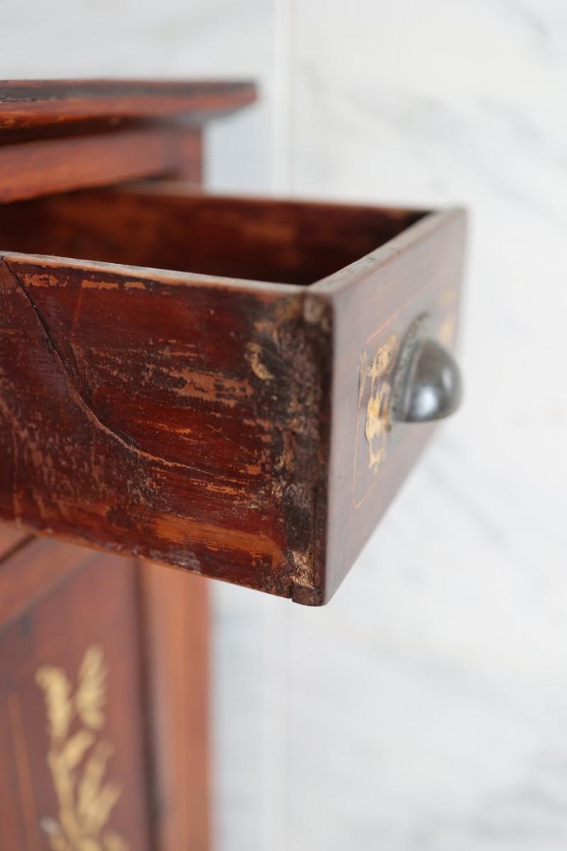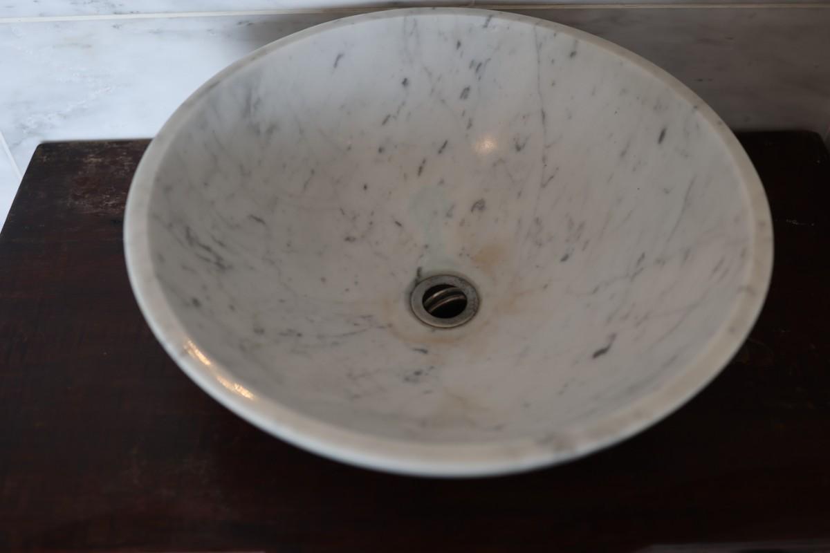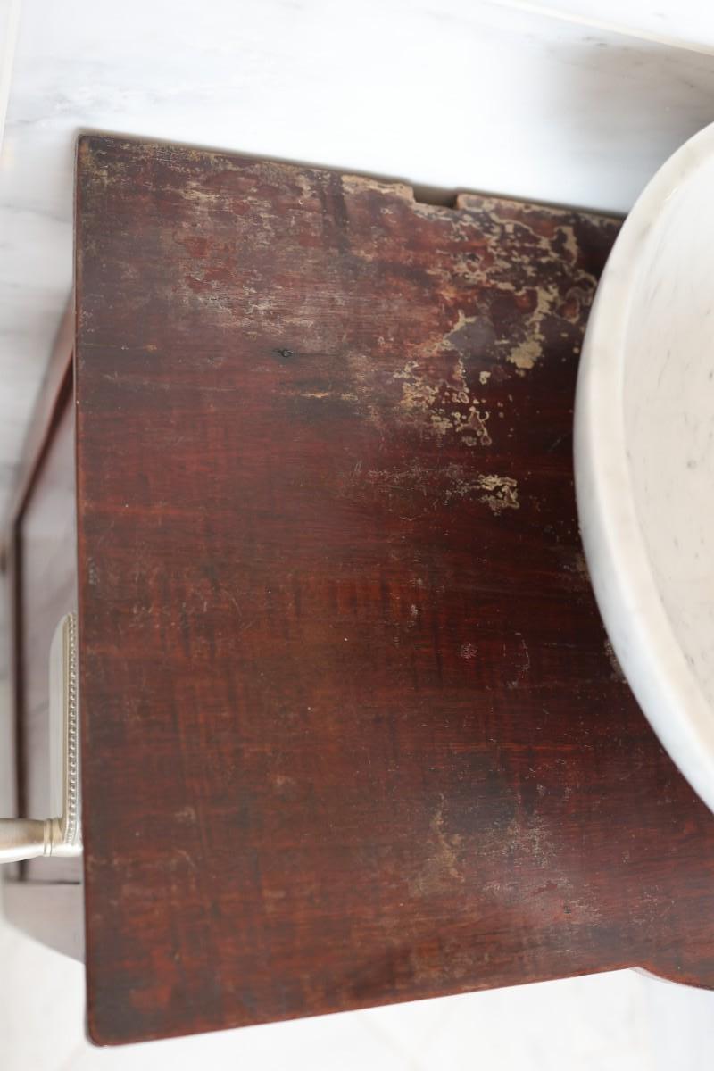 Charming wooden vanity cabinet featuring gold-painted floral panels and three drawers with round metal pulls. Topped with a round white marble vessel sink. The cabinet shows notable wear to the top surface (see photos), and the sink has discoloration around the drain. A great candidate for refinishing or repurposing. Plumbing fixtures not included; sold as-is.