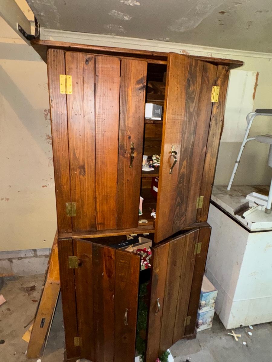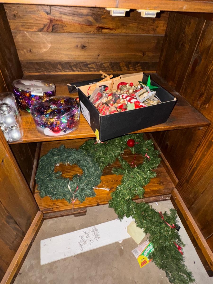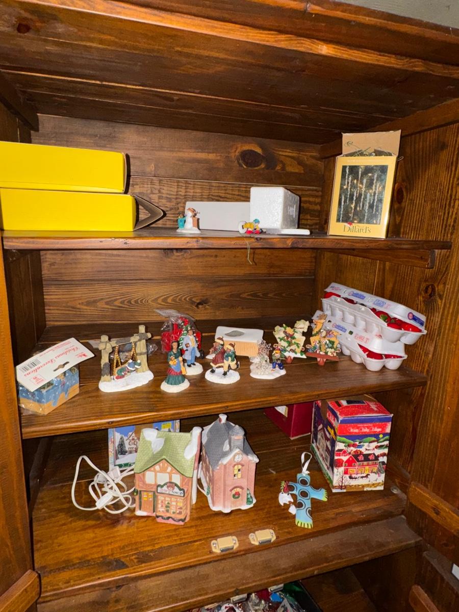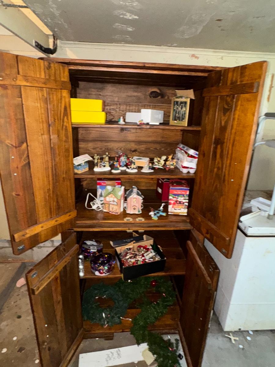 WOOD CABINET WITH CHRISTMAS CONTENTS