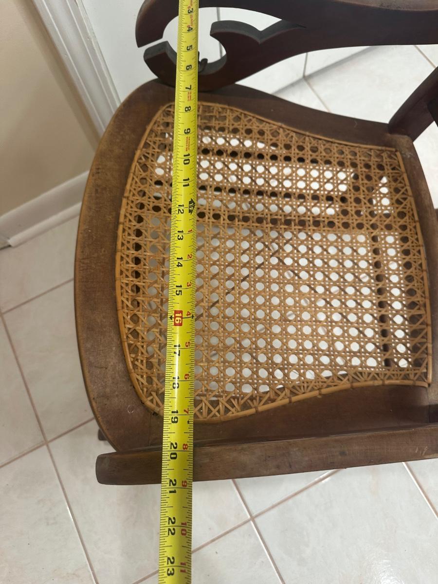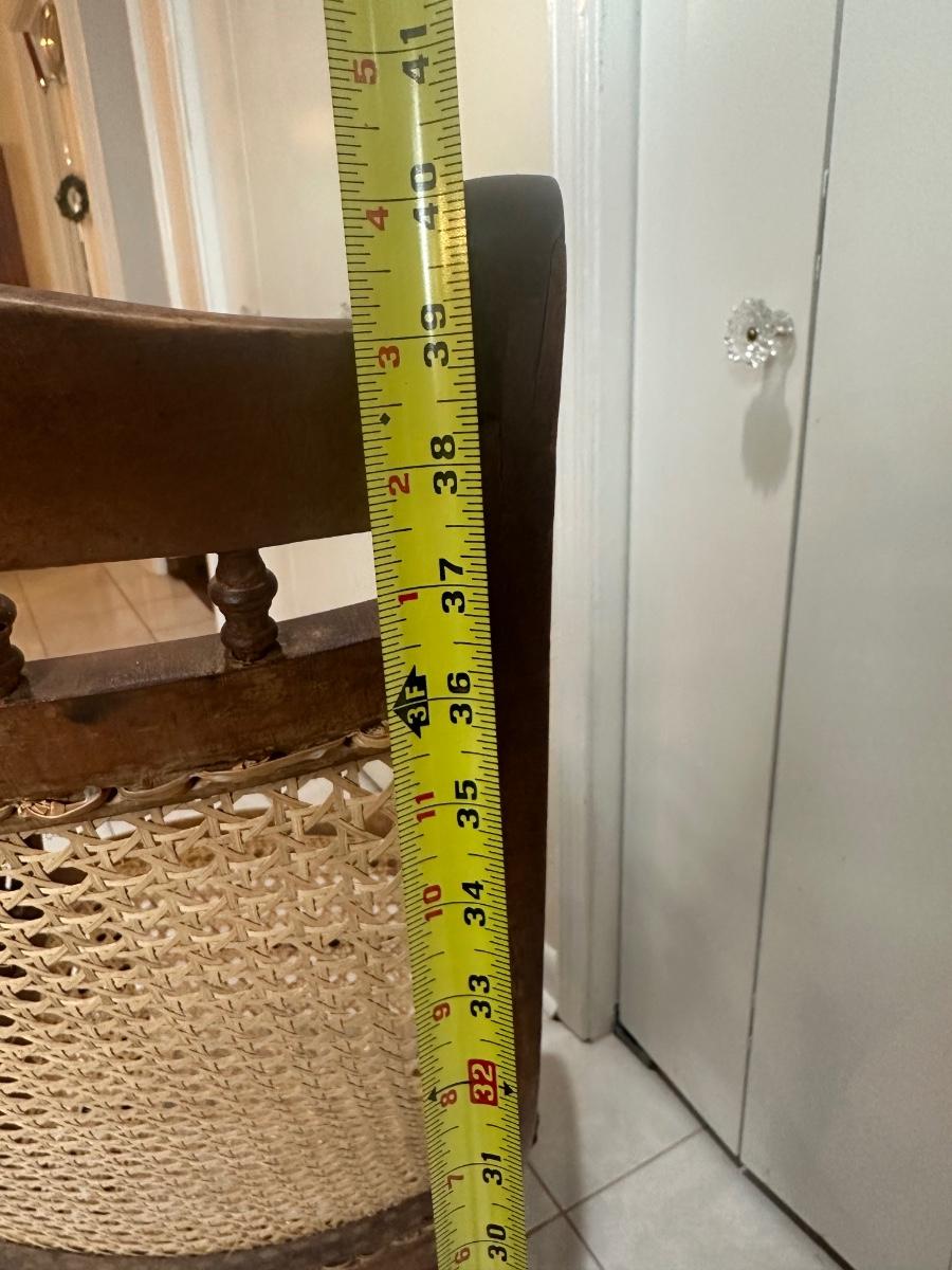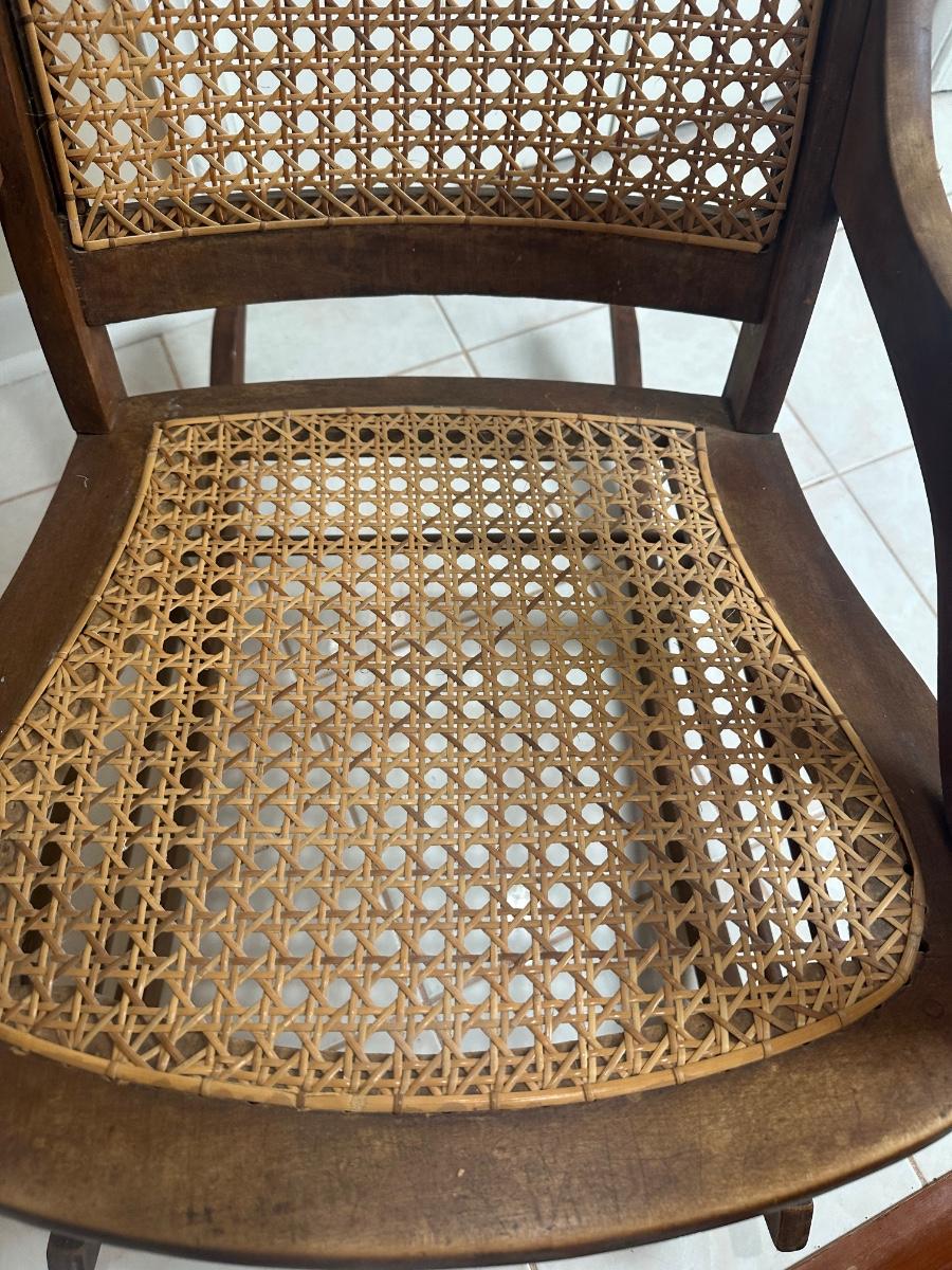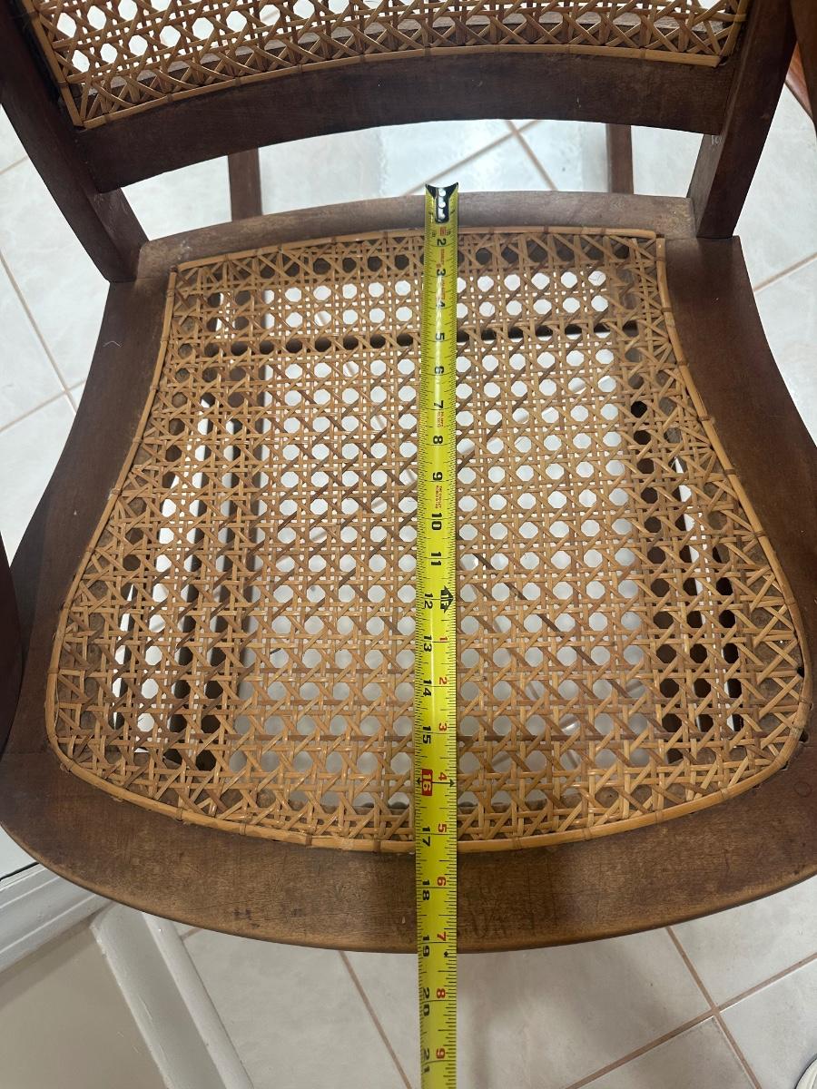 Cane seat and back appear intact and supportive and appear newer than the frame. Visible surface wear consistent with age and use, including wood loss to the arms.