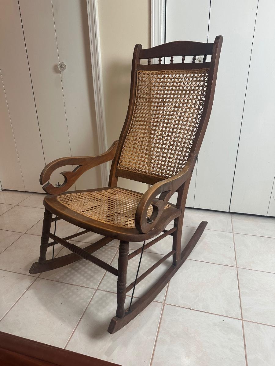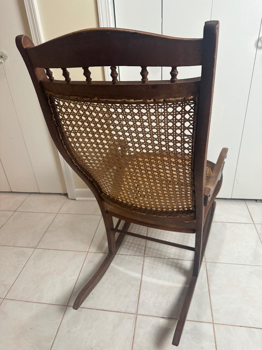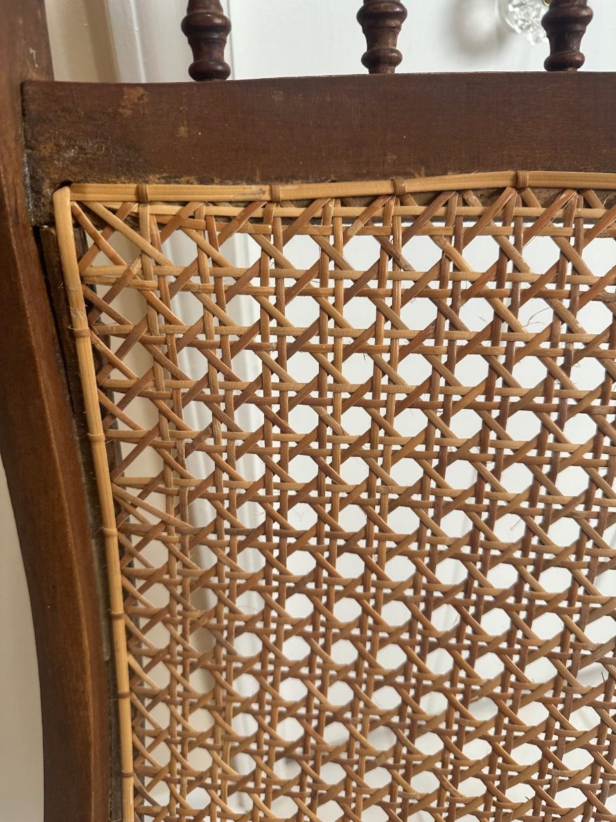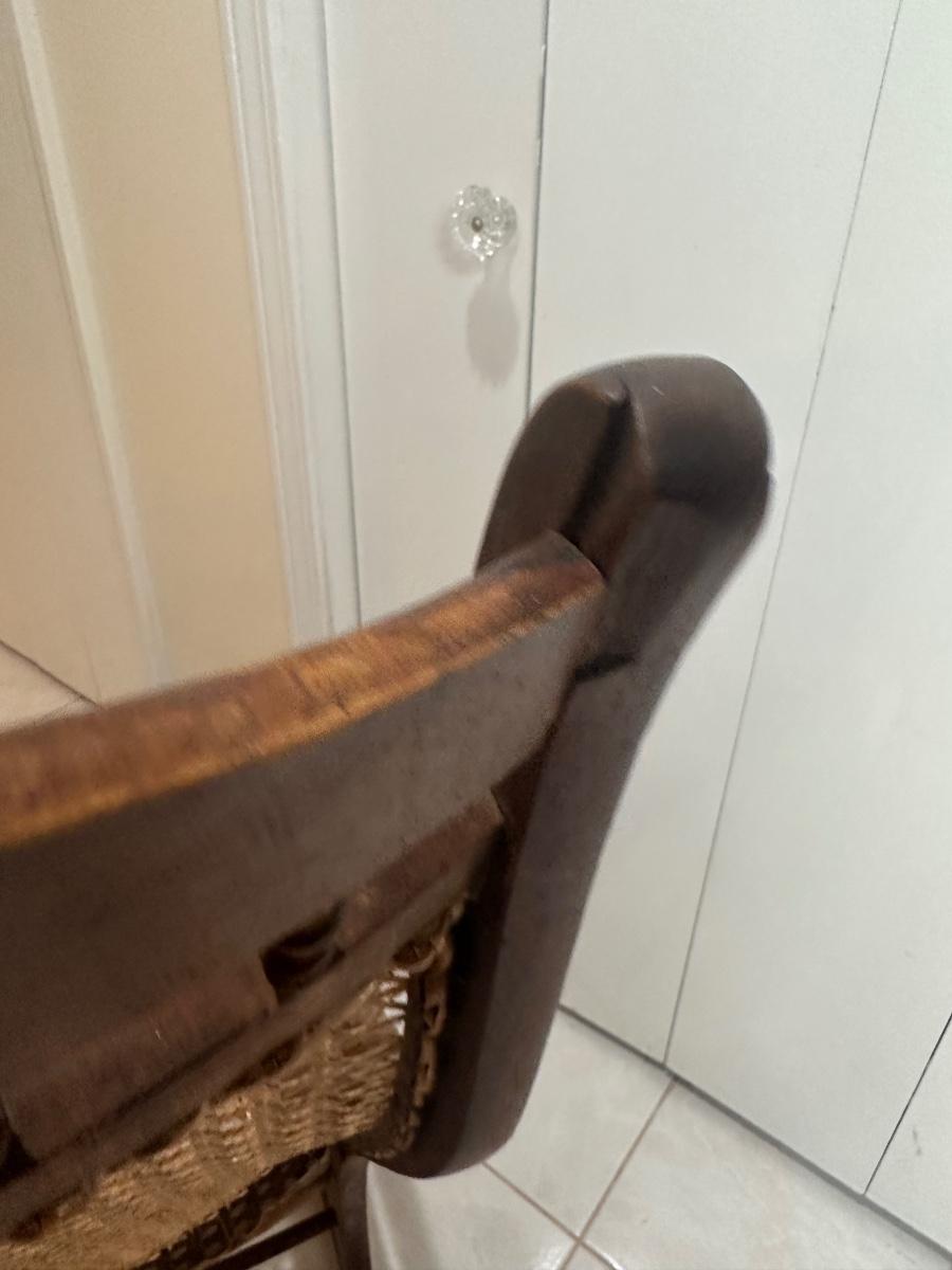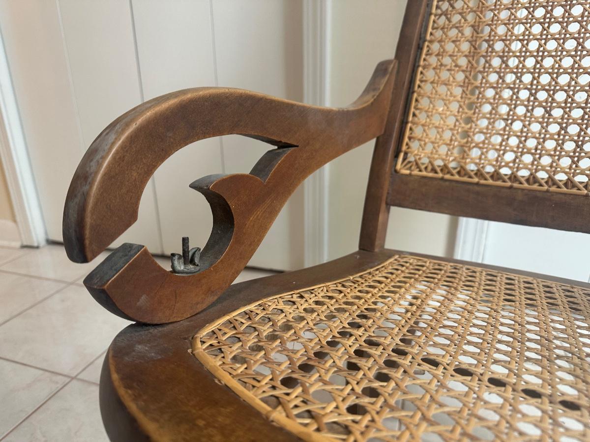 Cane seat and back appear intact and supportive and appear newer than the frame. Visible surface wear consistent with age and use, including wood loss to the arms.