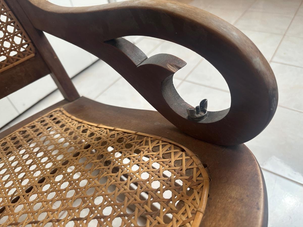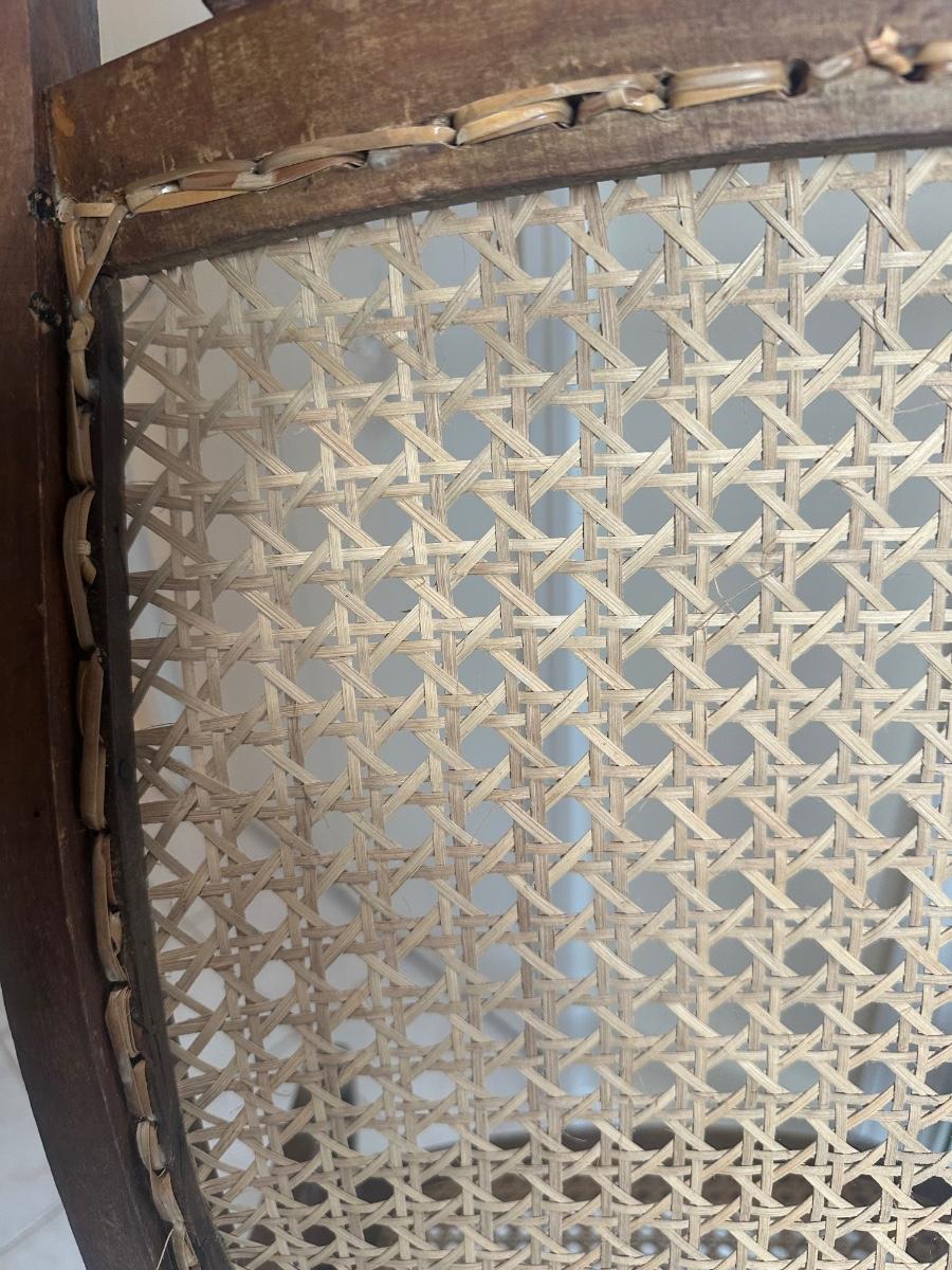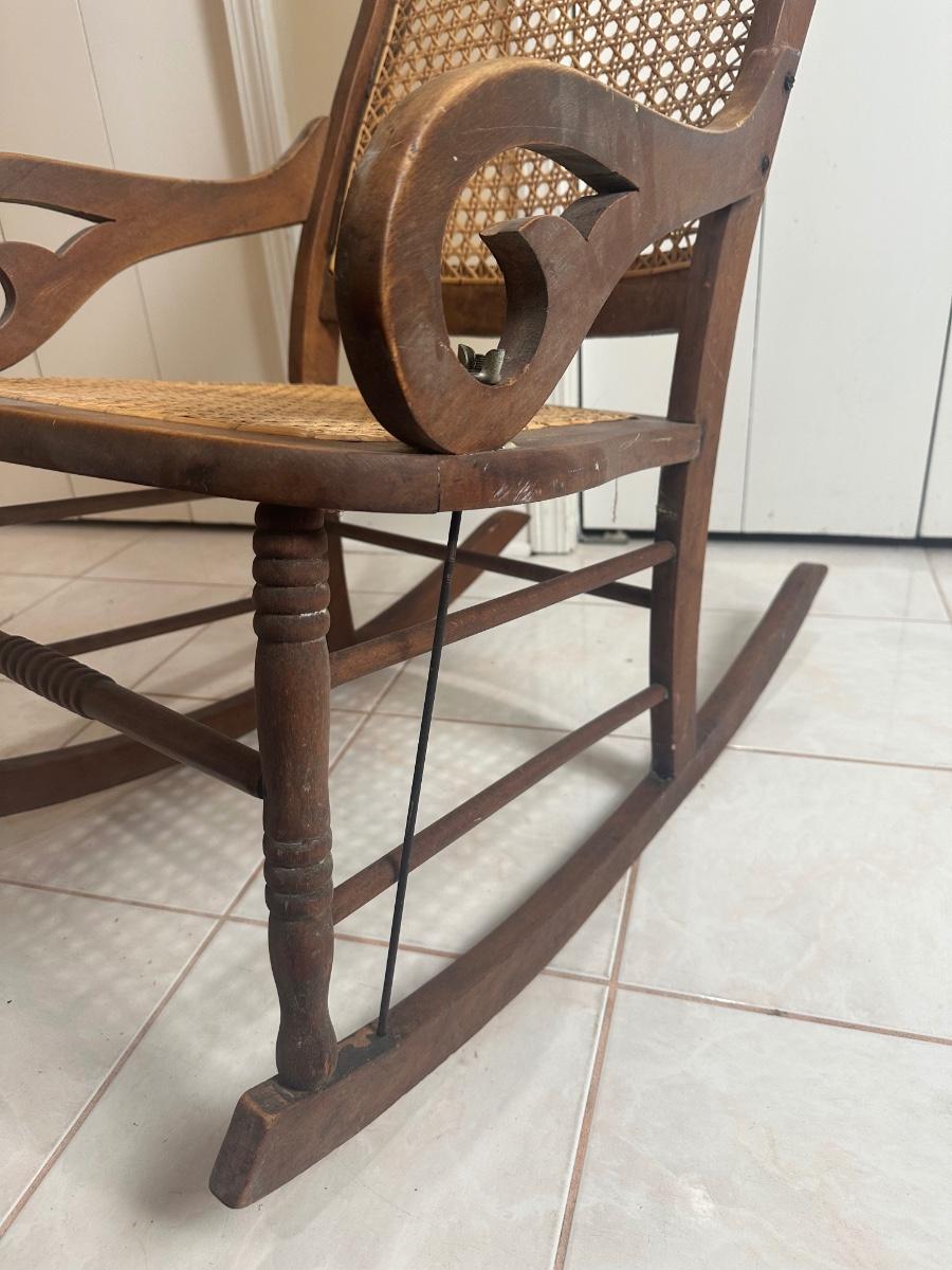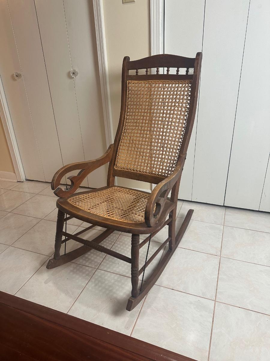 Cane seat and back appear intact and supportive and appear newer than the frame. Visible surface wear consistent with age and use, including wood loss to the arms.