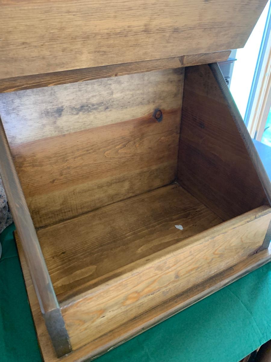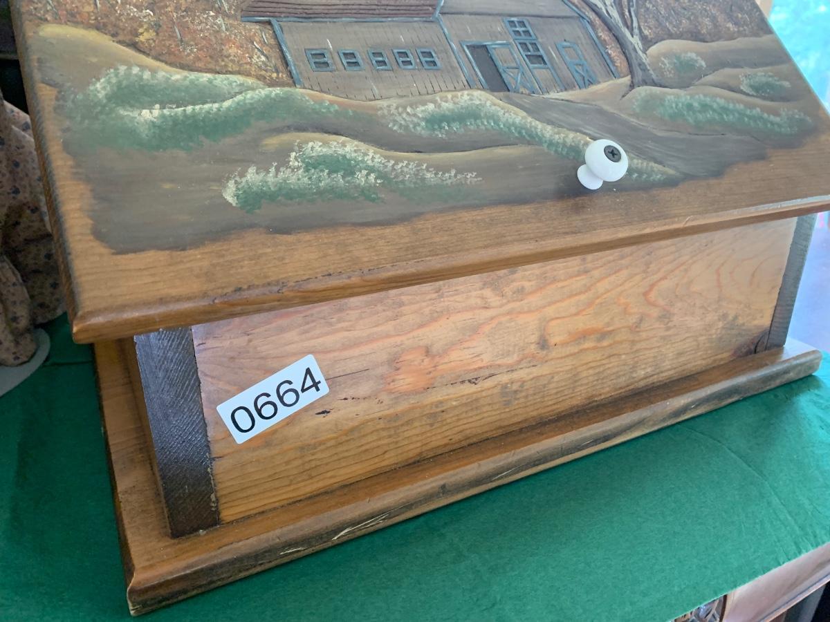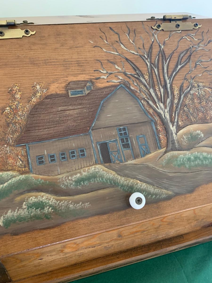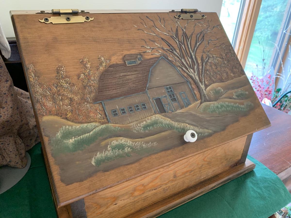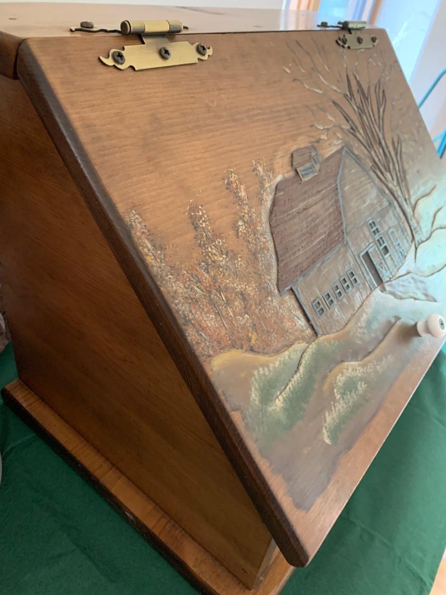 Wood Carved Bread Box Country Scene Embossed