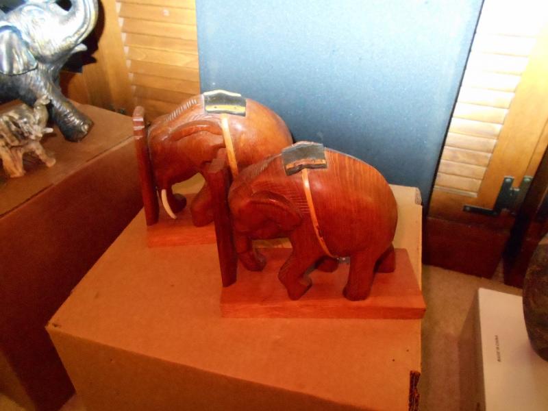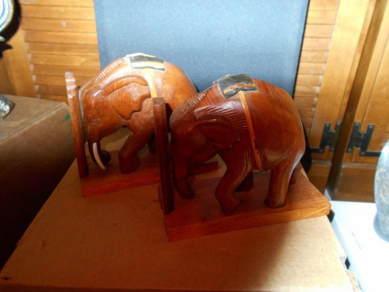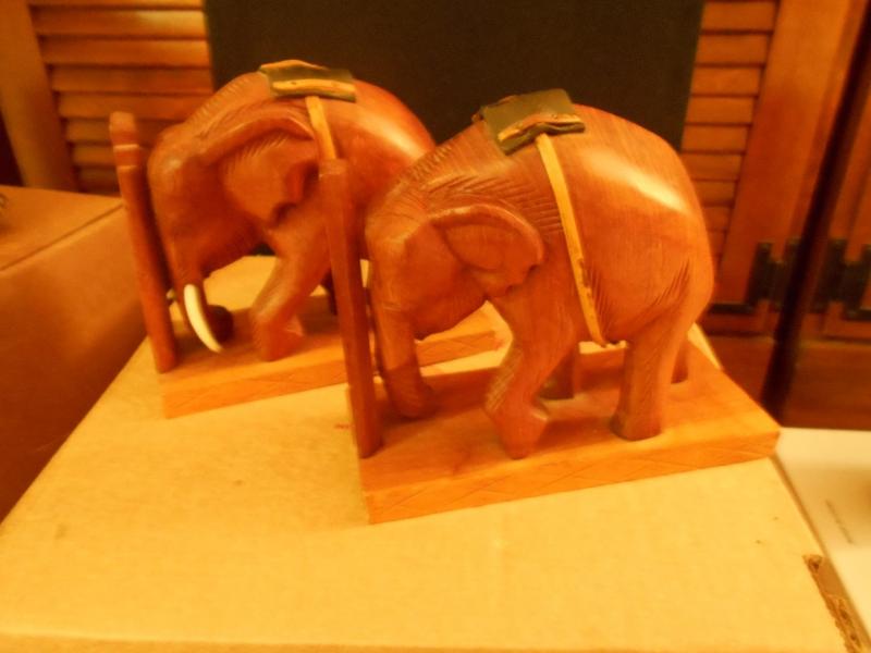 Wood Carved Elephant Book Ends with on elephant missing a tusk piece