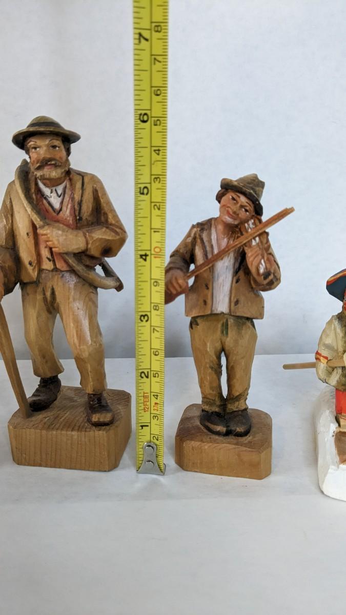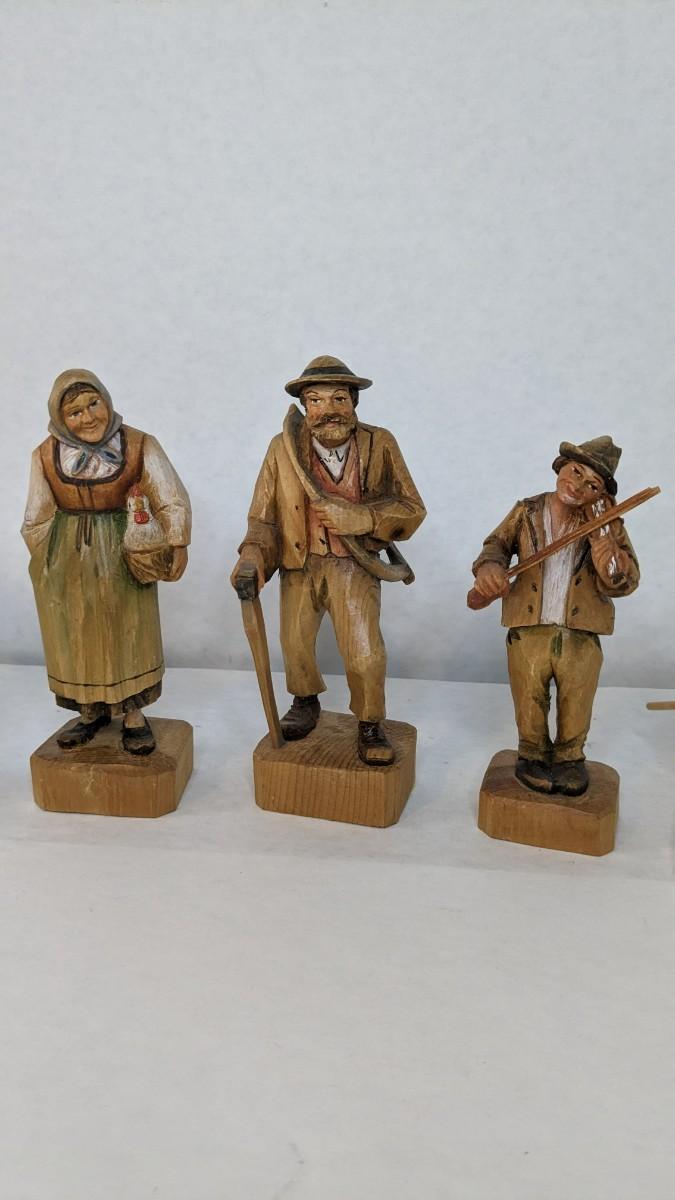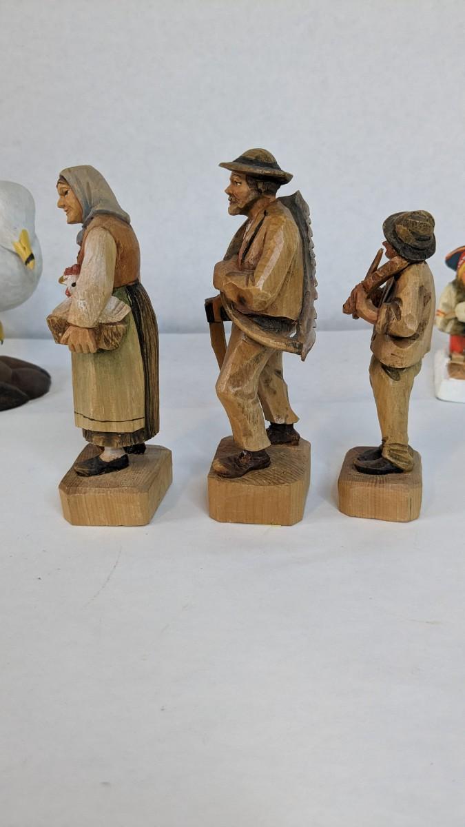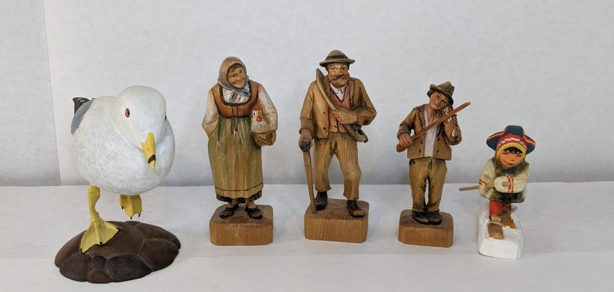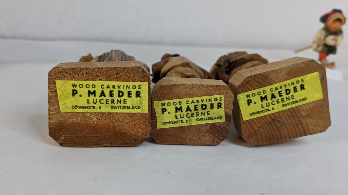 Includes three P. Maeder Lucerne wood carvings from Switzerland, a piece from Henning, Norway, and a beautifully crafted wood gull by Larry A. Witt. All pieces are in beautiful condition for age with no broken or missing parts noted and are just really neat