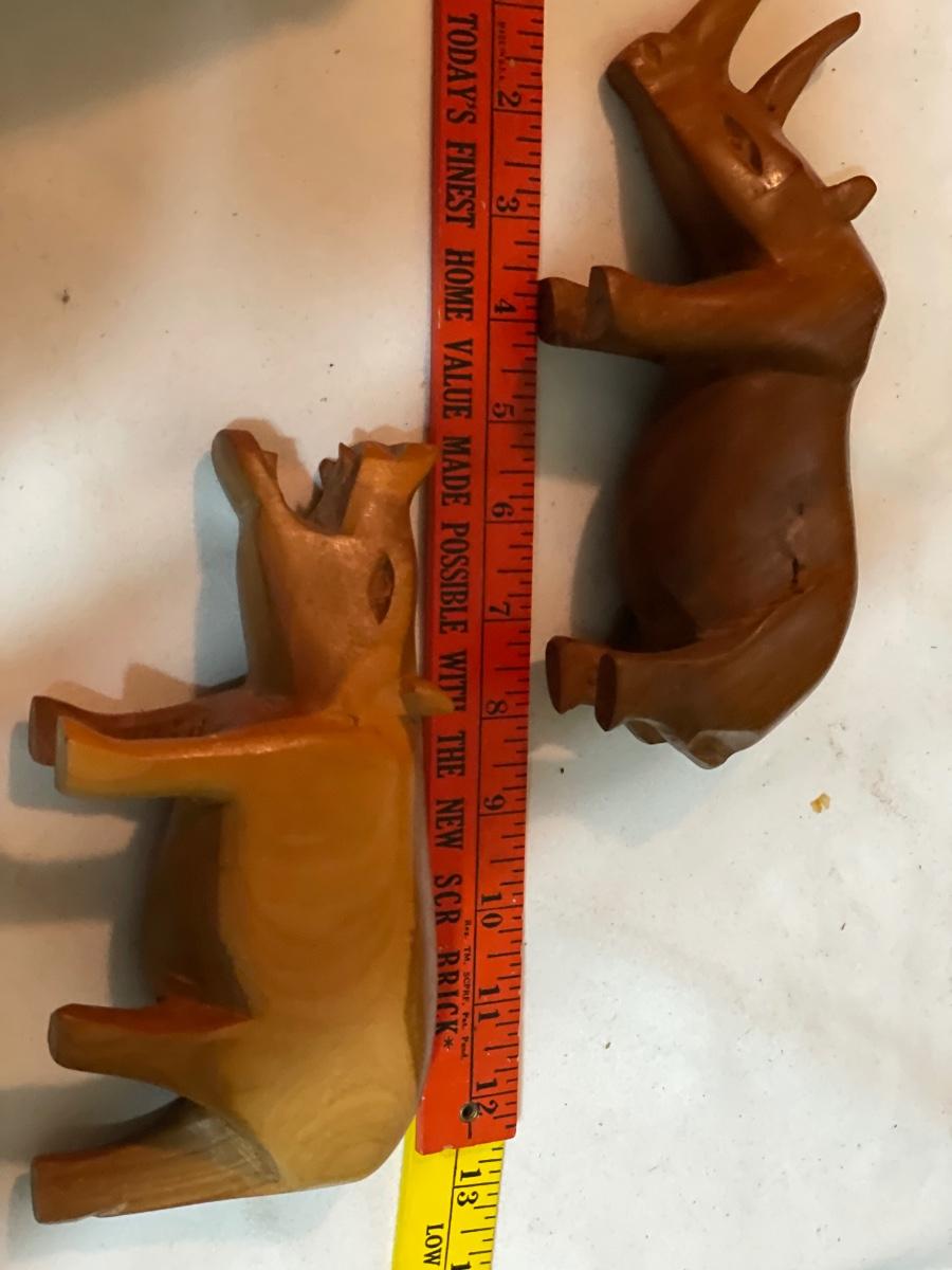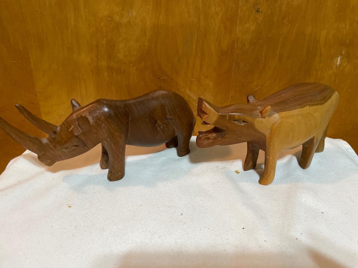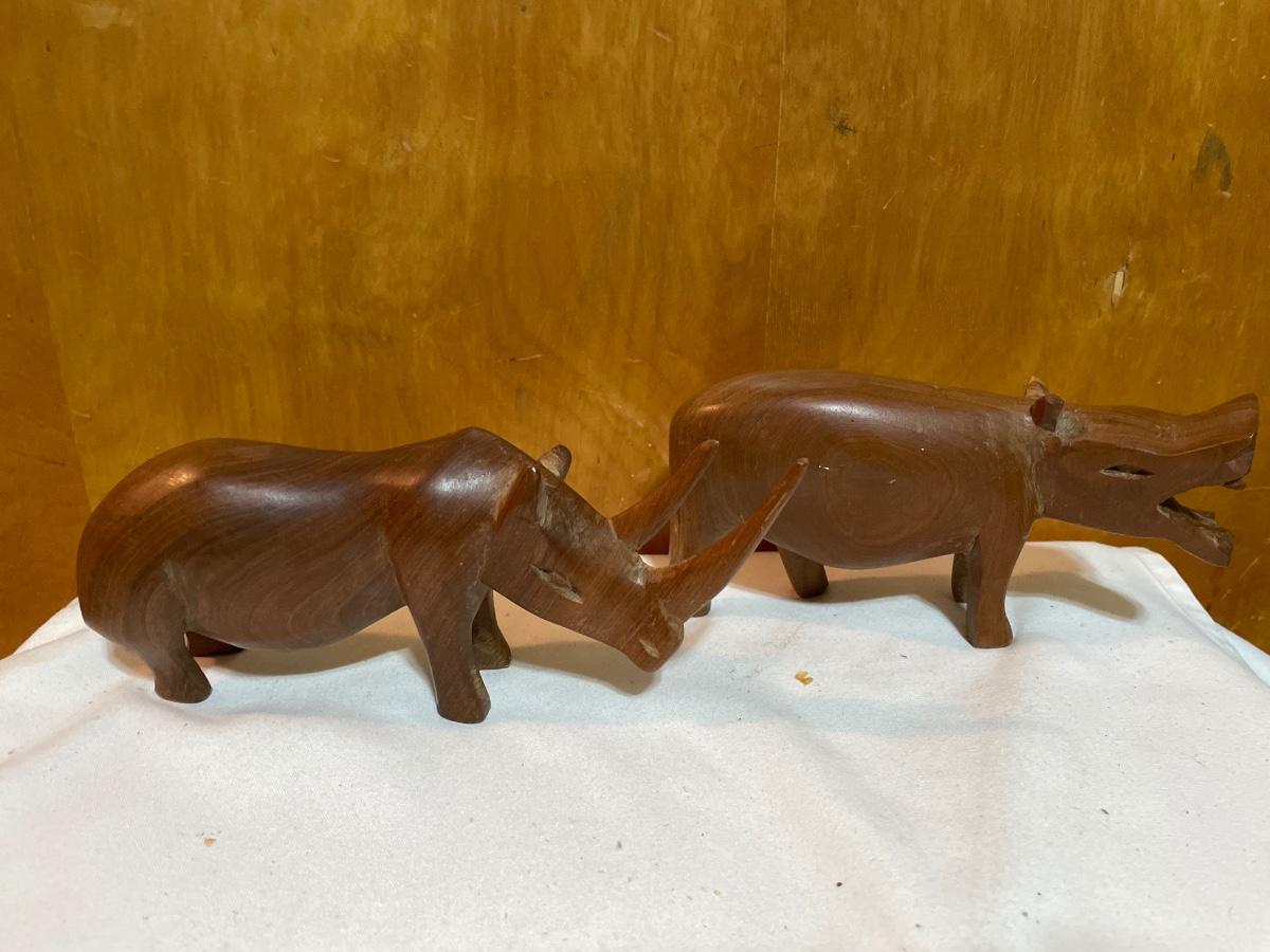 Vintage wood carved rhino and hippo