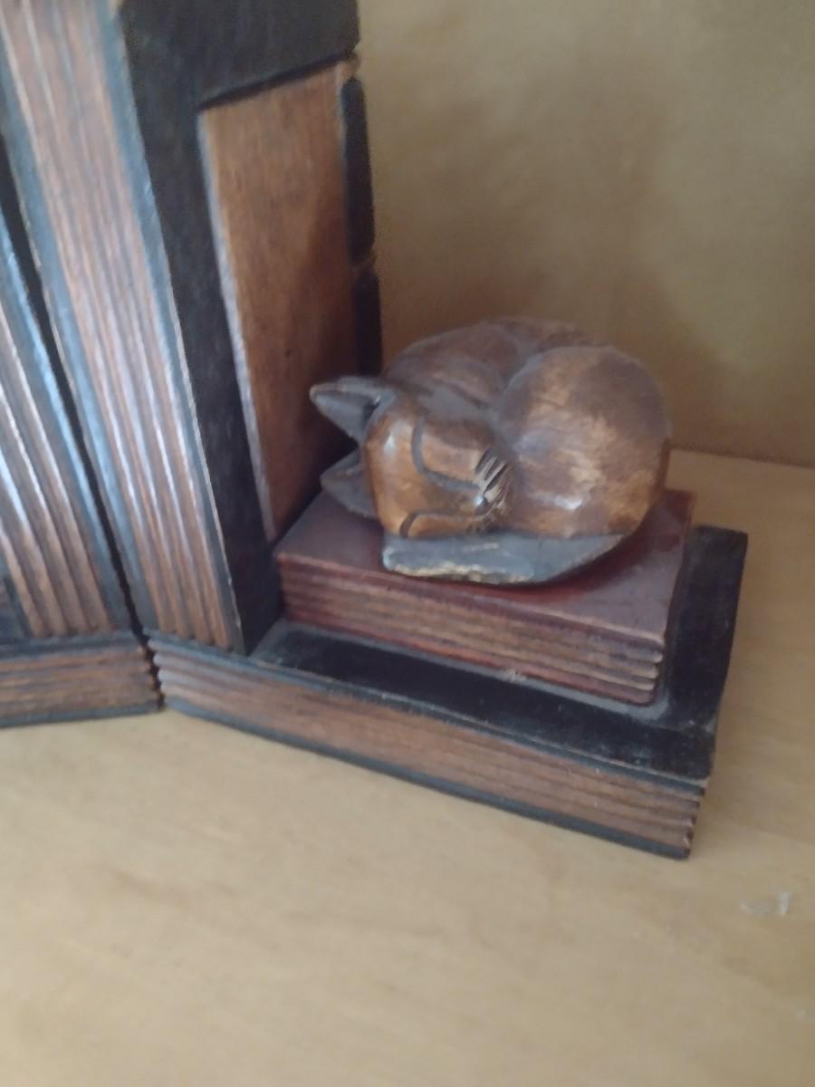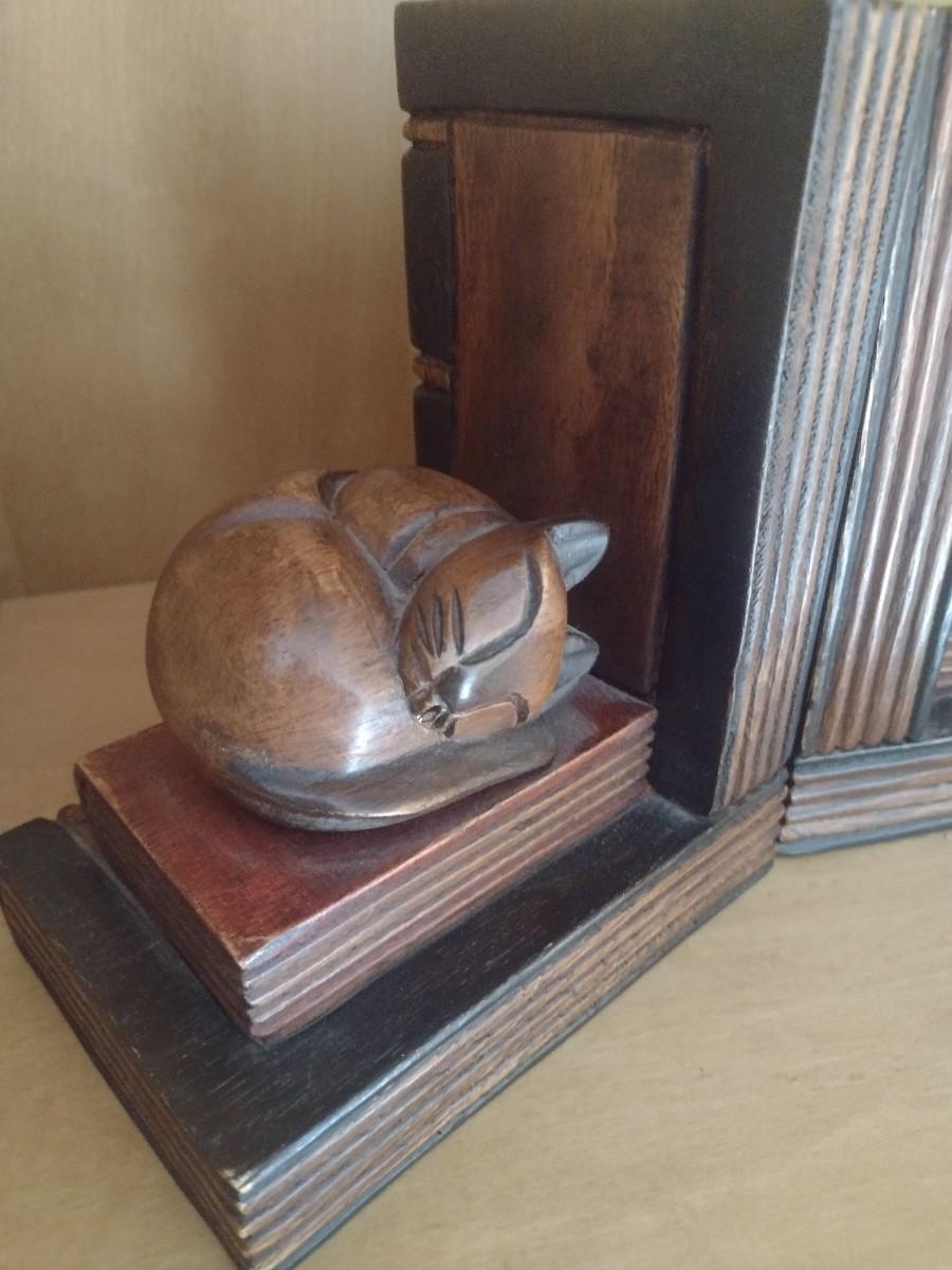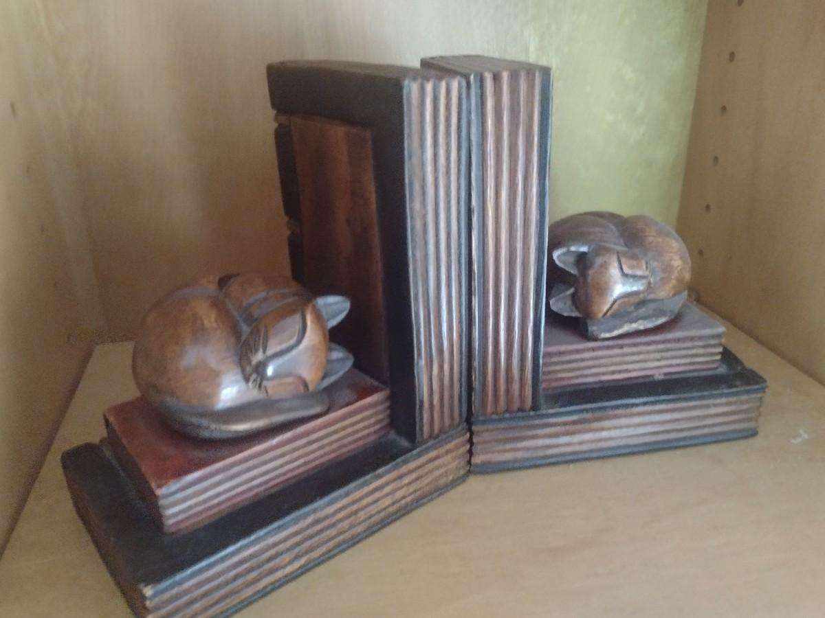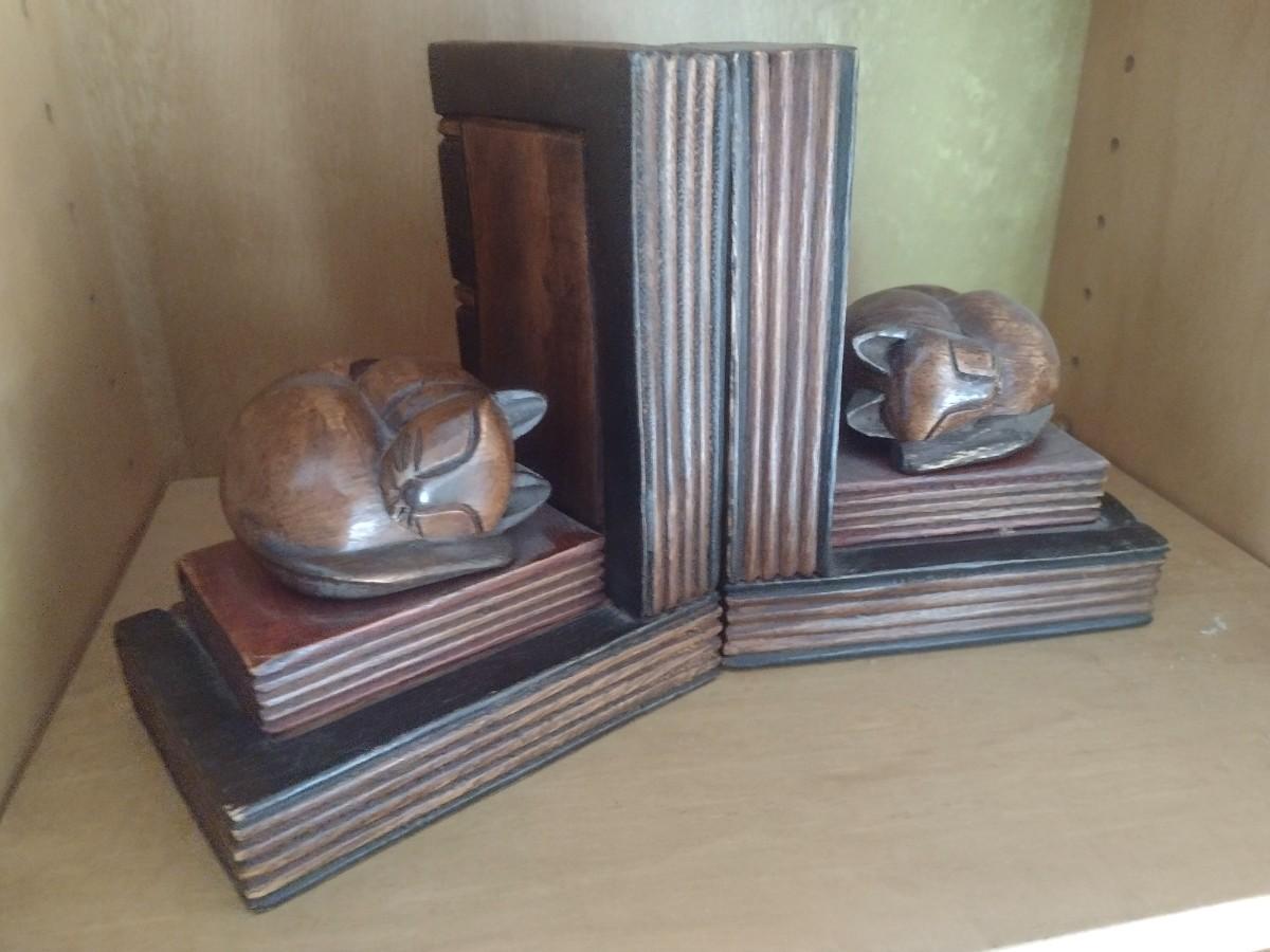 Wood Carved Sleeping Cat Bookends