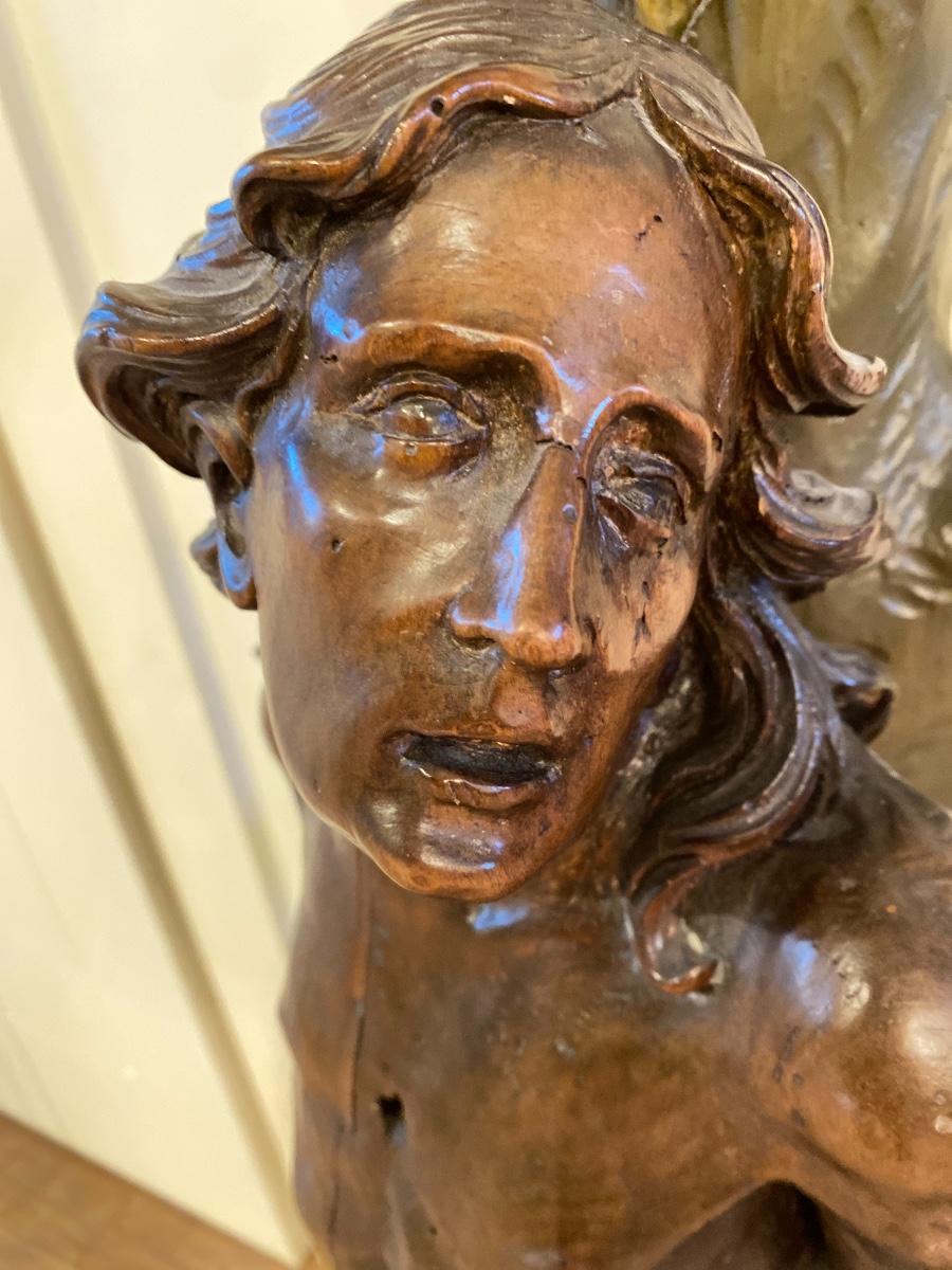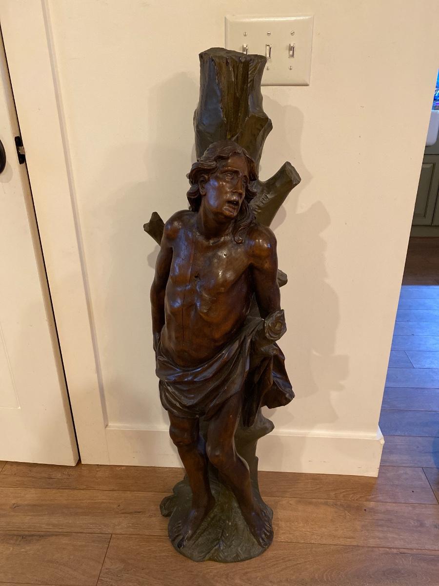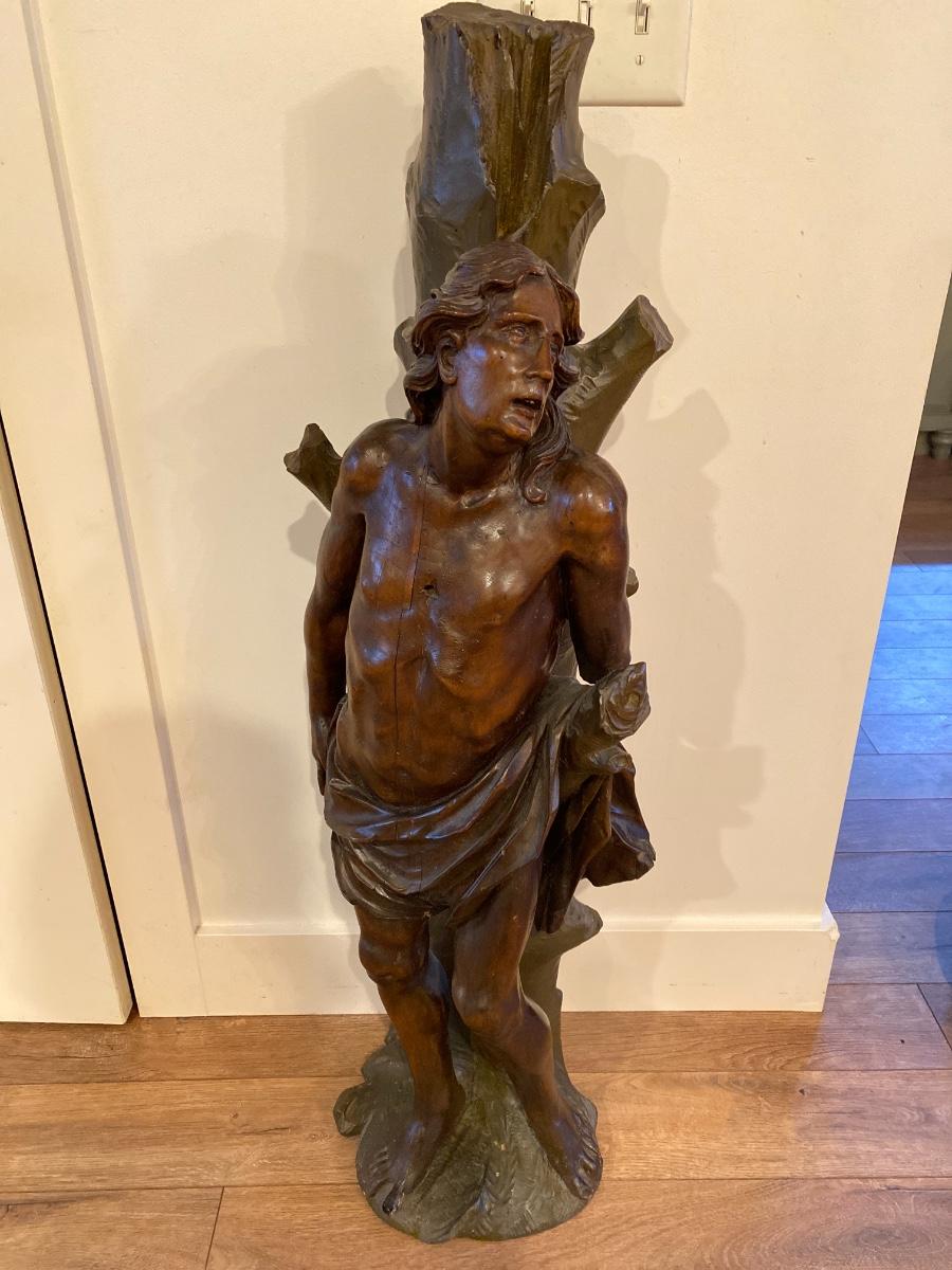 Antique NeoClassical Style Wood Carving of St. Sebastian Bound To a Tree