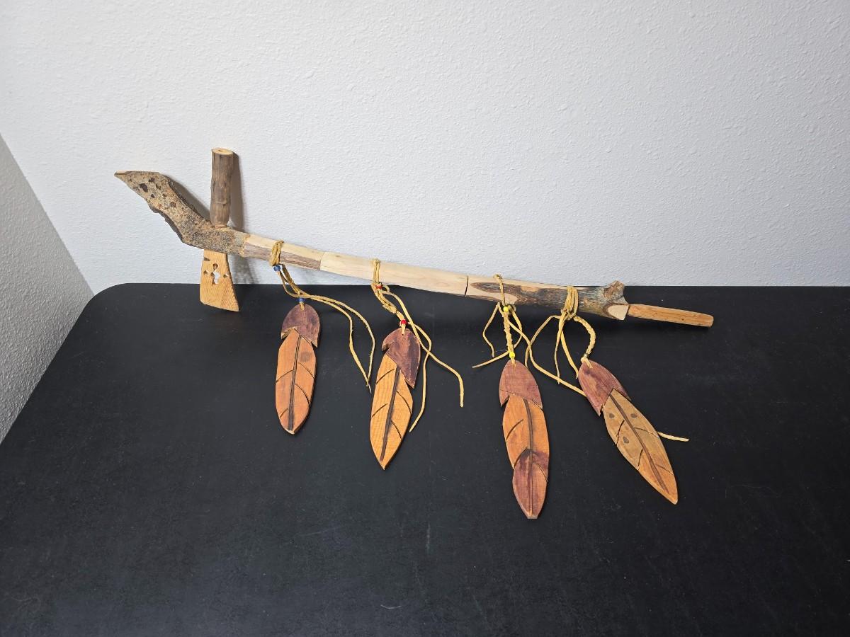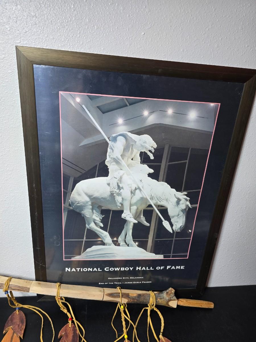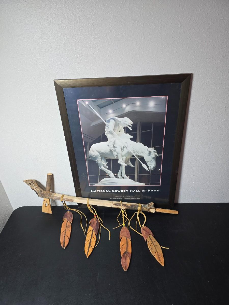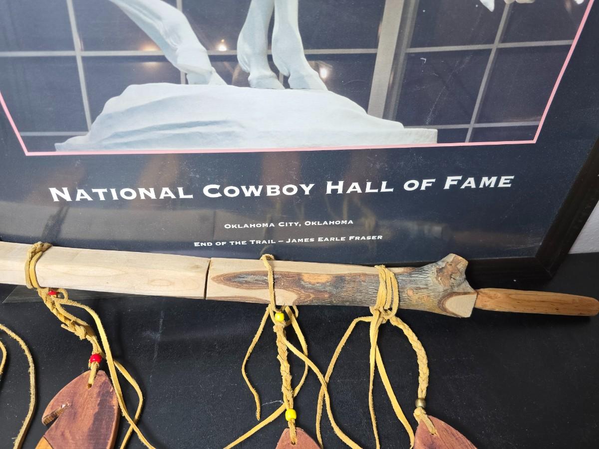 Wood carved Tomahawk pipe replica with a framed "The End of the Trail" by James Earle Fraser