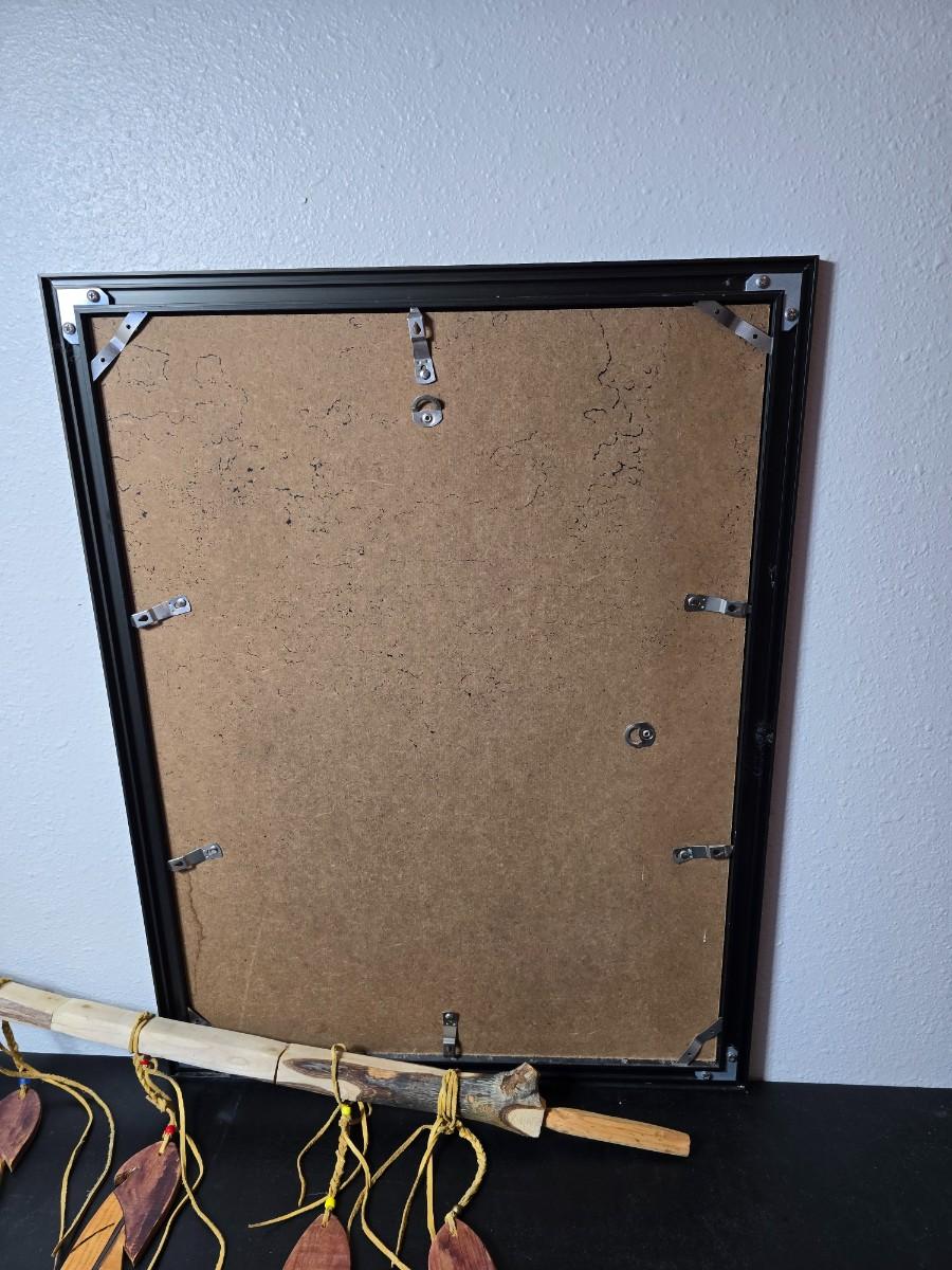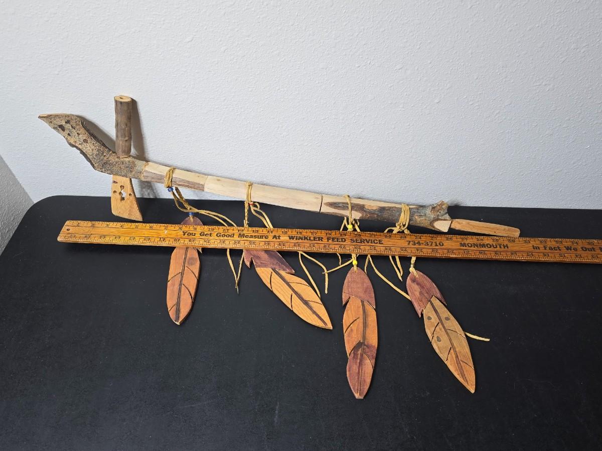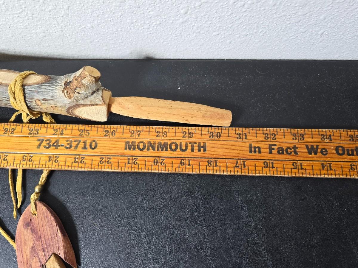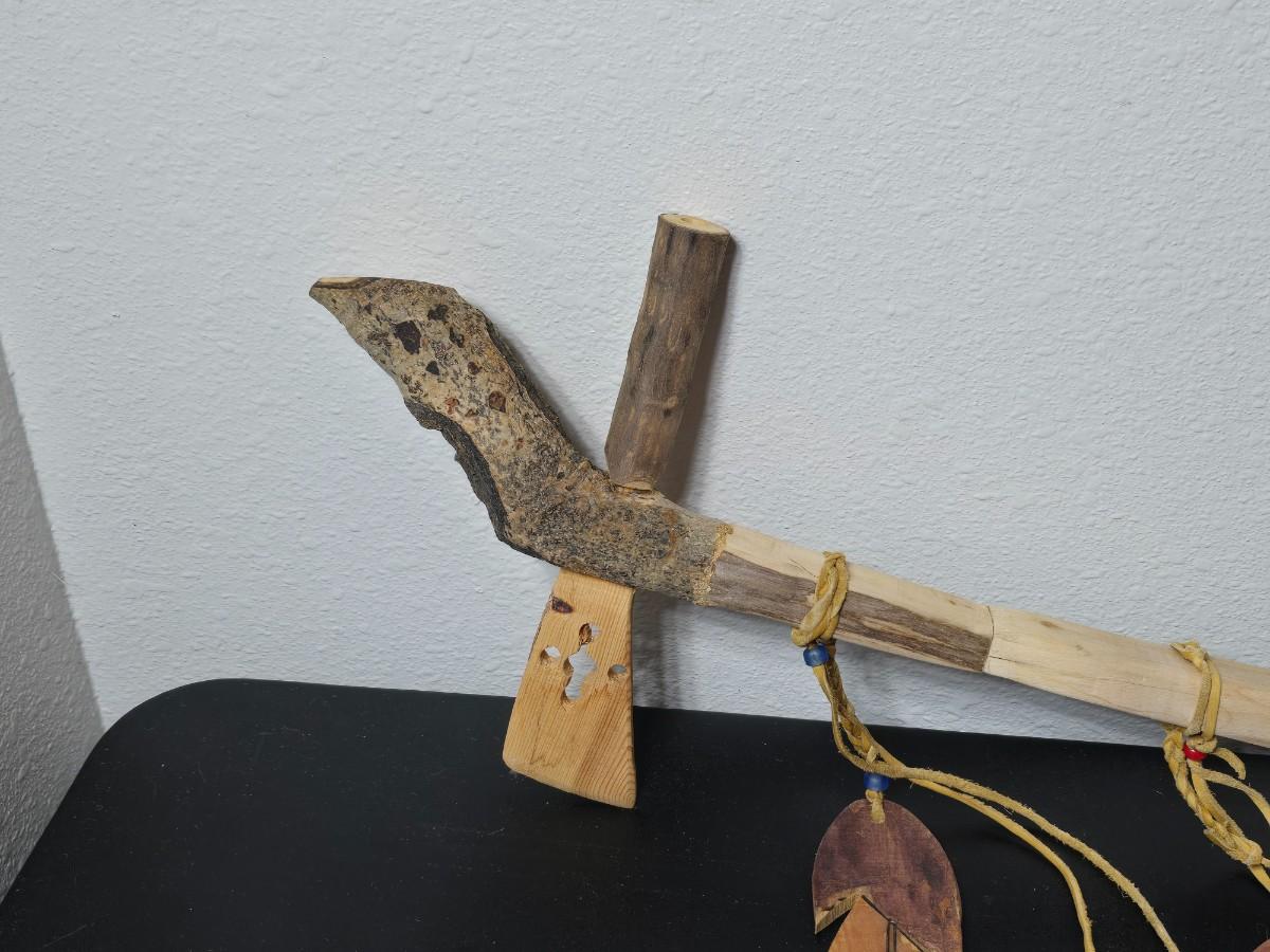 Wood carved Tomahawk pipe replica with a framed "The End of the Trail" by James Earle Fraser