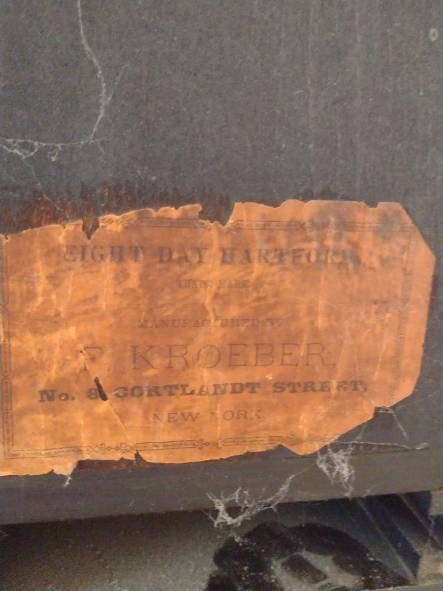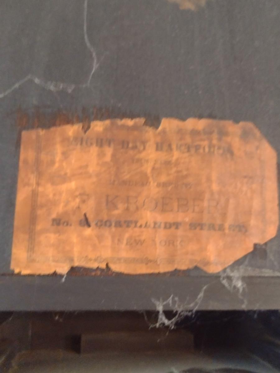 Wood Case Clock- Eight Day Wind Up- F. Kroeber. Item is untested.