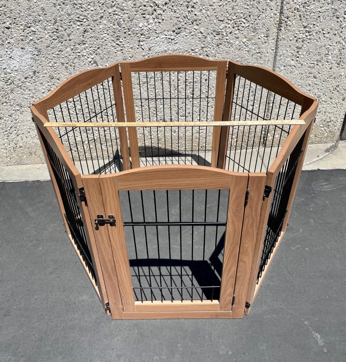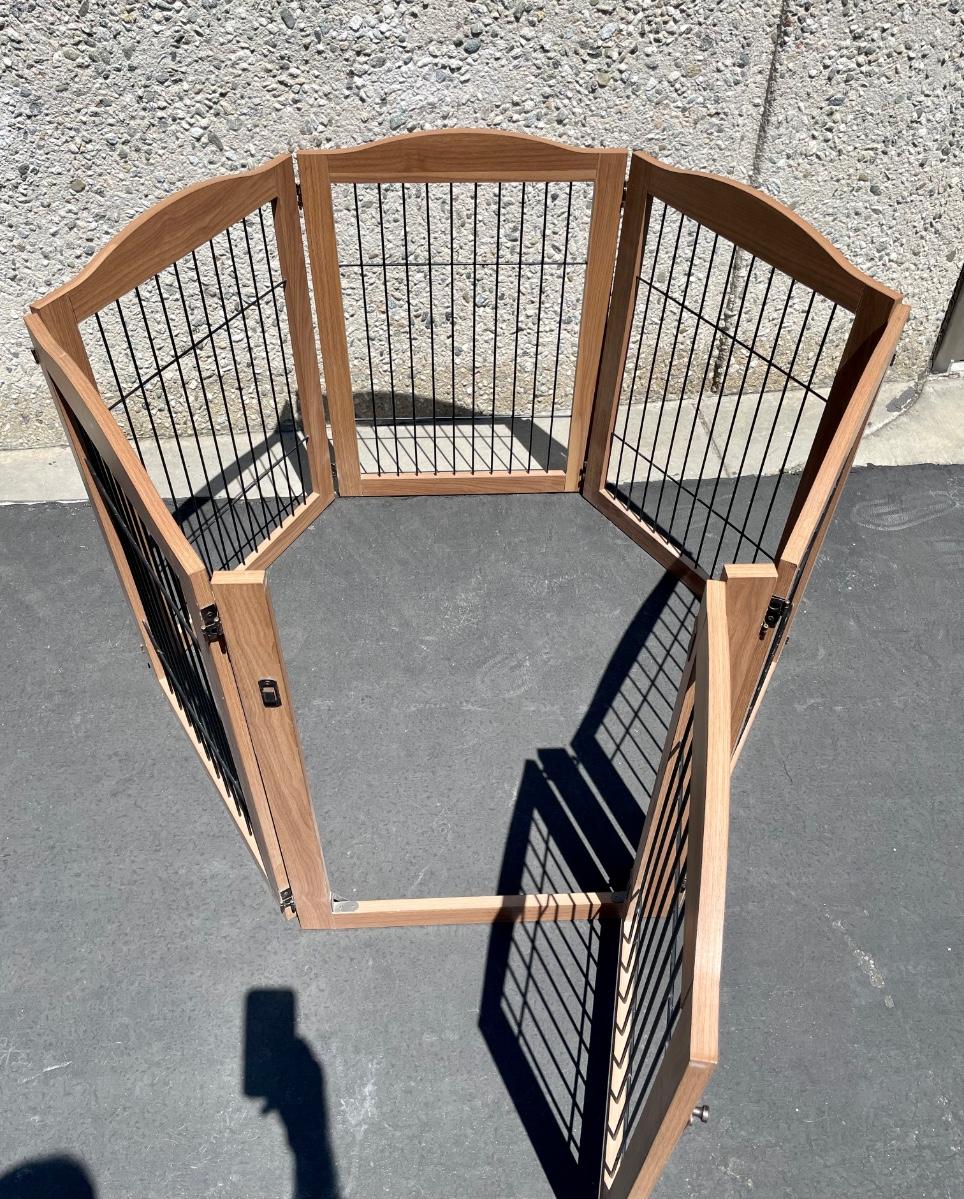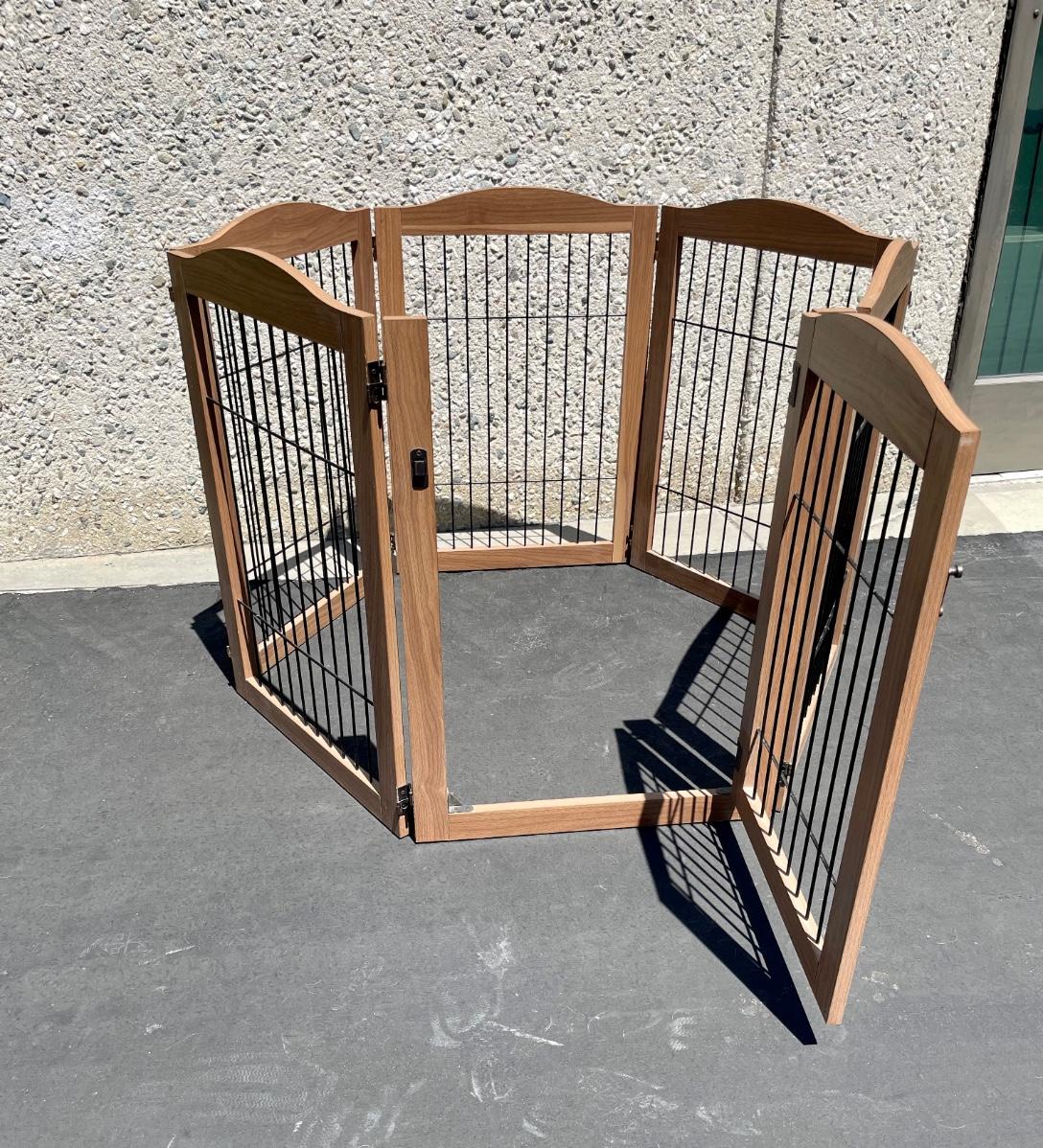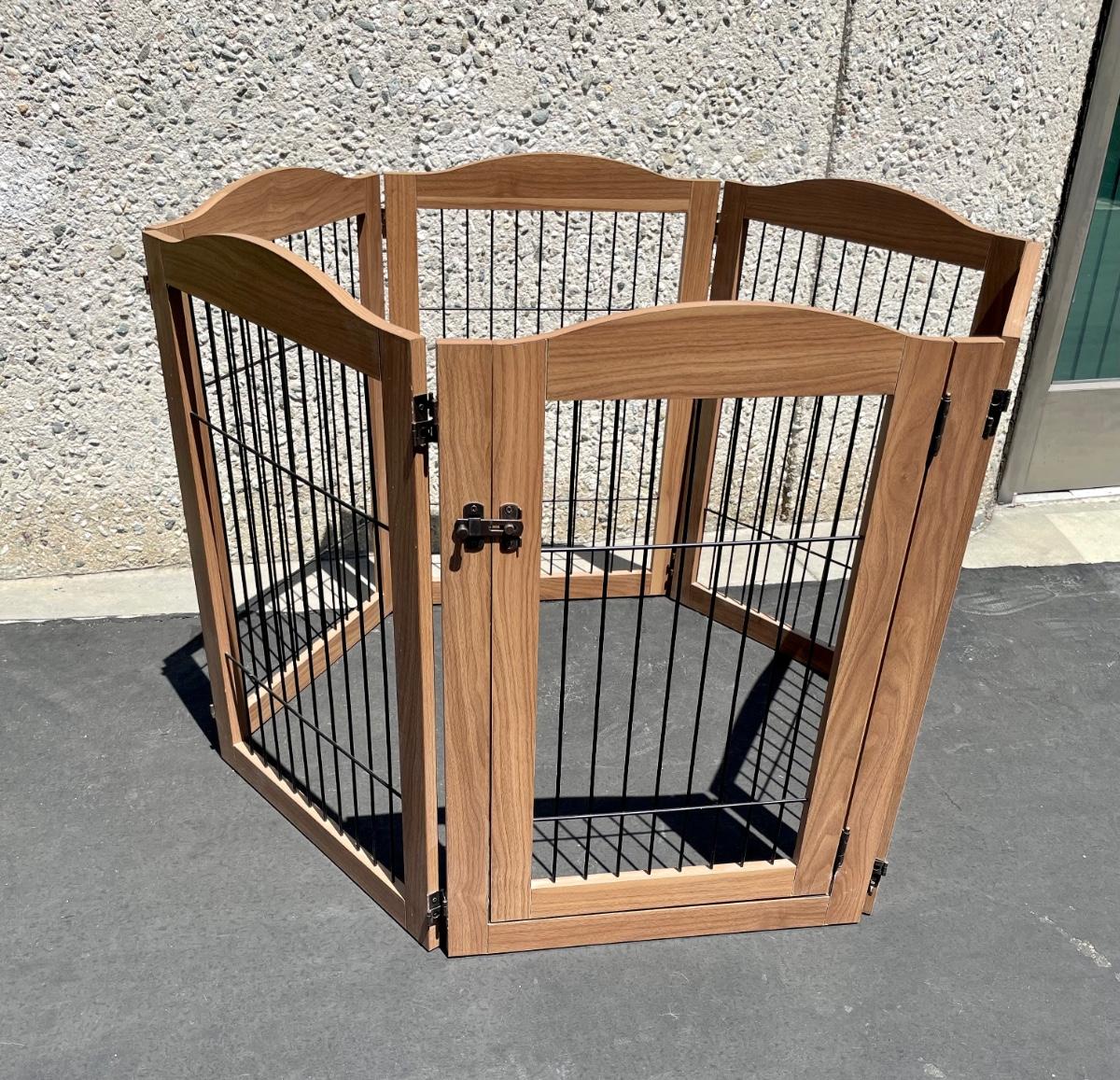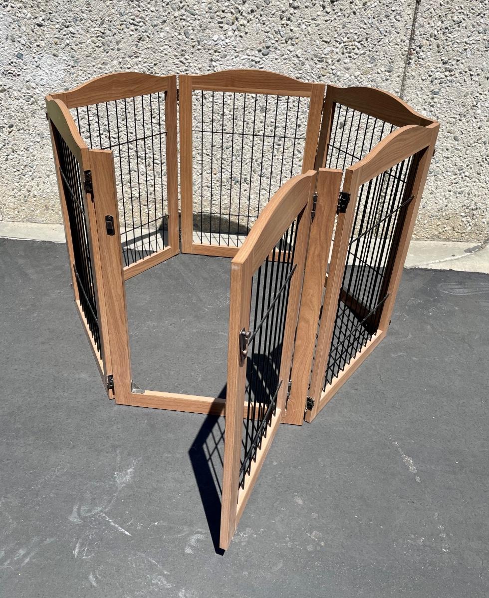Wood Pet Pen with Door. 6 sections, each section approx. 2' wide. Can be arranged as a 6-sided exclosure, or can be used as a room divider to block off an opening of approx. 10'