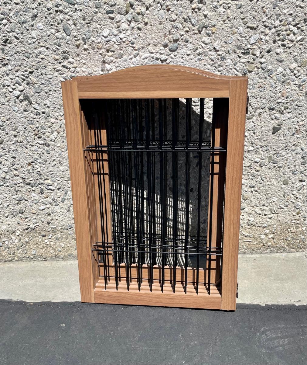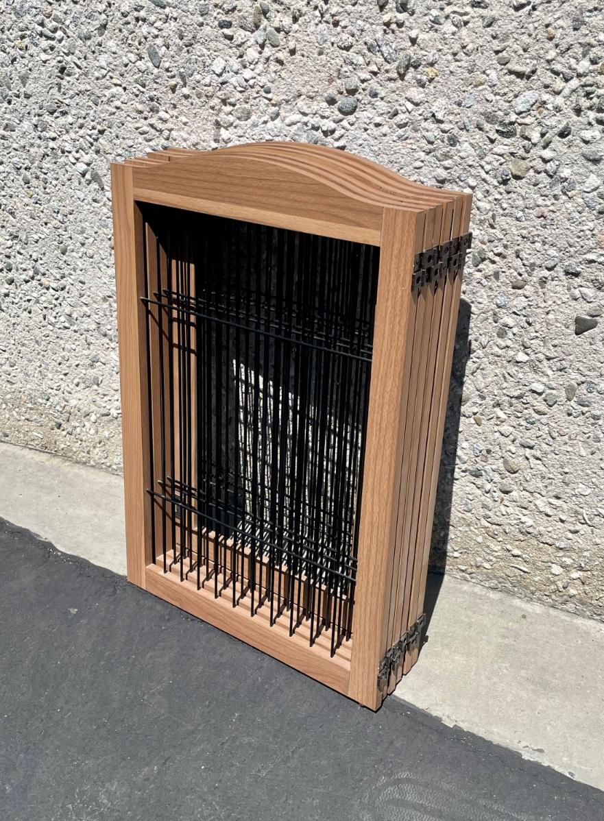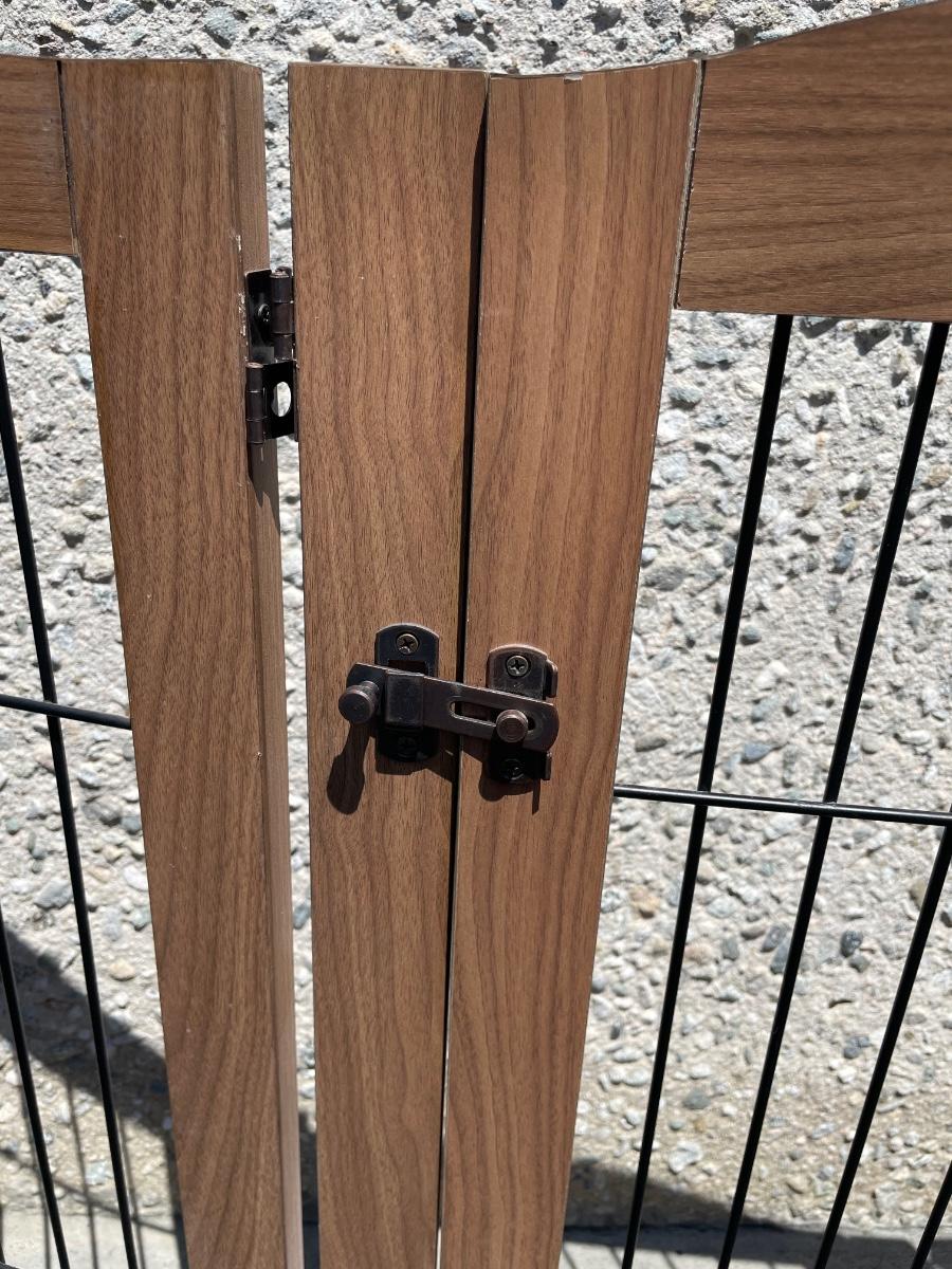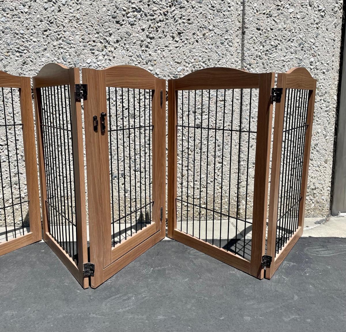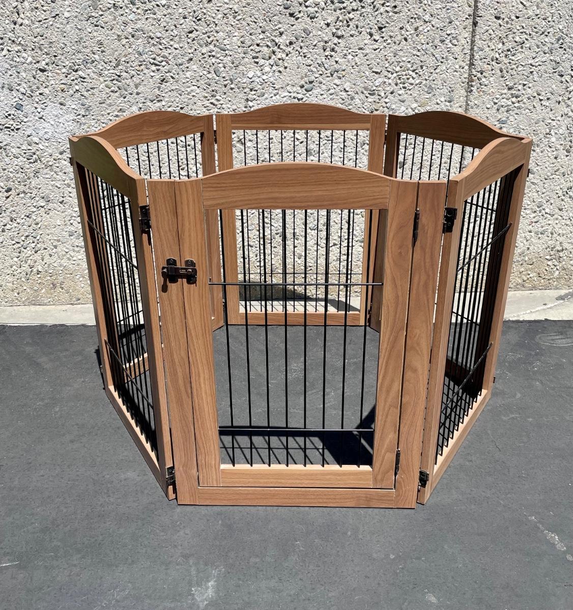 Wood Pet Pen with Door. 6 sections, each section approx. 2' wide. Can be arranged as a 6-sided exclosure, or can be used as a room divider to block off an opening of approx. 10'