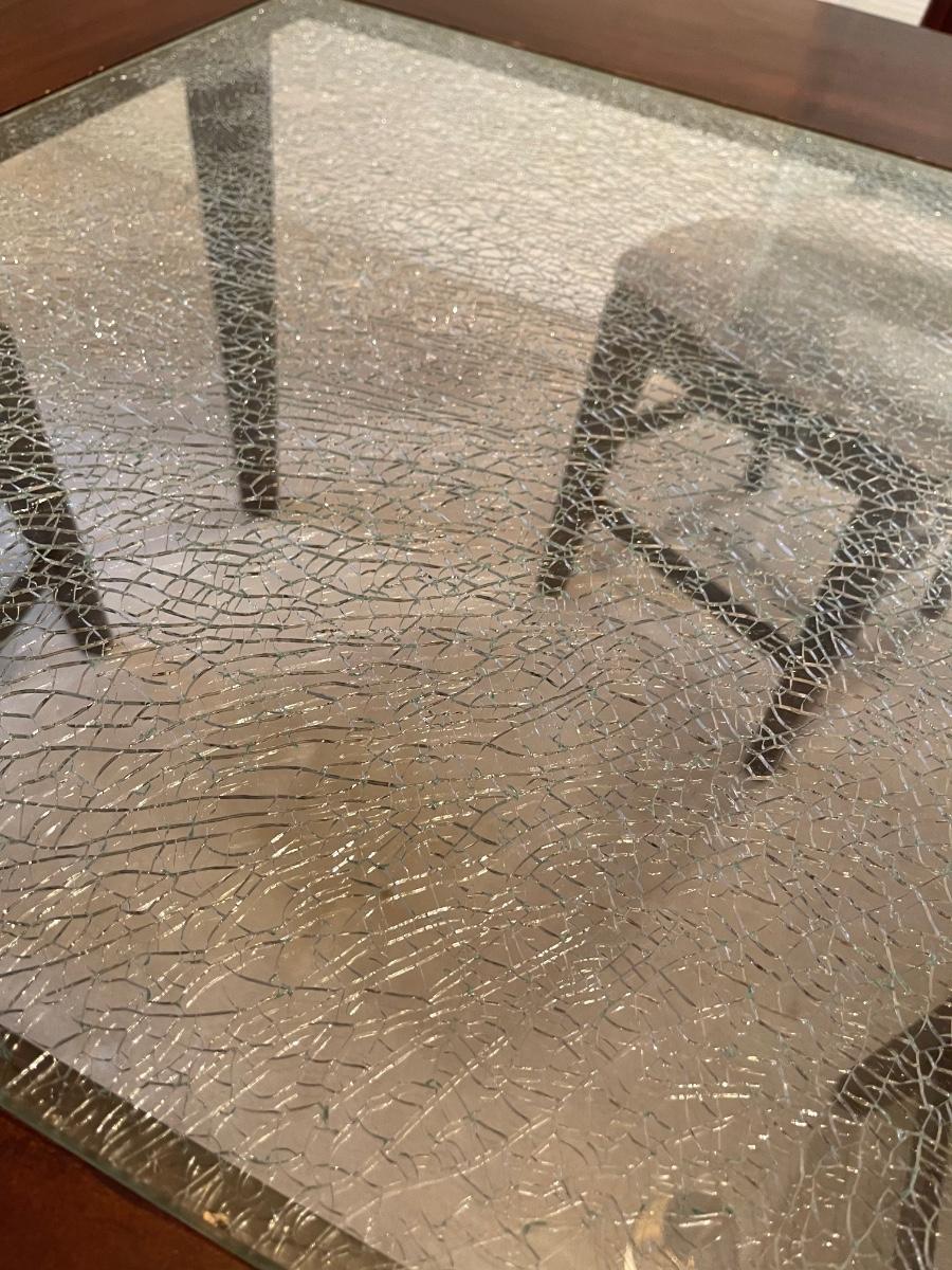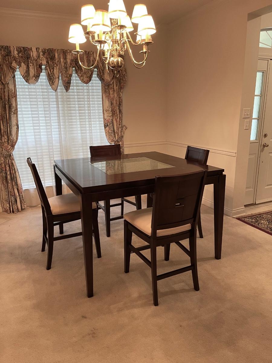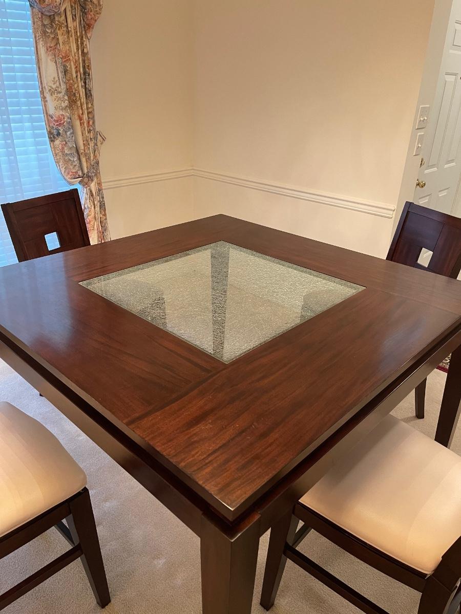 Great Condition: Includes 4 chairs. Glass Center is crackled to make look that way. It is not broken. One Chair seat is torn (see photo) ~ Table has minor surface scratches from use ~ Table measures = 35.5” H x 52.5” X 52.5” Square. Chair Height from seat to floor = 23”