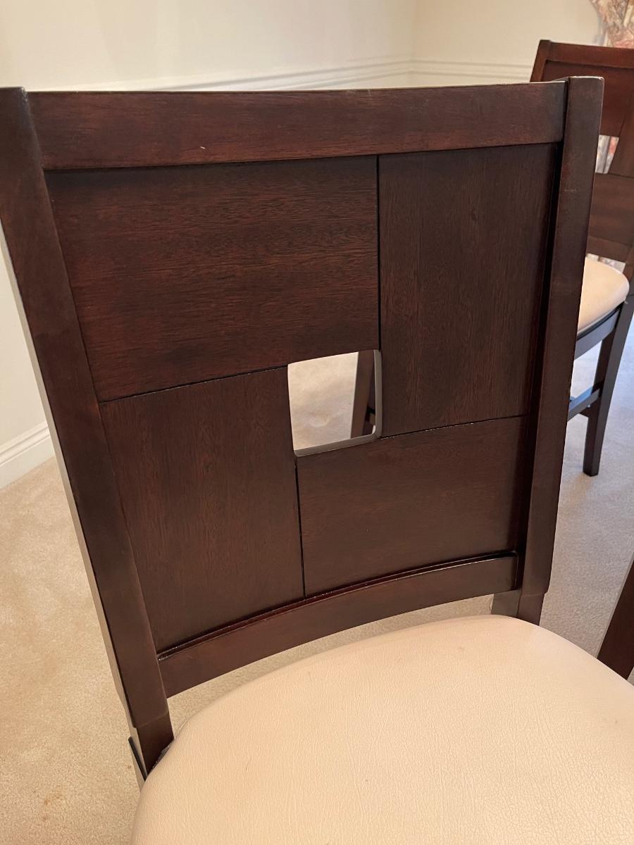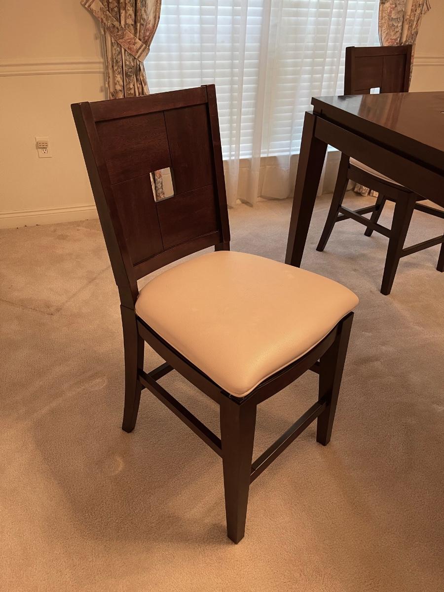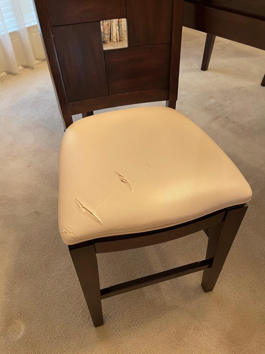 Great Condition: Includes 4 chairs. Glass Center is crackled to make look that way. It is not broken. One Chair seat is torn (see photo) ~ Table has minor surface scratches from use ~ Table measures = 35.5” H x 52.5” X 52.5” Square. Chair Height from seat to floor = 23”