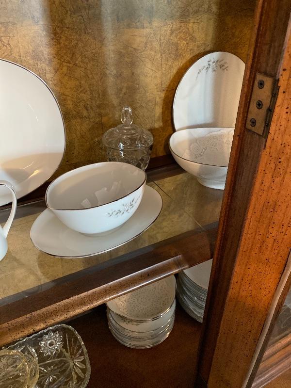 17”D x 57” L x 85” H / Lighted / 2 Glass Shelves / Contents NOT included / Ornate decoration on bottom cabinet doors & top trim are plastic material