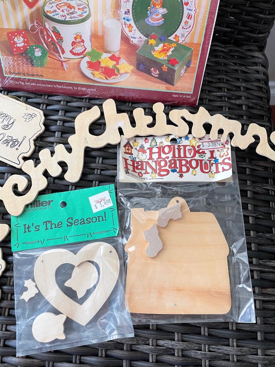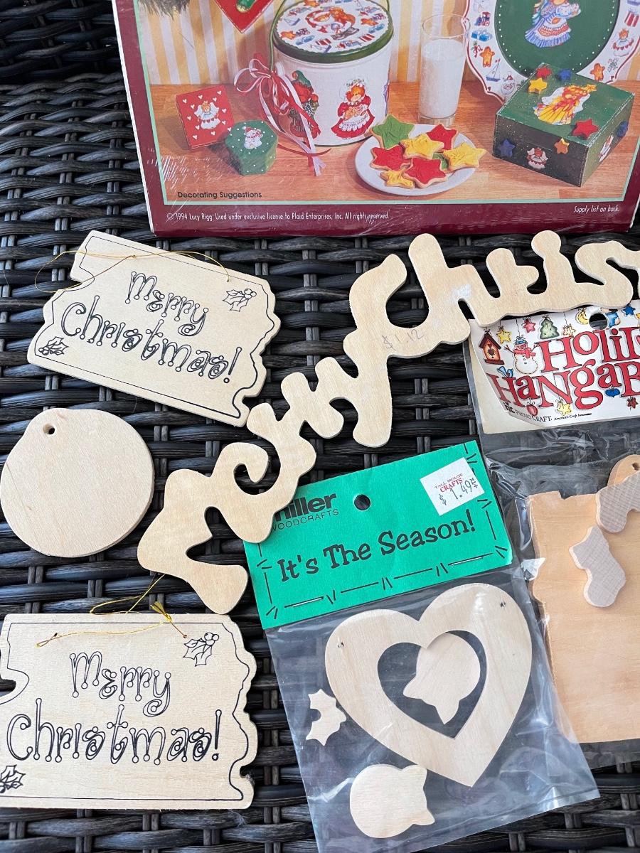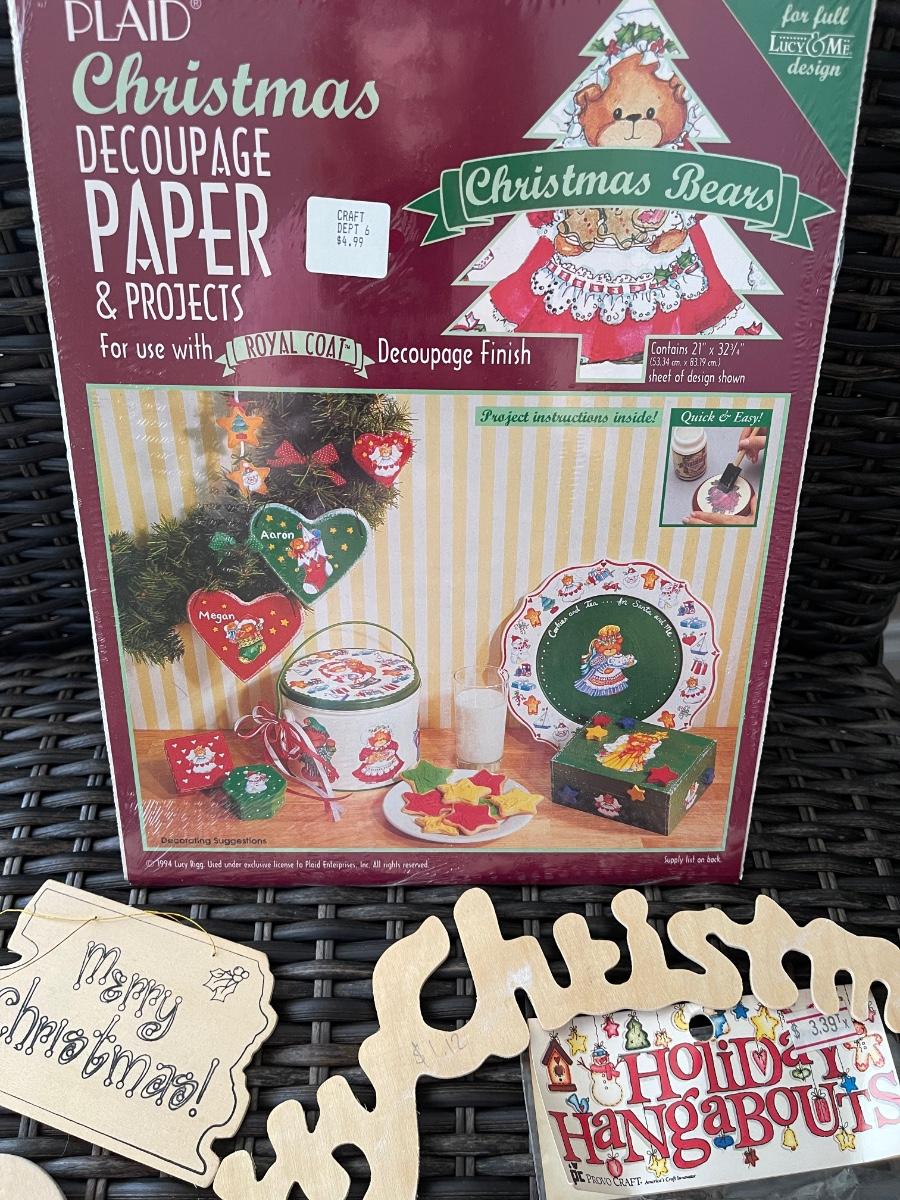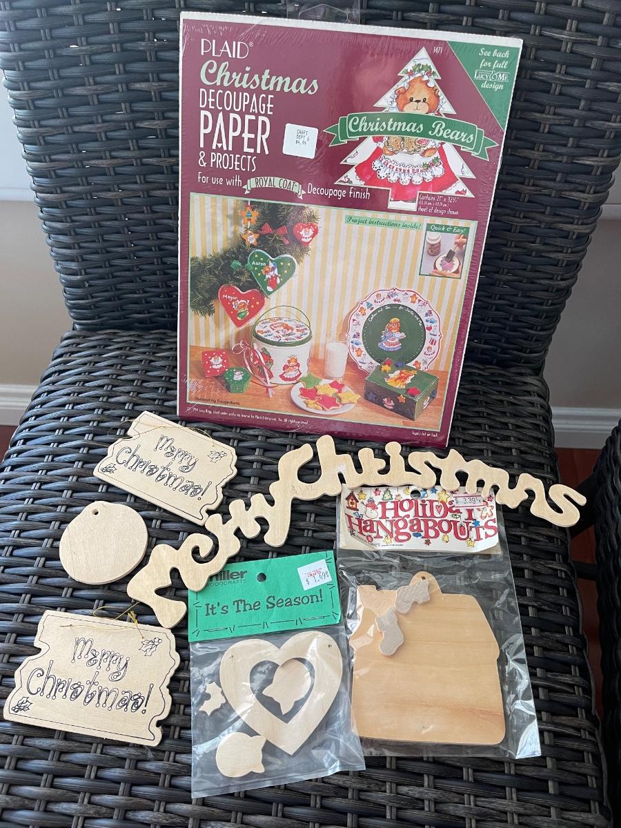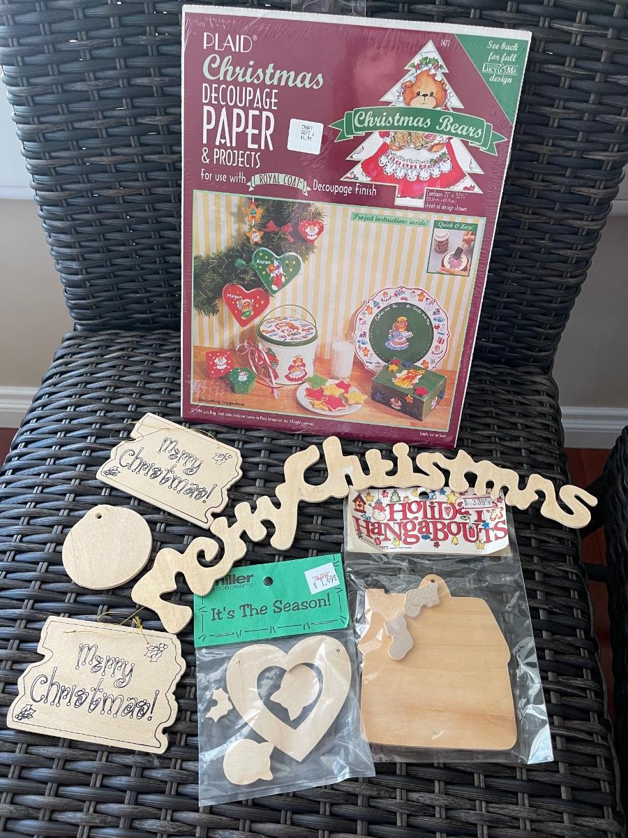 Wood Christmas Holiday Craft Pieces and Decoupage Project Booklet. Good condition.