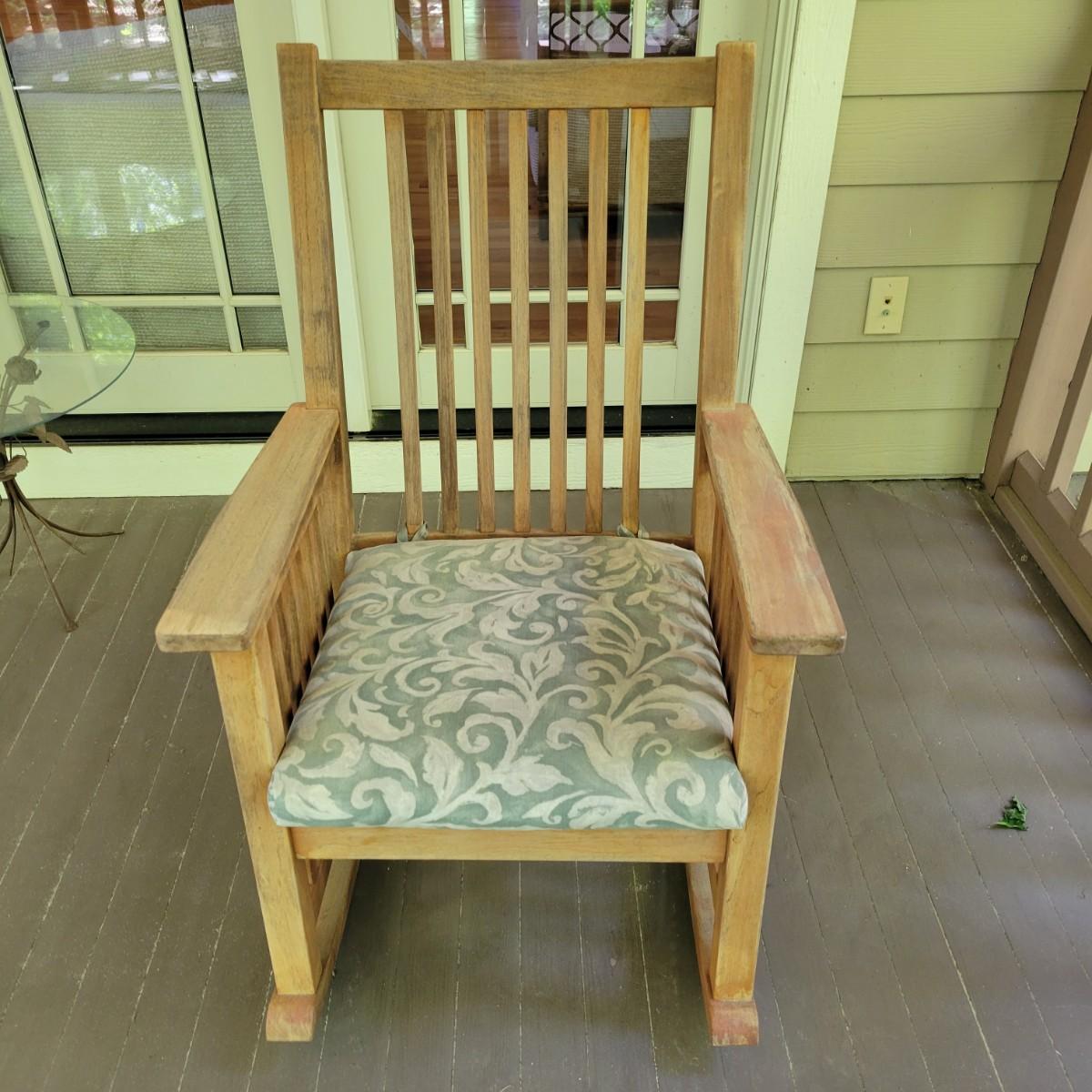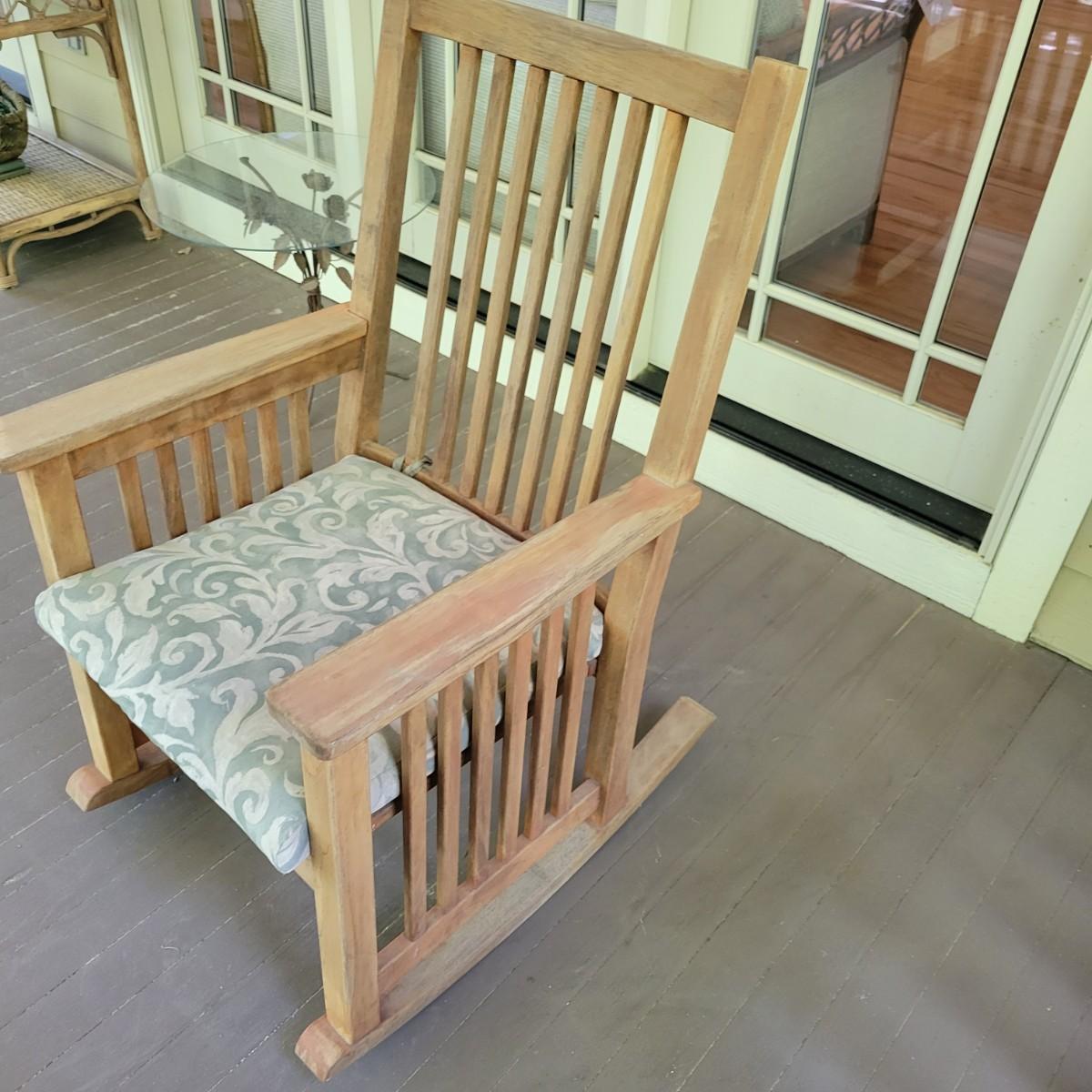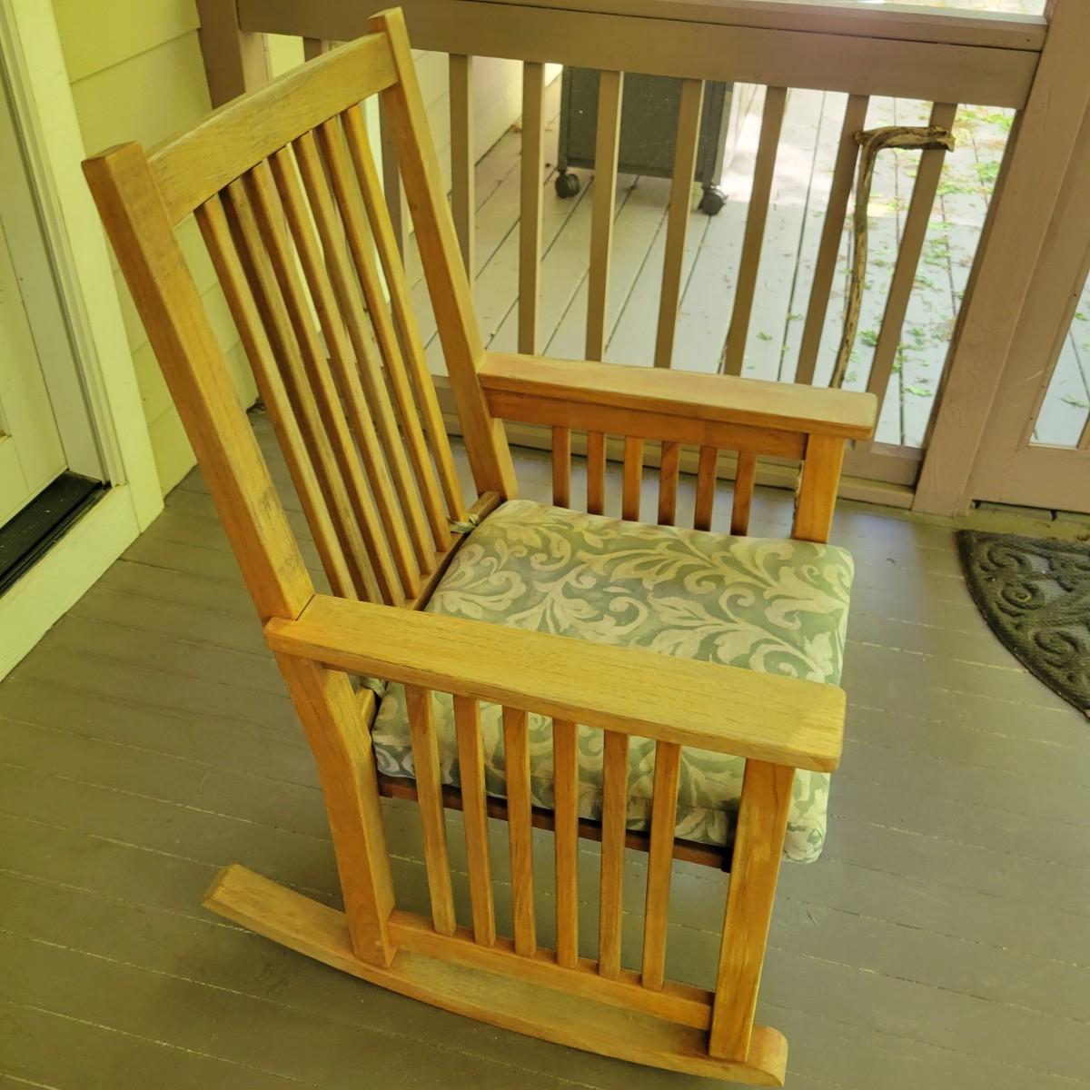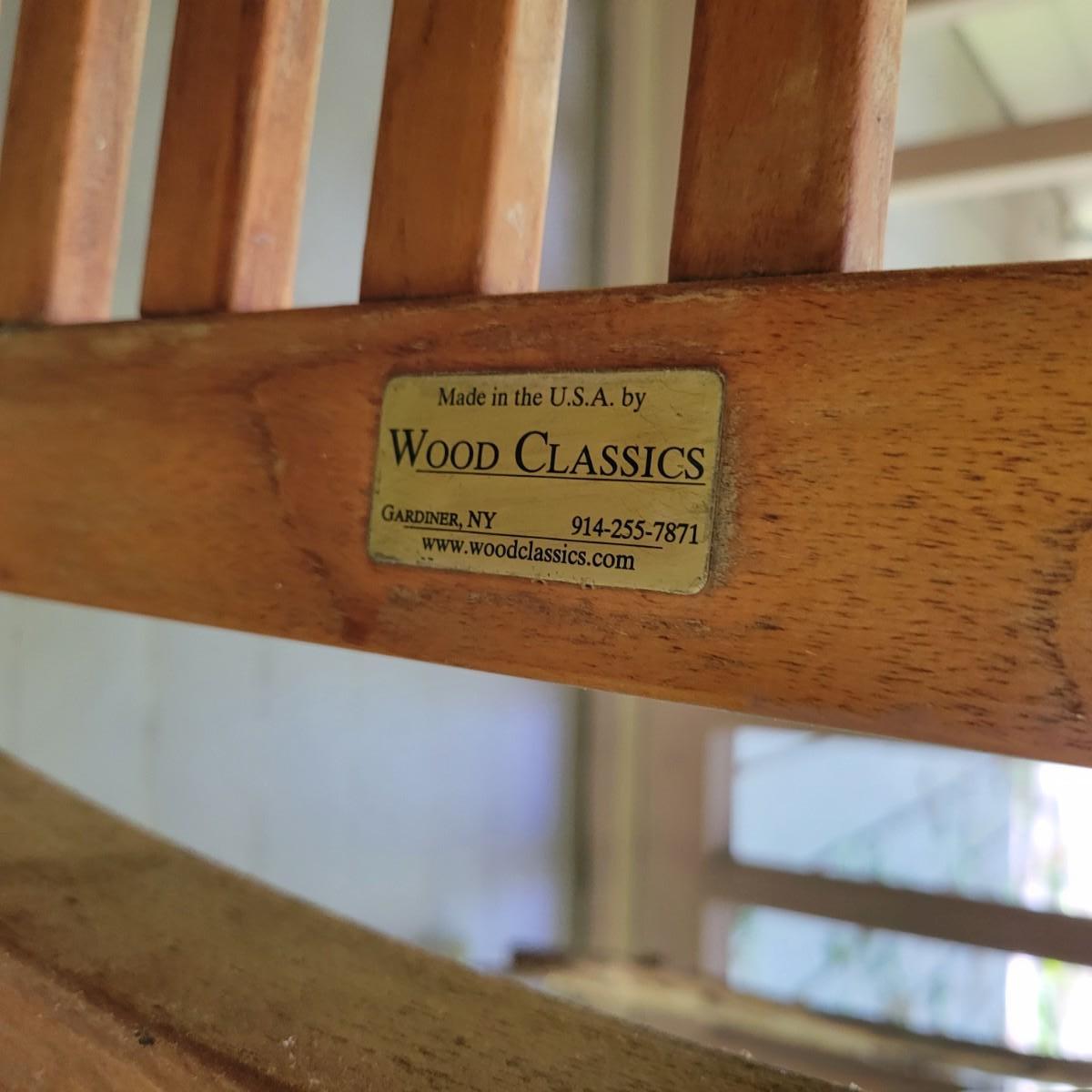 A solid wood rocking chair manufactured by Wood Classics. This chair features mortise and pin construction and includes a decorative seat cushion. It measures approximately 25" x 29" x 40"H with a seat height of 17". Local pickup only
