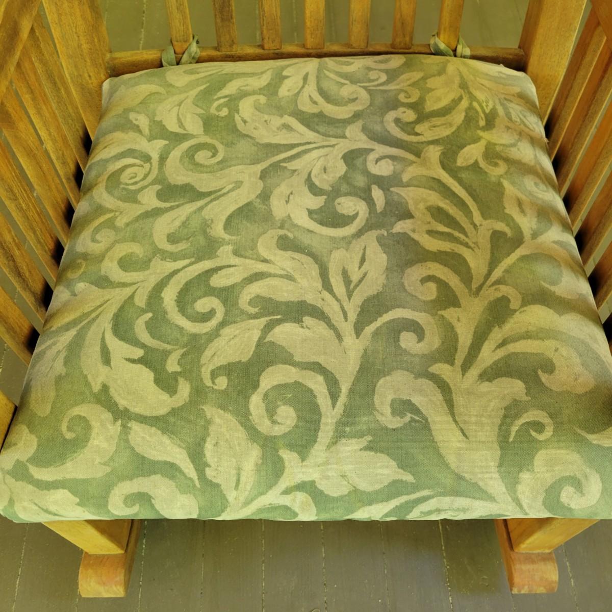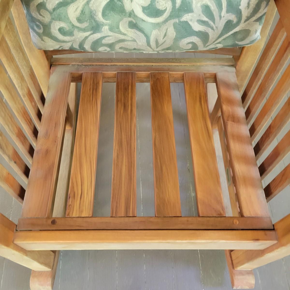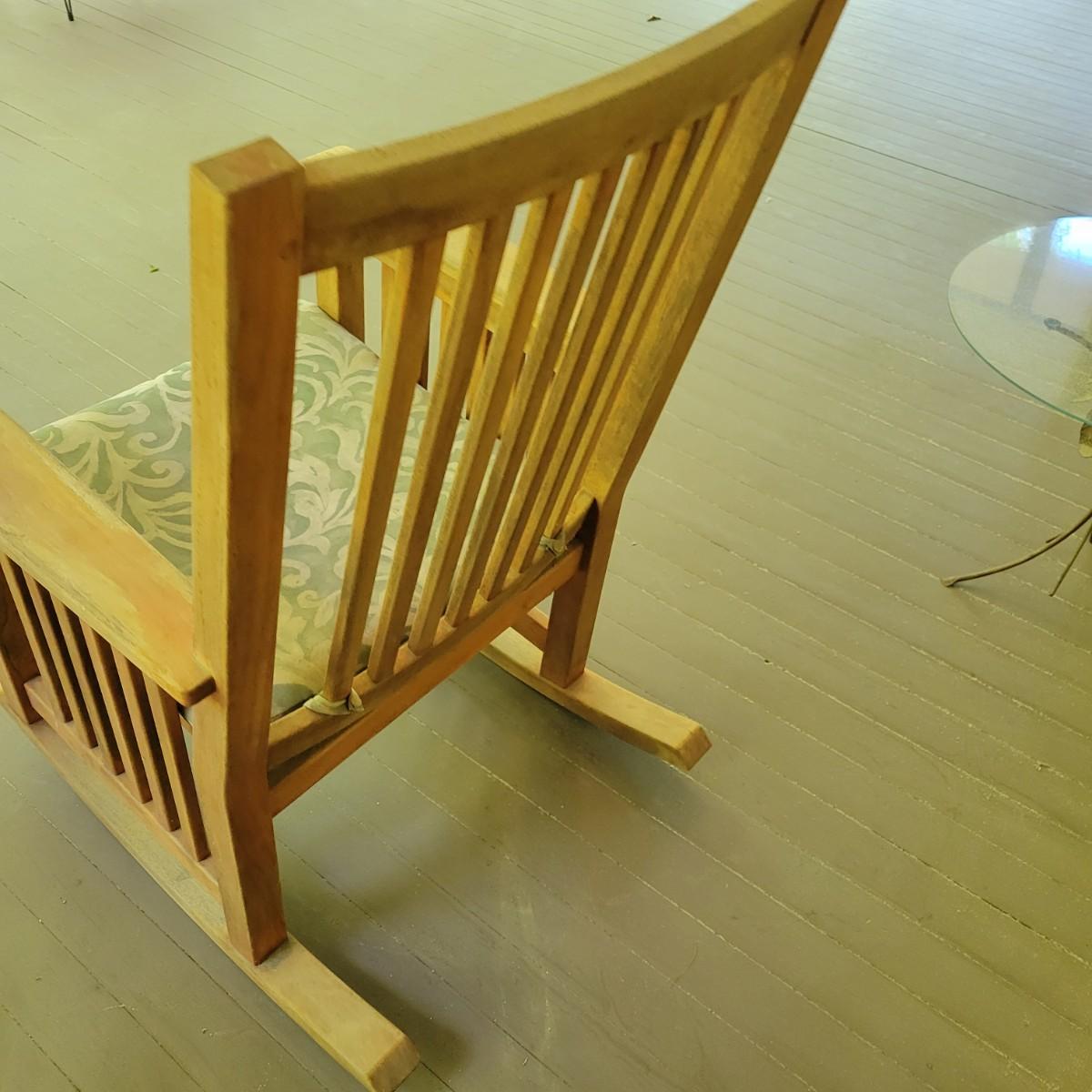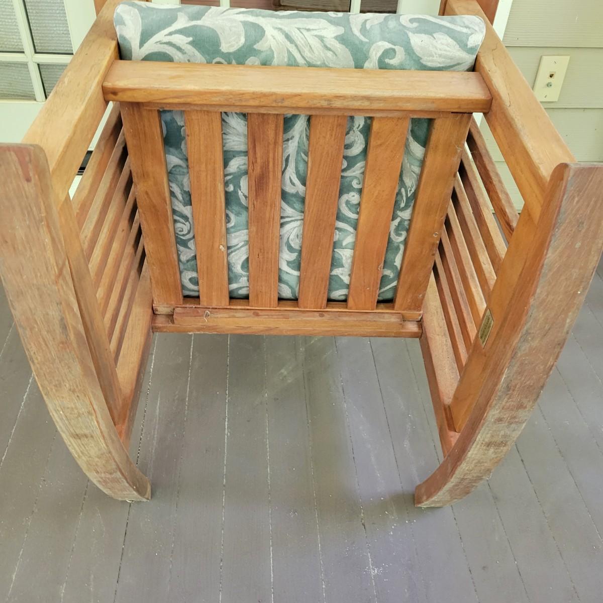 A solid wood rocking chair manufactured by Wood Classics. This chair features mortise and pin construction and includes a decorative seat cushion. It measures approximately 25" x 29" x 40"H with a seat height of 17". Local pickup only