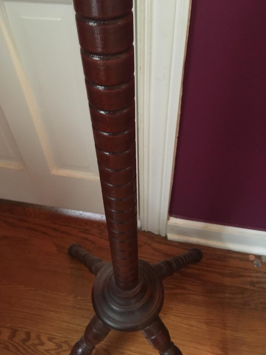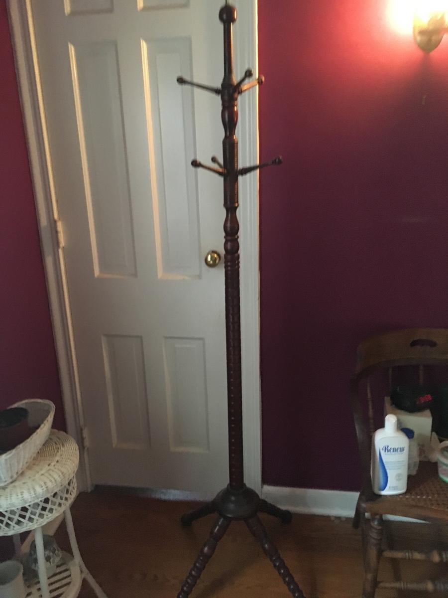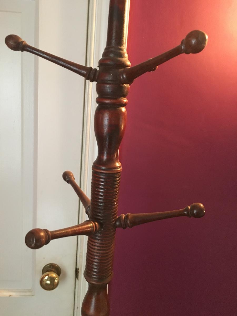 Tall coat rack has carved details throughout.