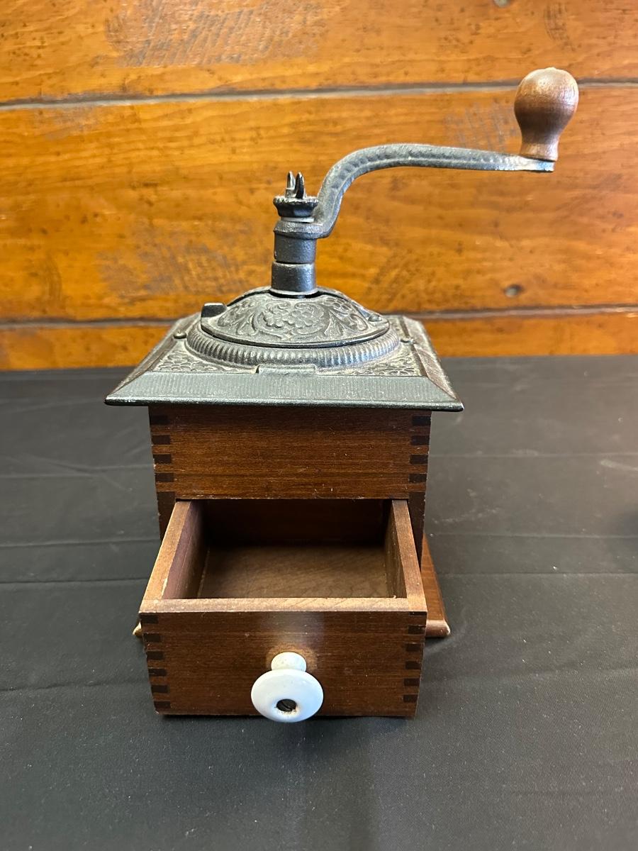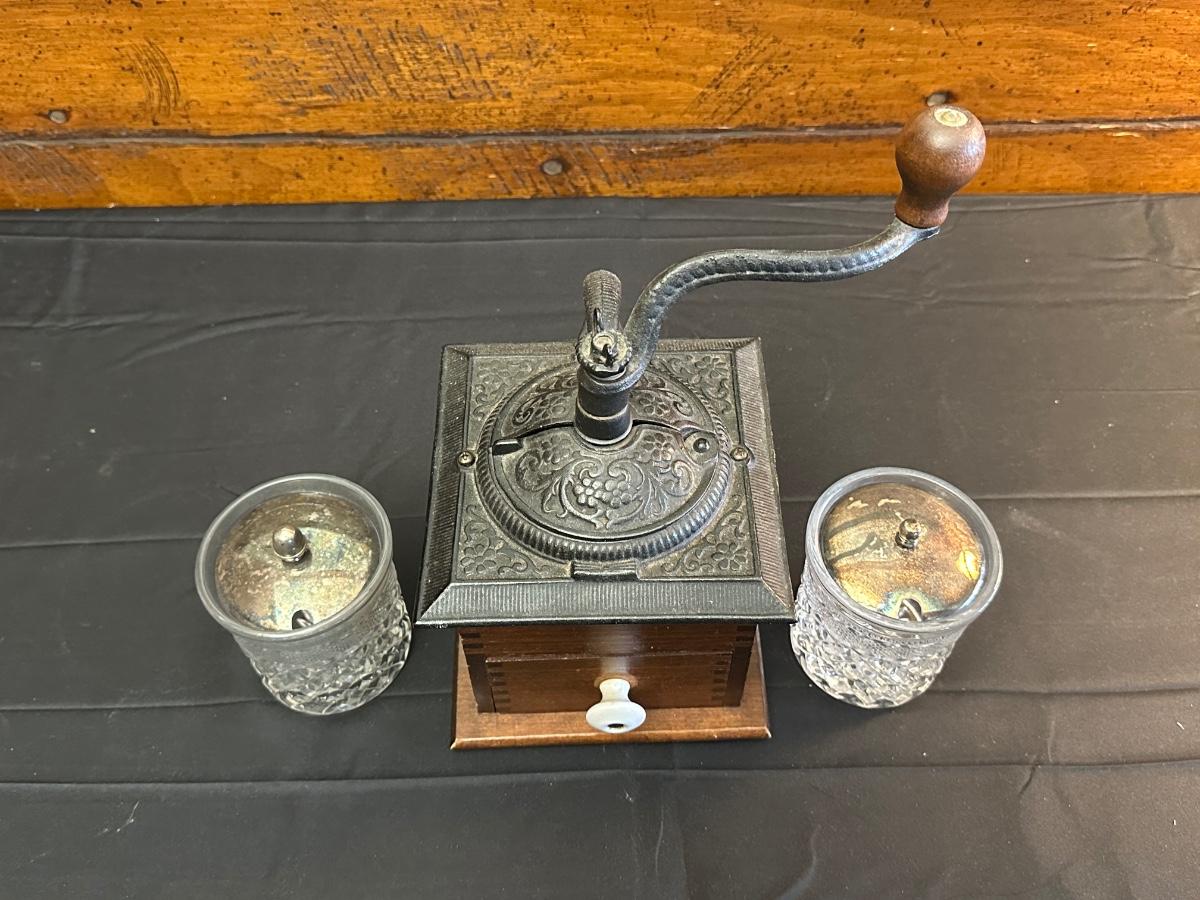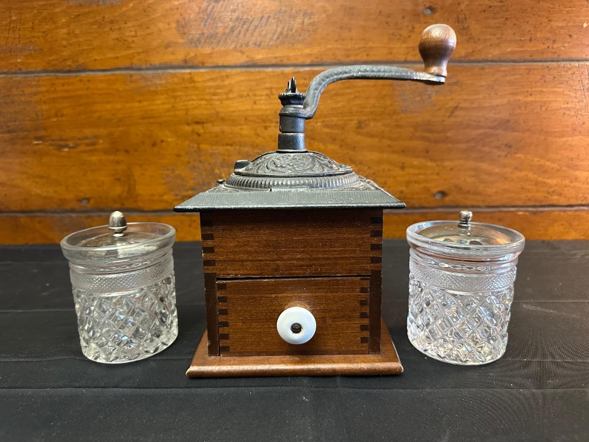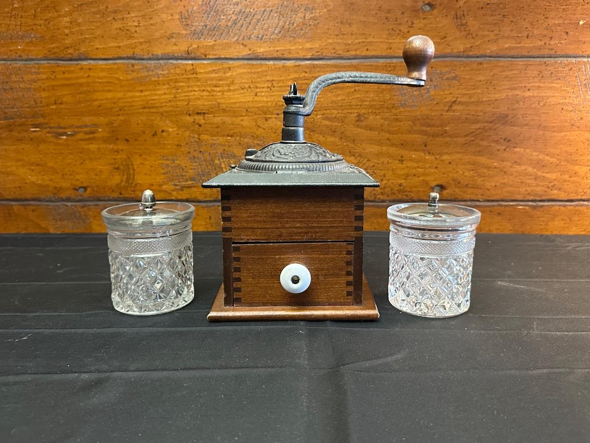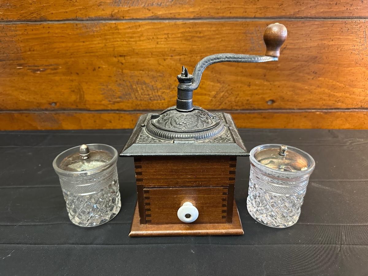 Wood Coffee Grinder and Two Crystal Sugar Glasses