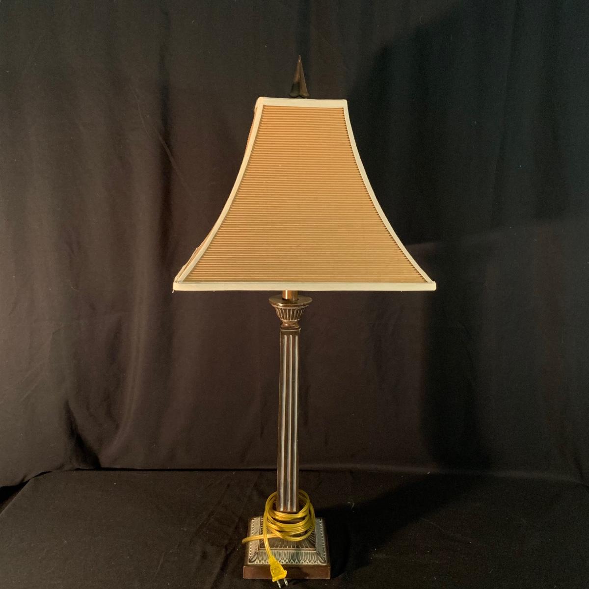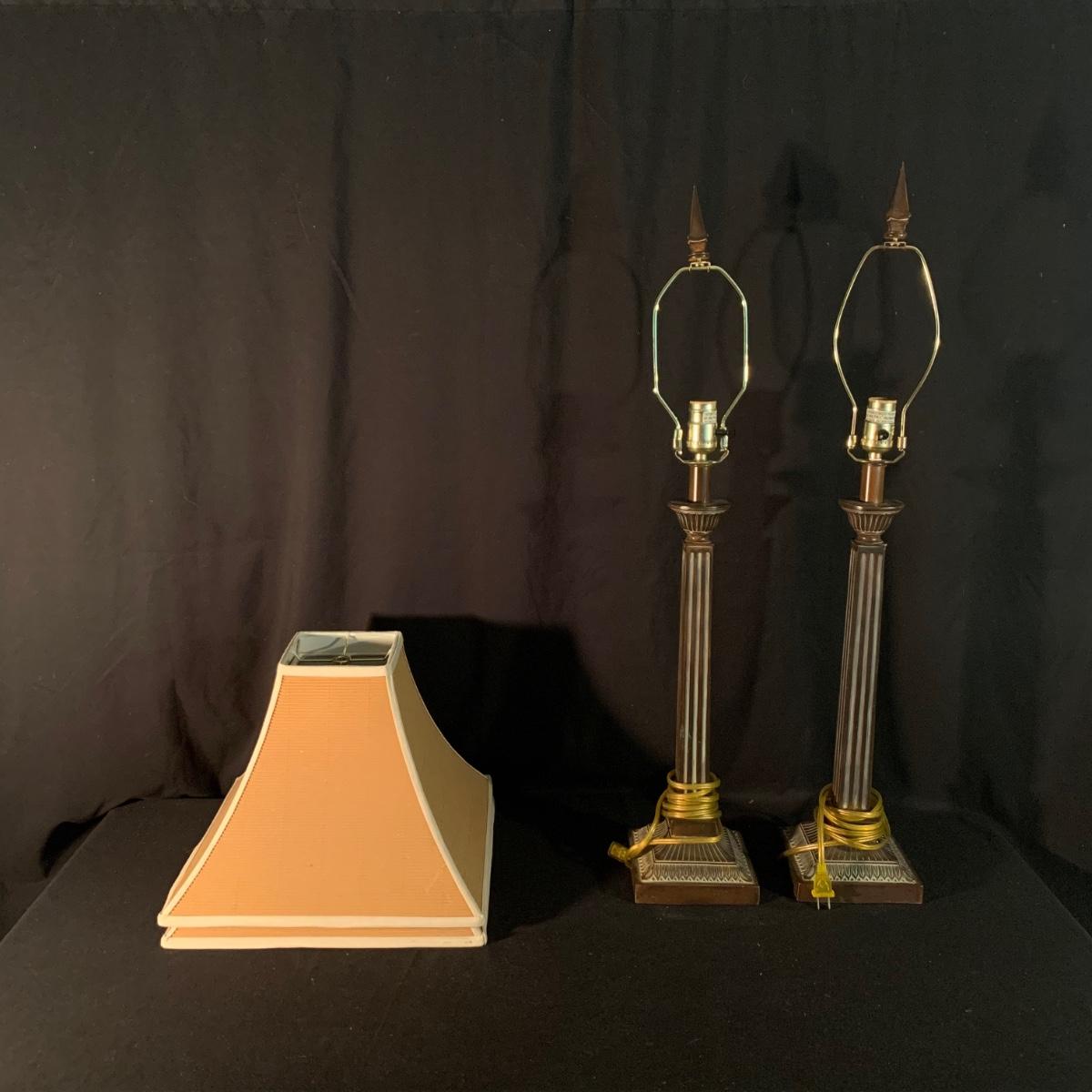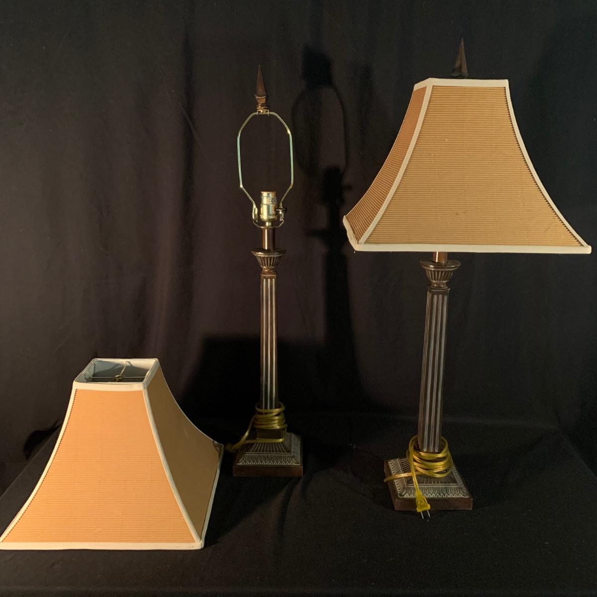 A pair of lamps with lamp shades. The lamps are in excellent condition and worked when tested. The lamp bases measures about 33in without the lamp shades, and are metal. Local pickup only.