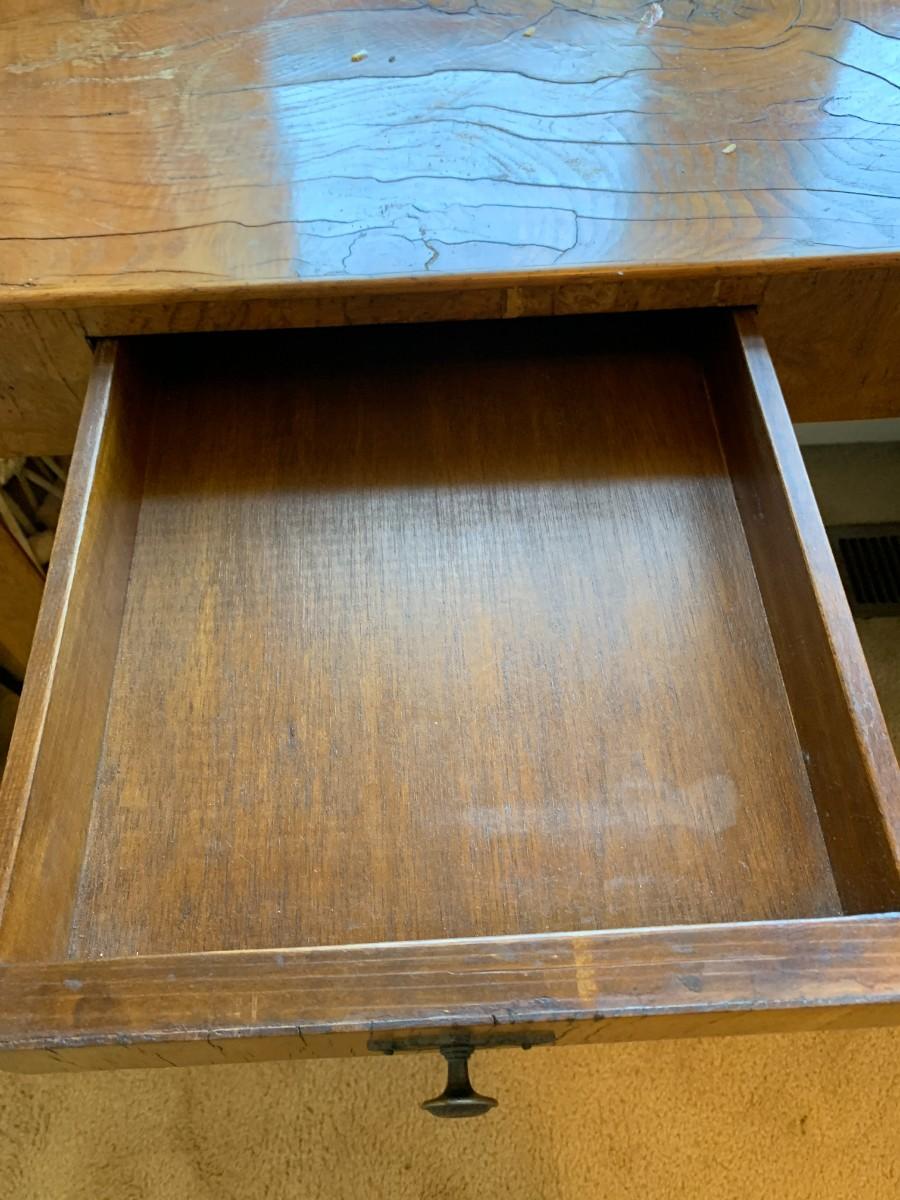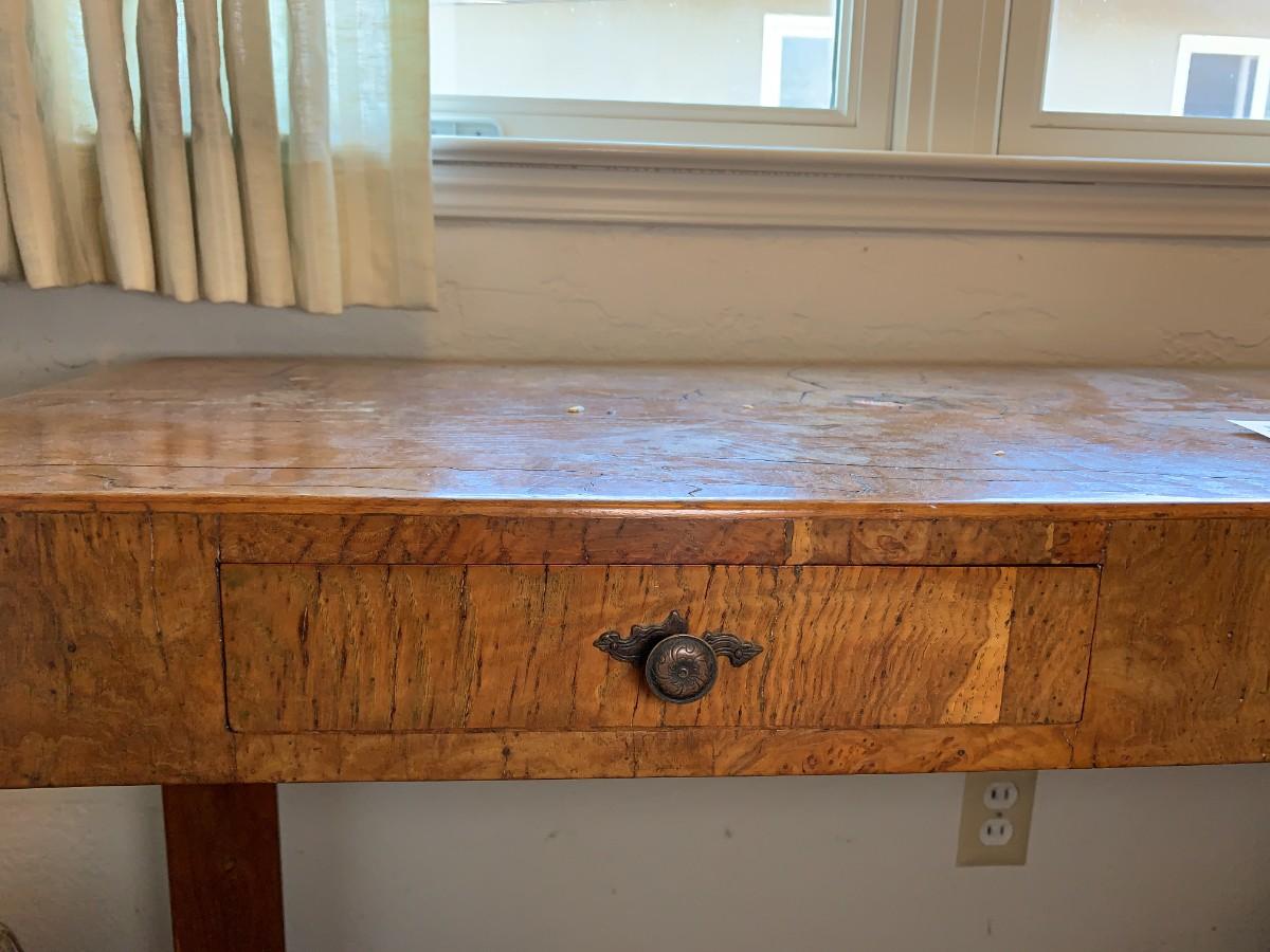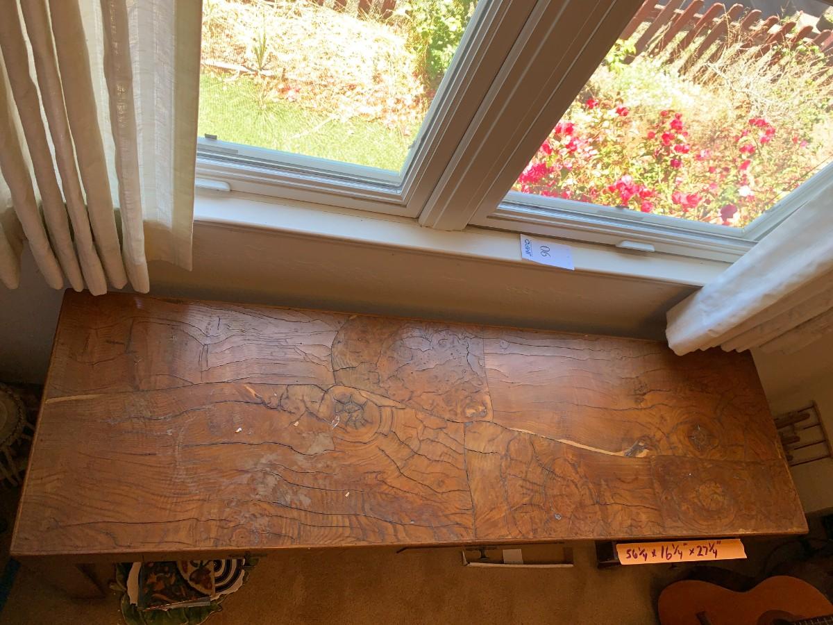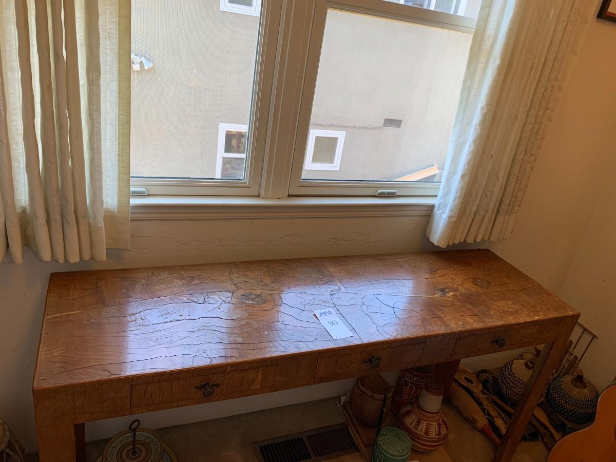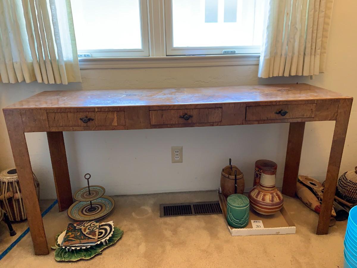 3 drawers. Does not include other items in photo. Crazing and cracks in wood. Approx 60" long