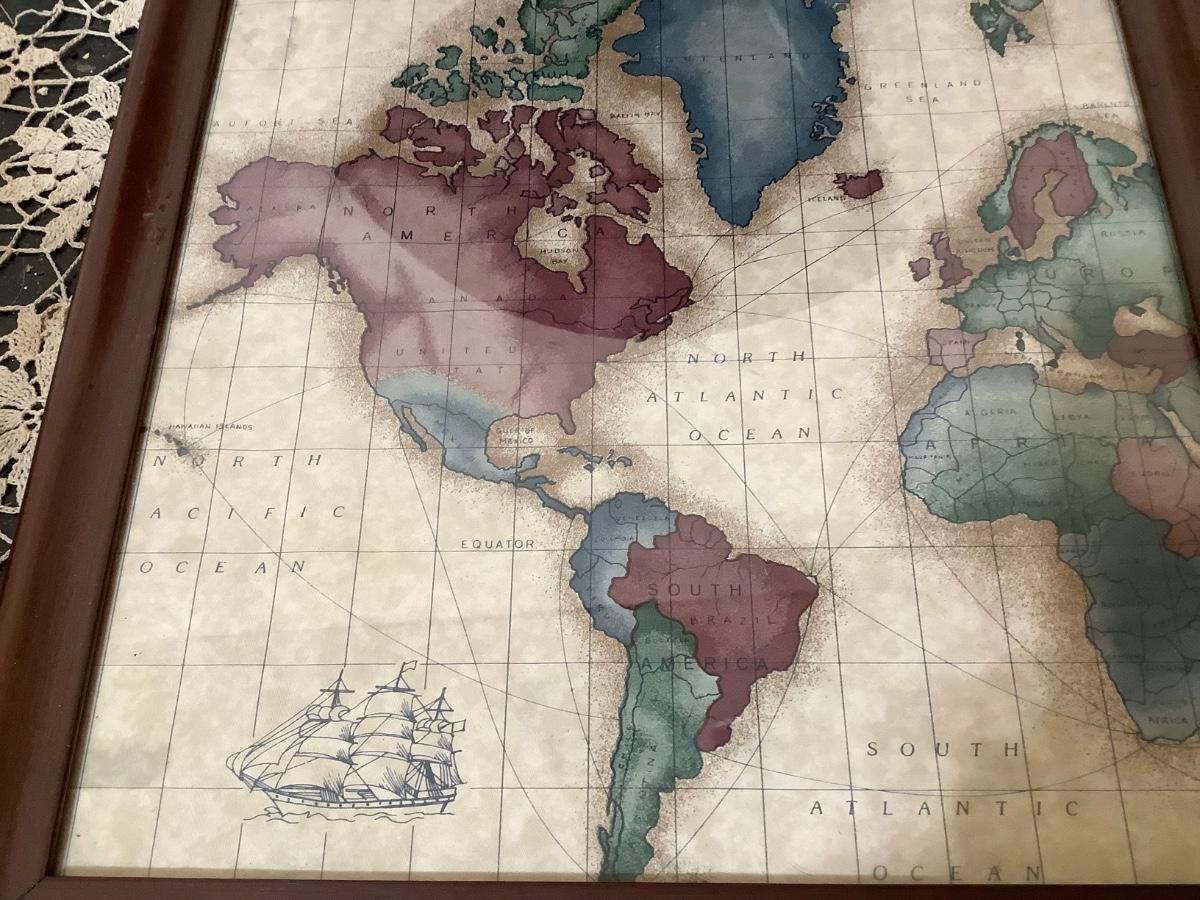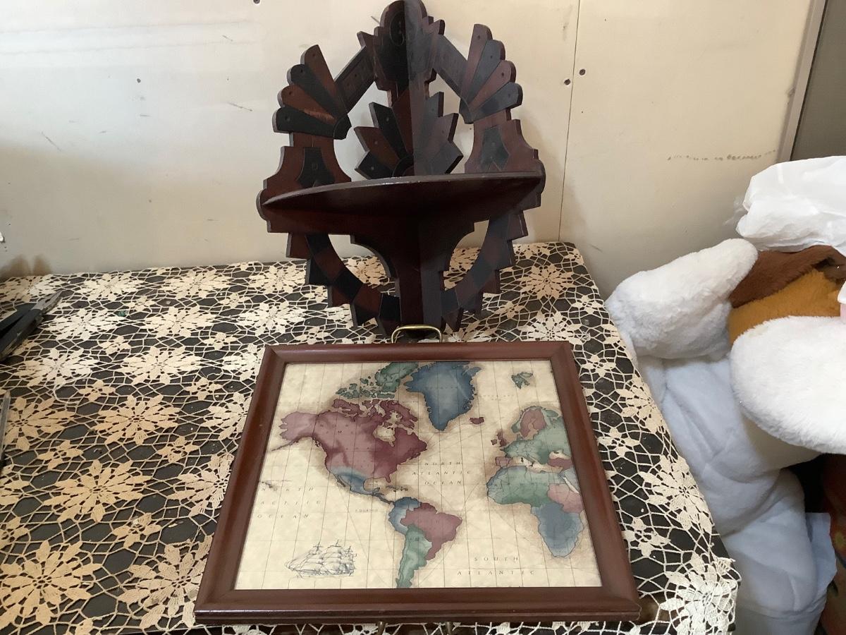 This is a great wood corner shelf, and a nice world map serving tray.