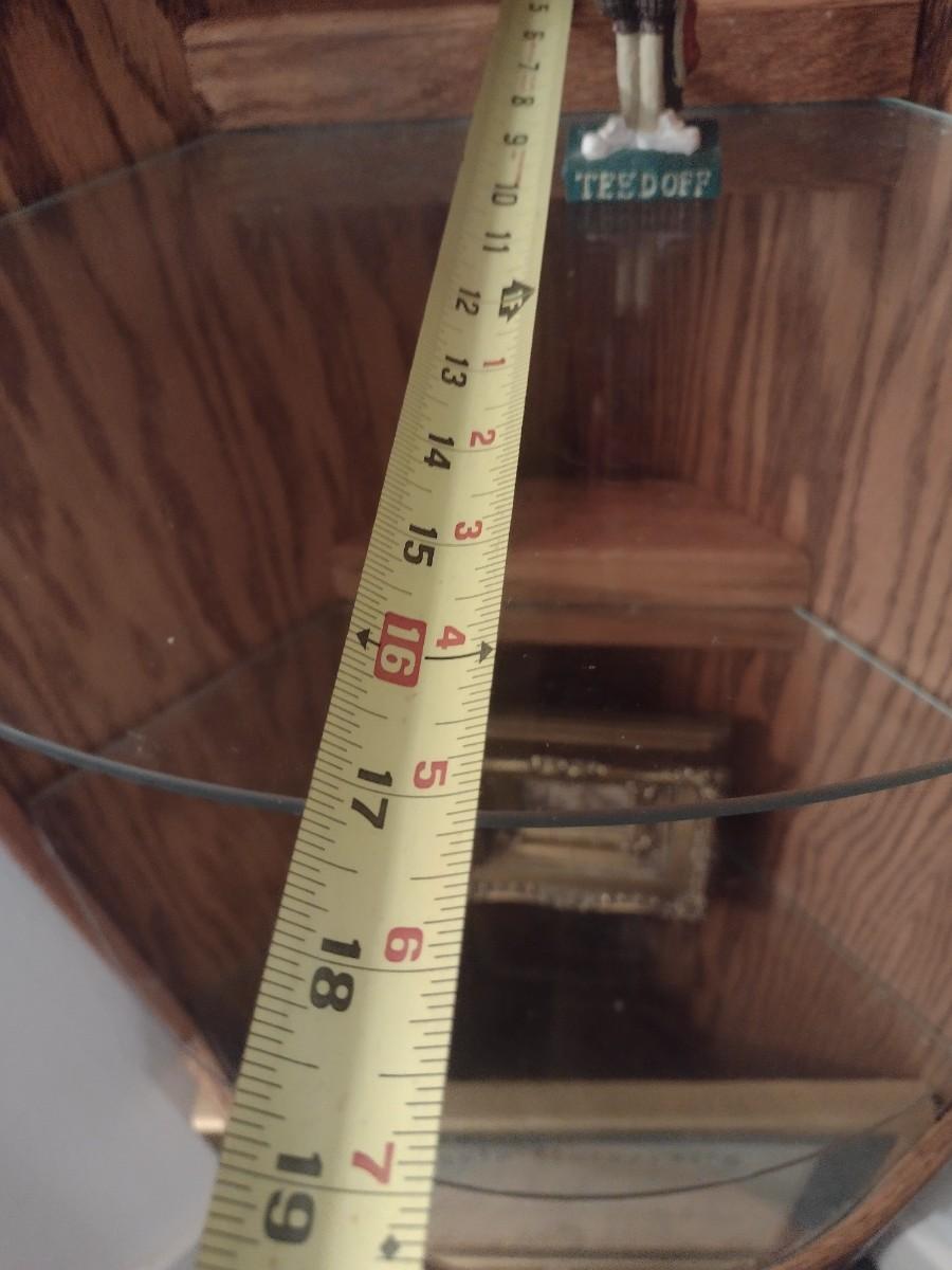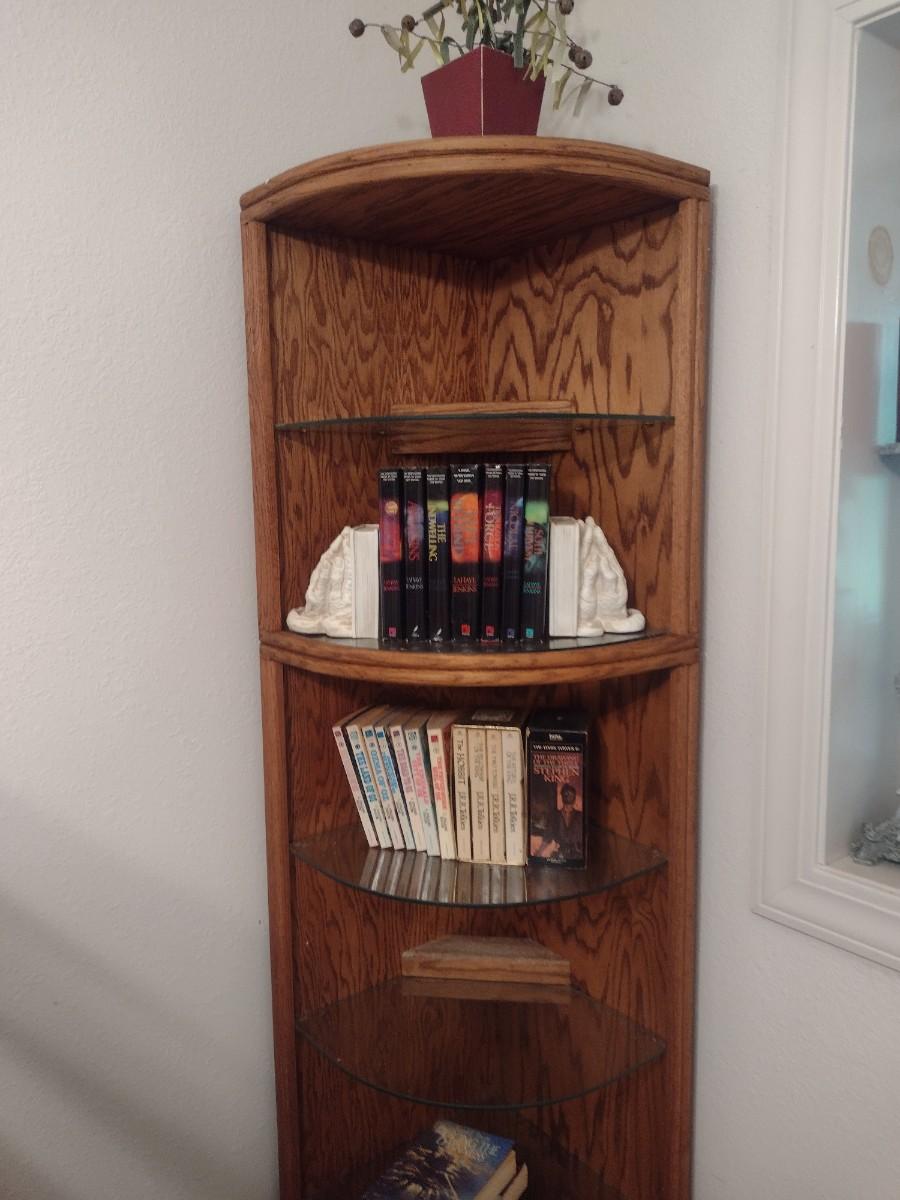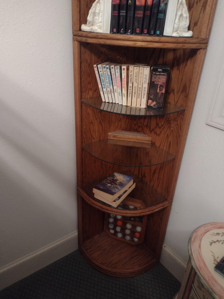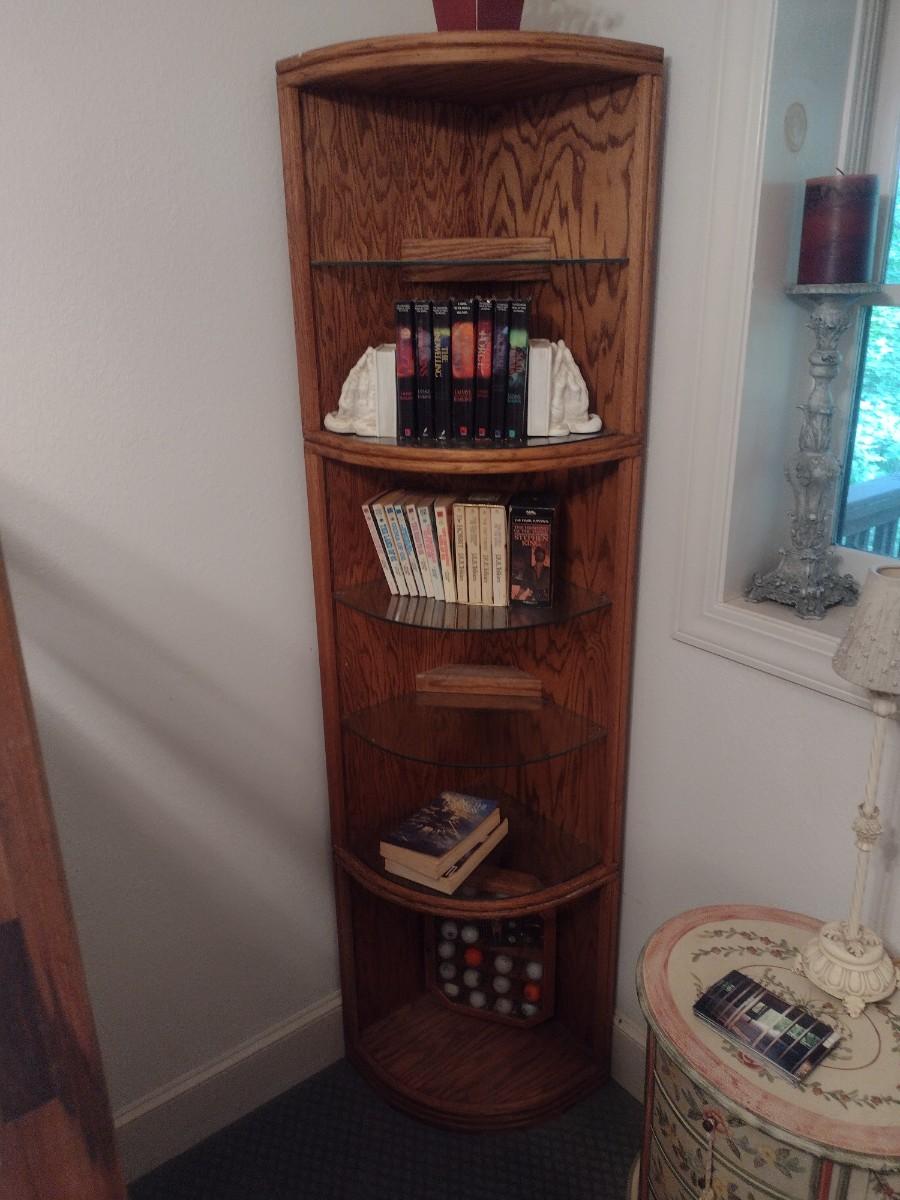 Wood Corner Storage Tower with Glass Inlay Shelves (No Contents) Choice A. Lower-level item. Bring assistance to carry item up the stairs to the main floor.