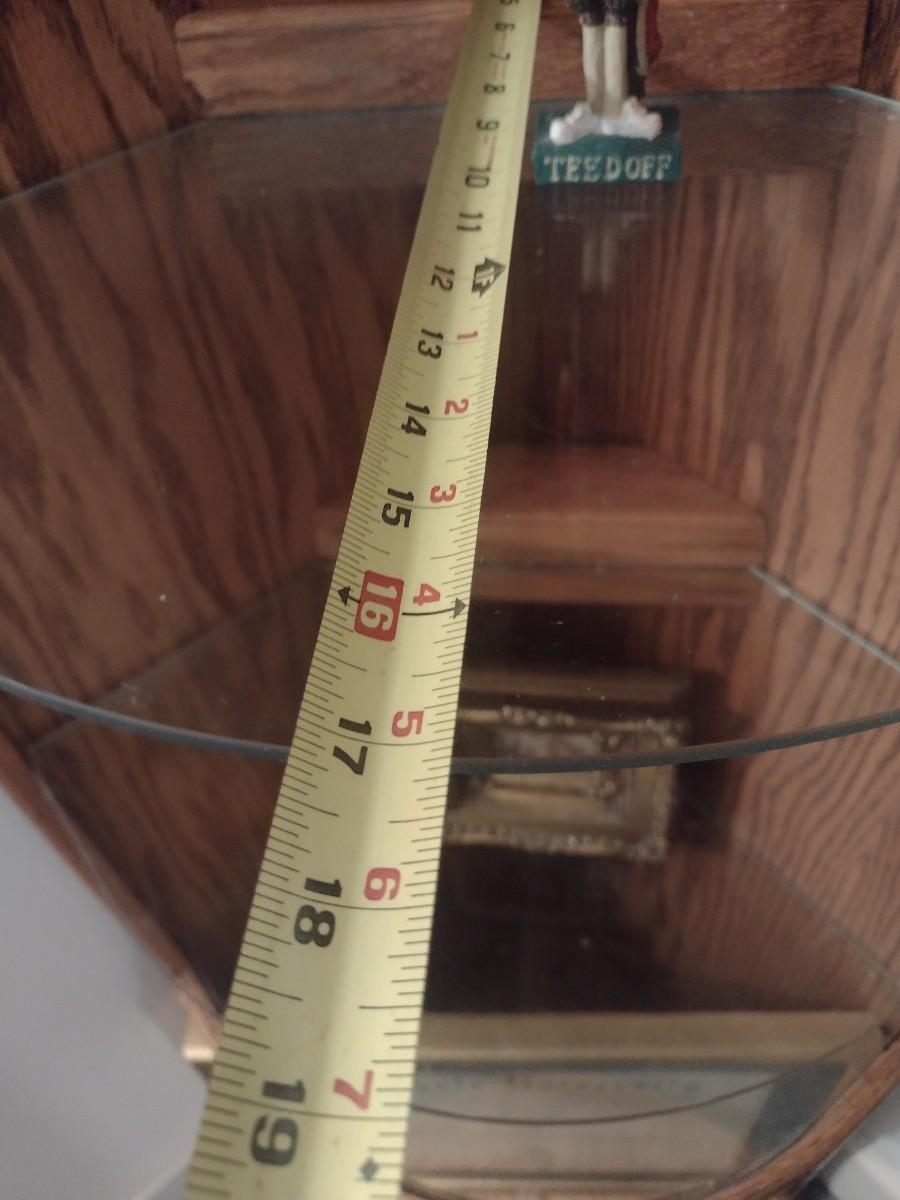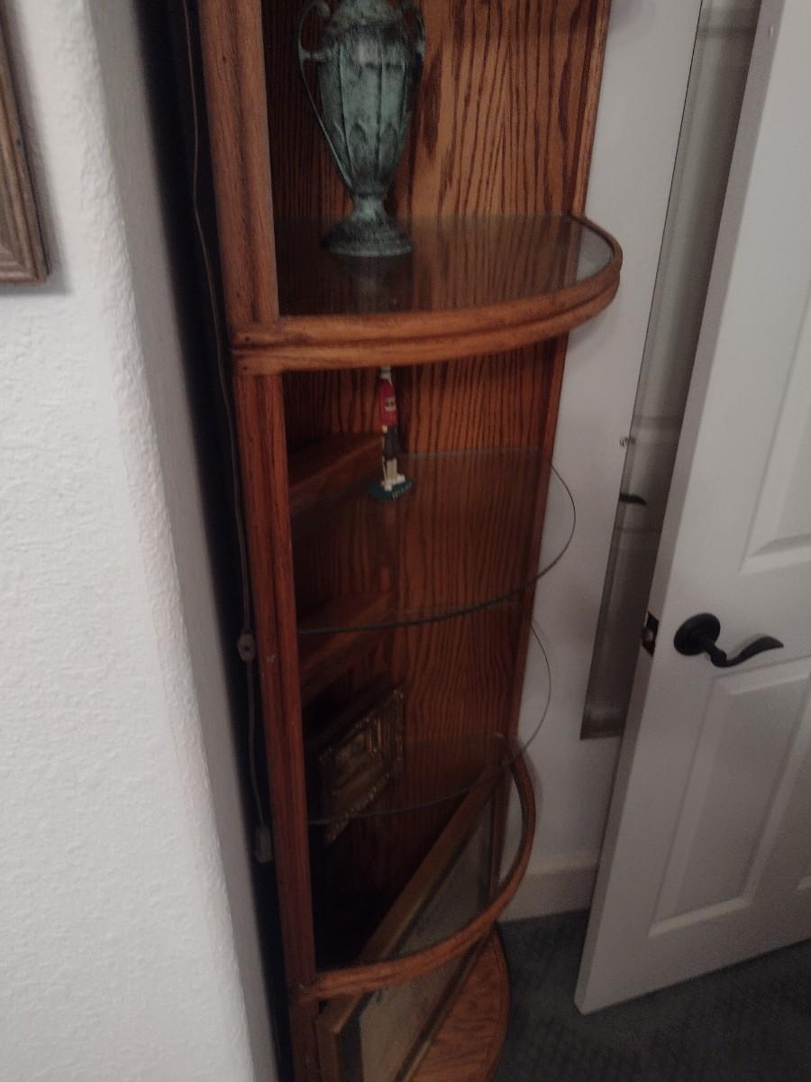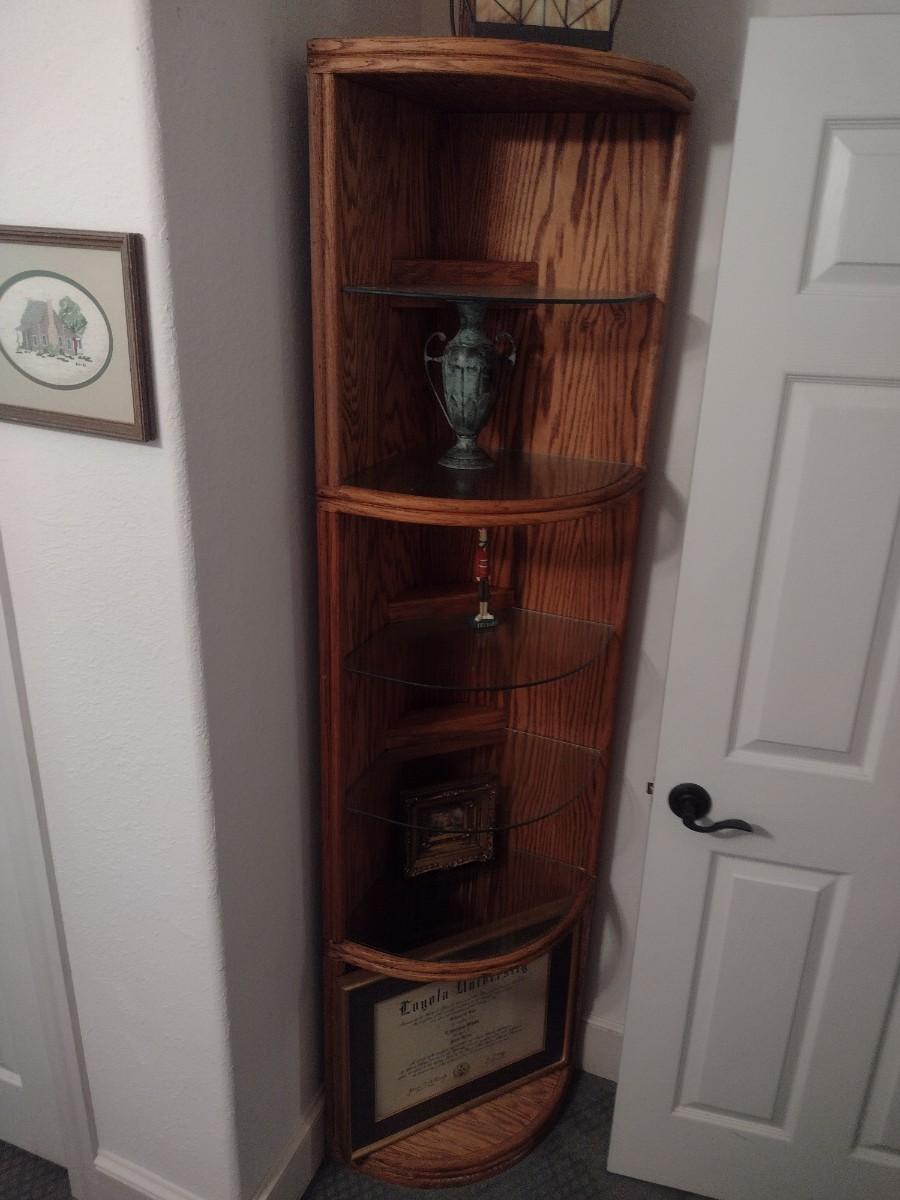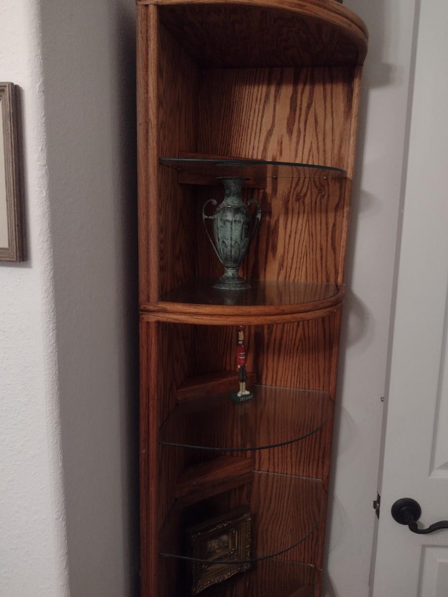 Wood Corner Storage Tower with Glass Inlay Shelves (No Contents) Choice B. Lower-level item. Bring assistance to carry item up the stairs to the main floor.