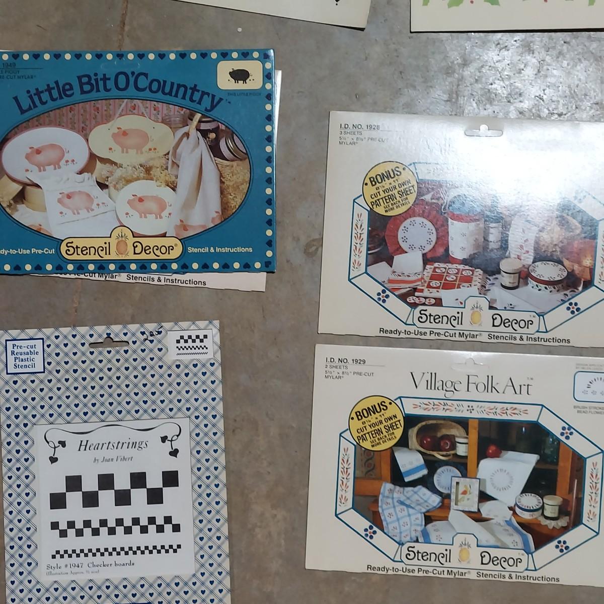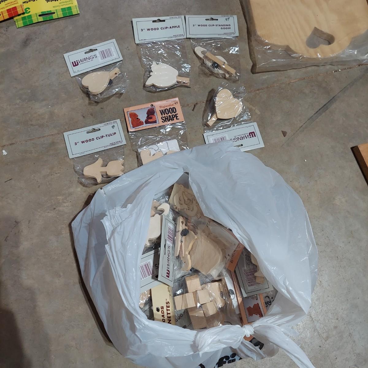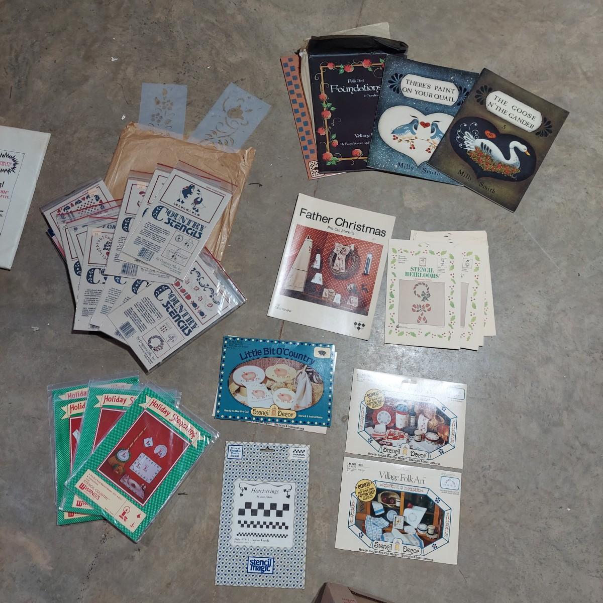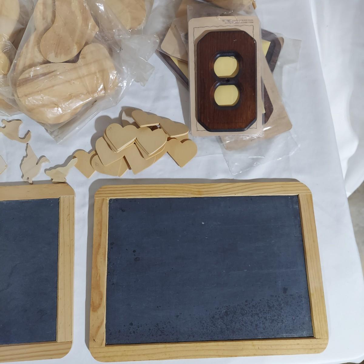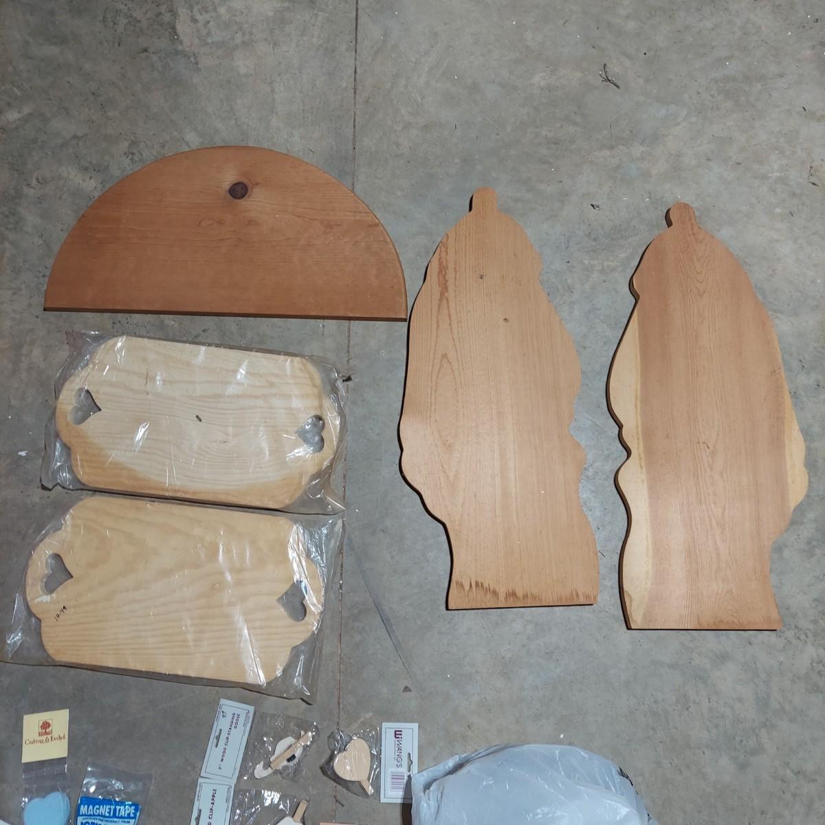 Lot includes several wood craft pieces as well as stencils and stencil painting brushes. The wood board with cutouts is 23” x 14”. The wooden carrying crate is 9” x 6” x 10"H. Please see photos for details. Local Pickup Only