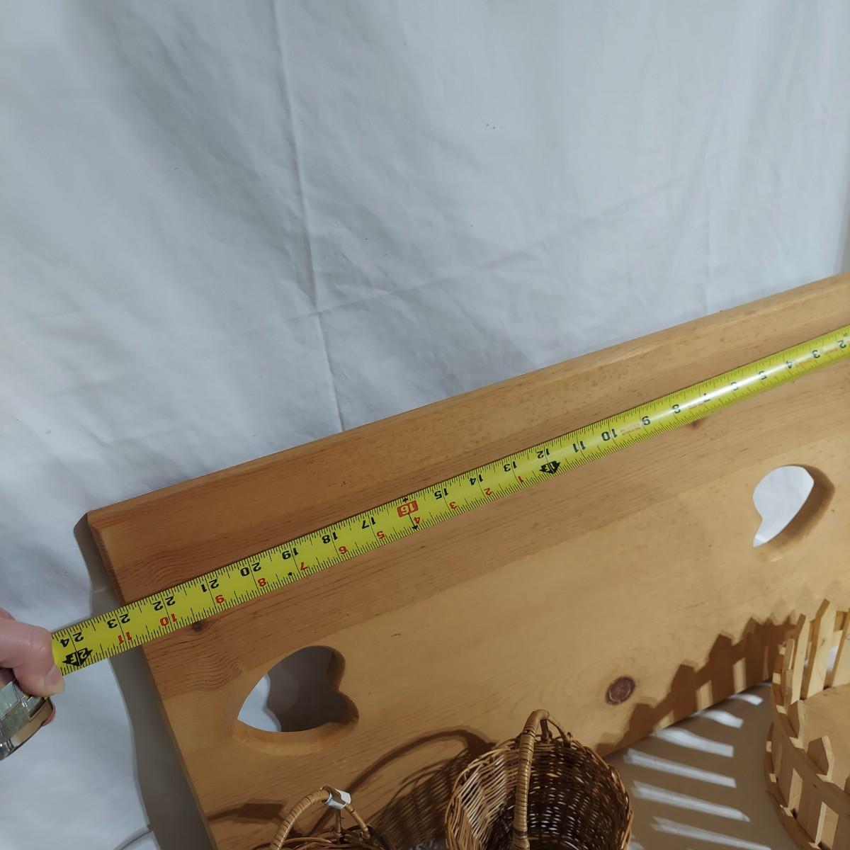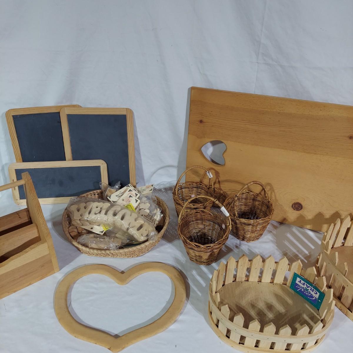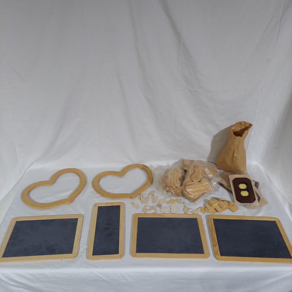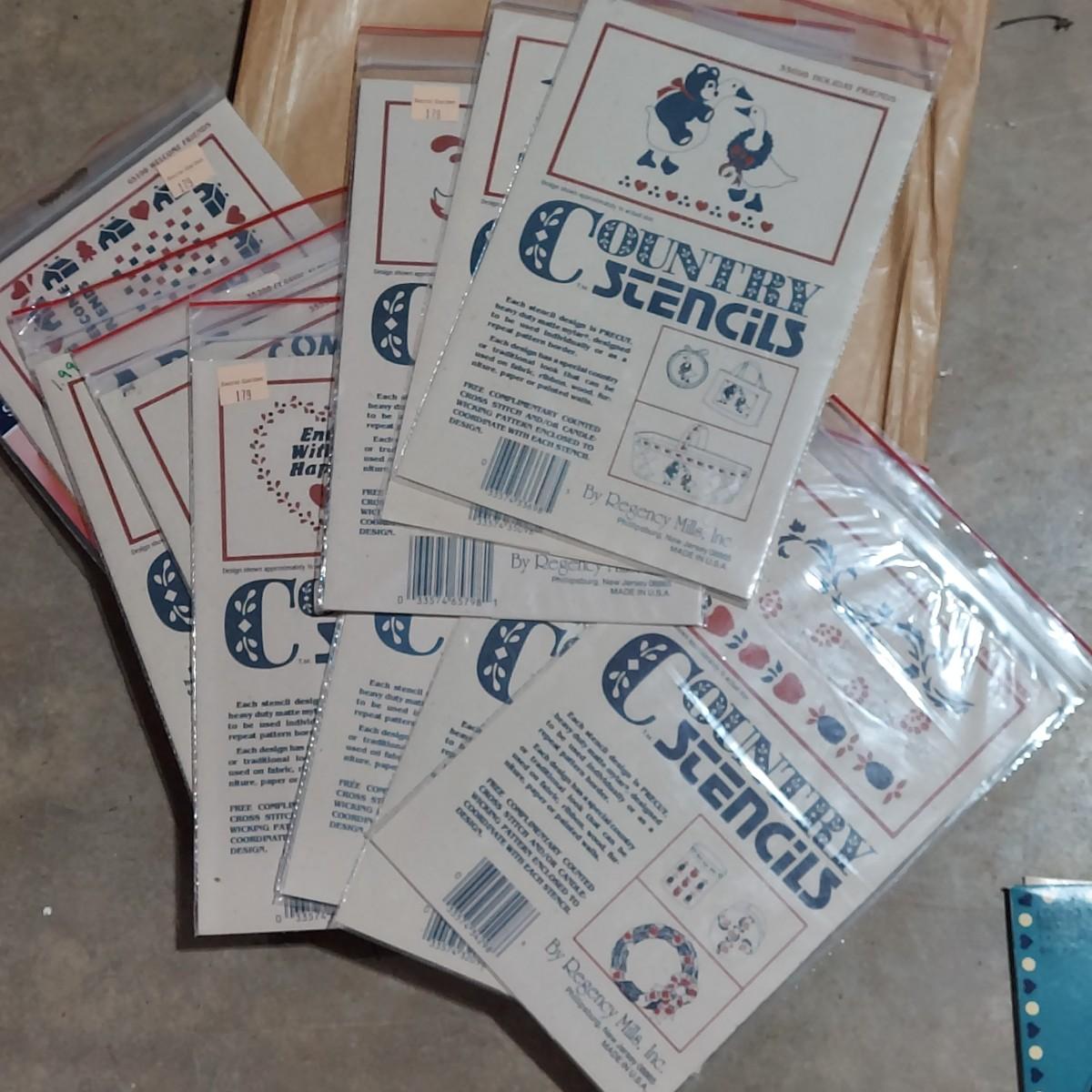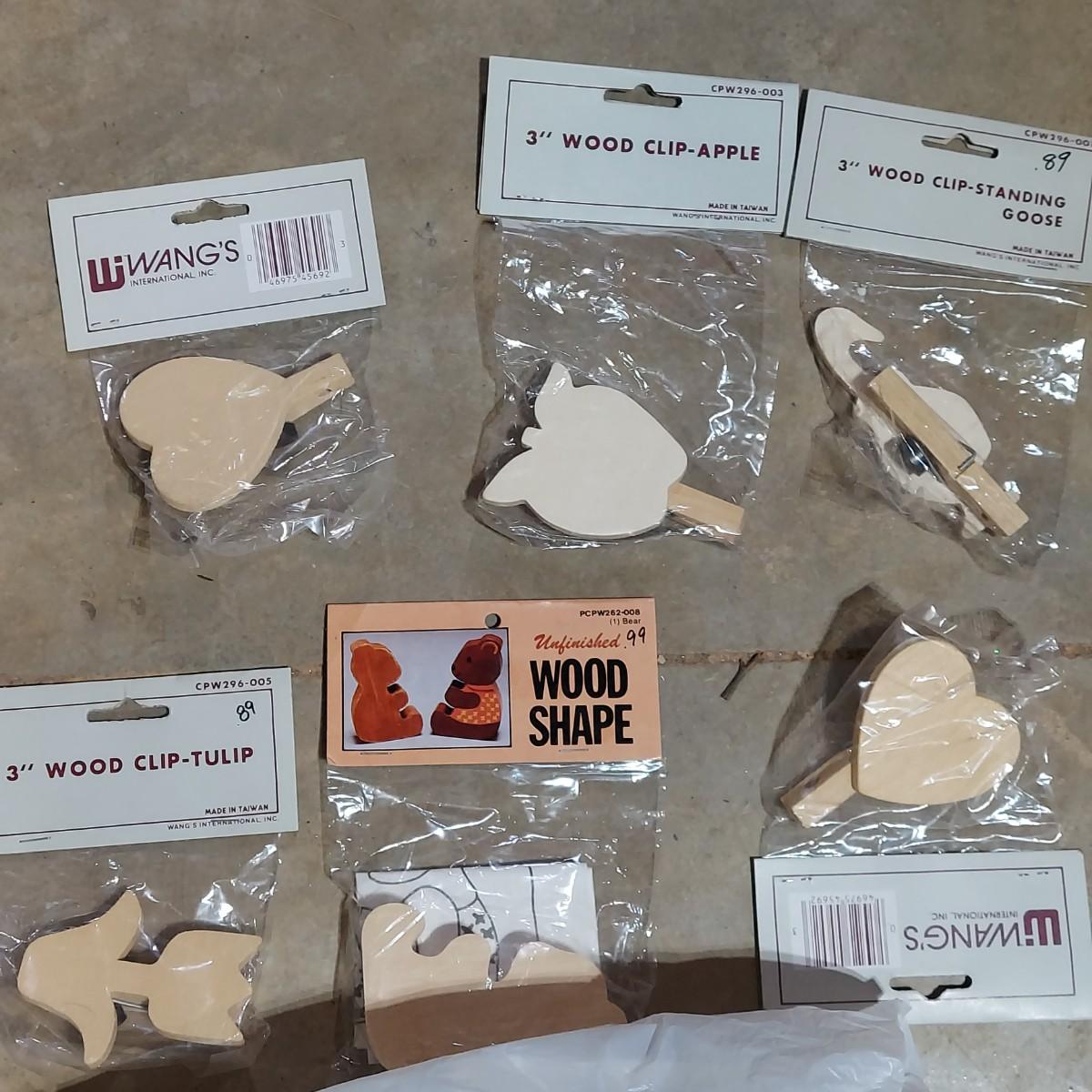 Lot includes several wood craft pieces as well as stencils and stencil painting brushes. The wood board with cutouts is 23” x 14”. The wooden carrying crate is 9” x 6” x 10"H. Please see photos for details. Local Pickup Only