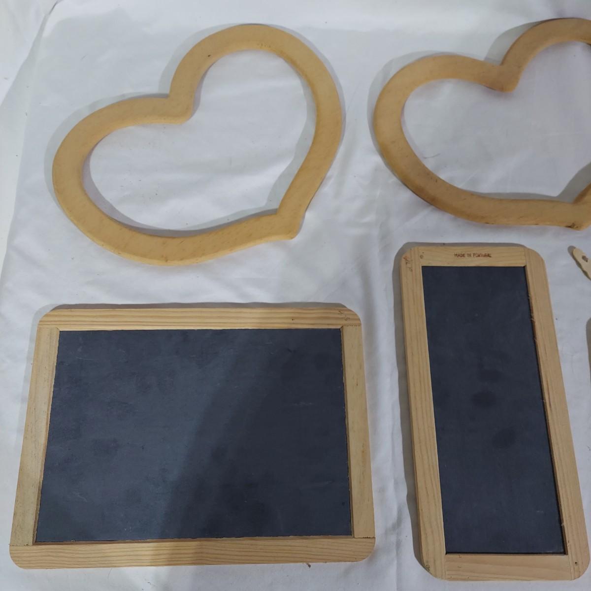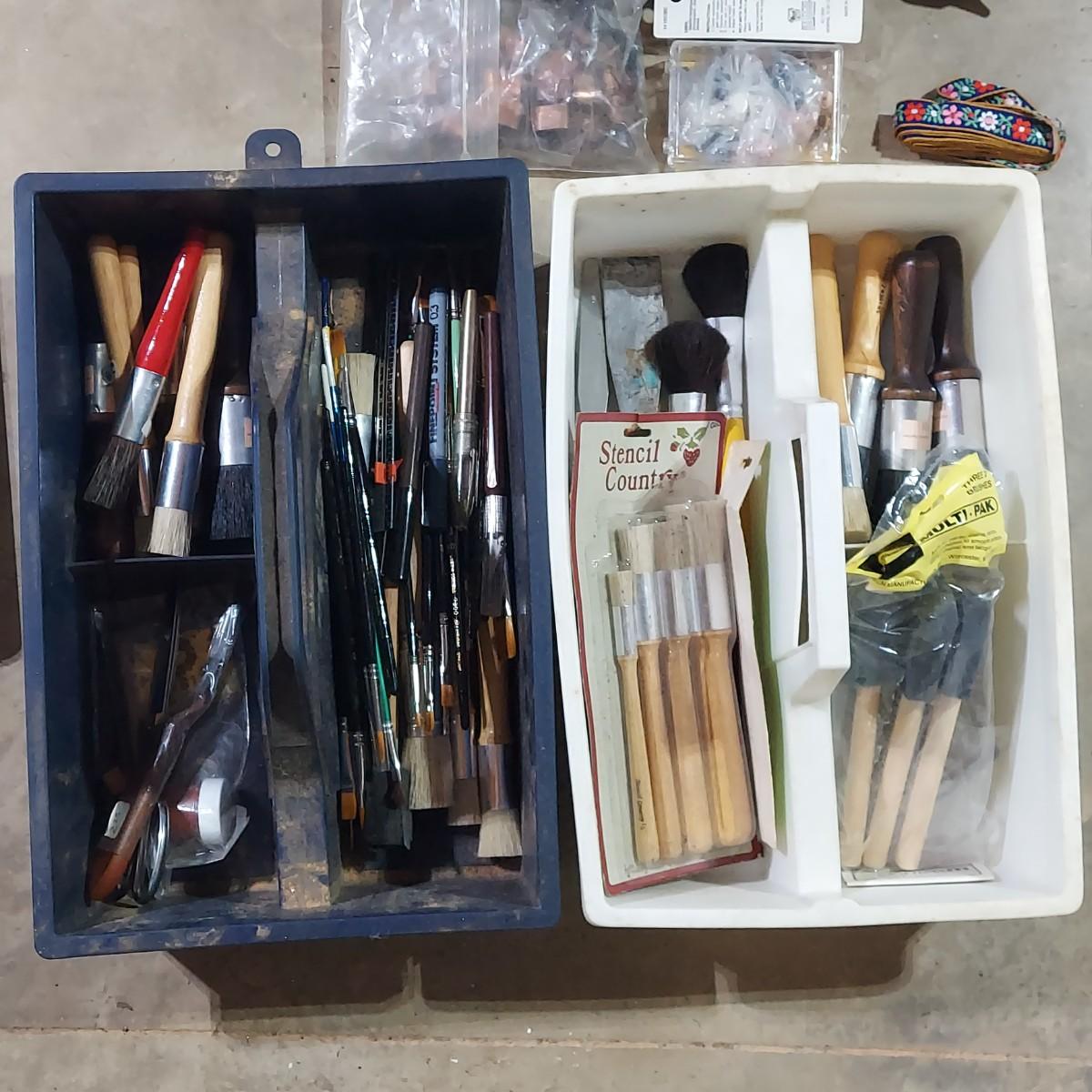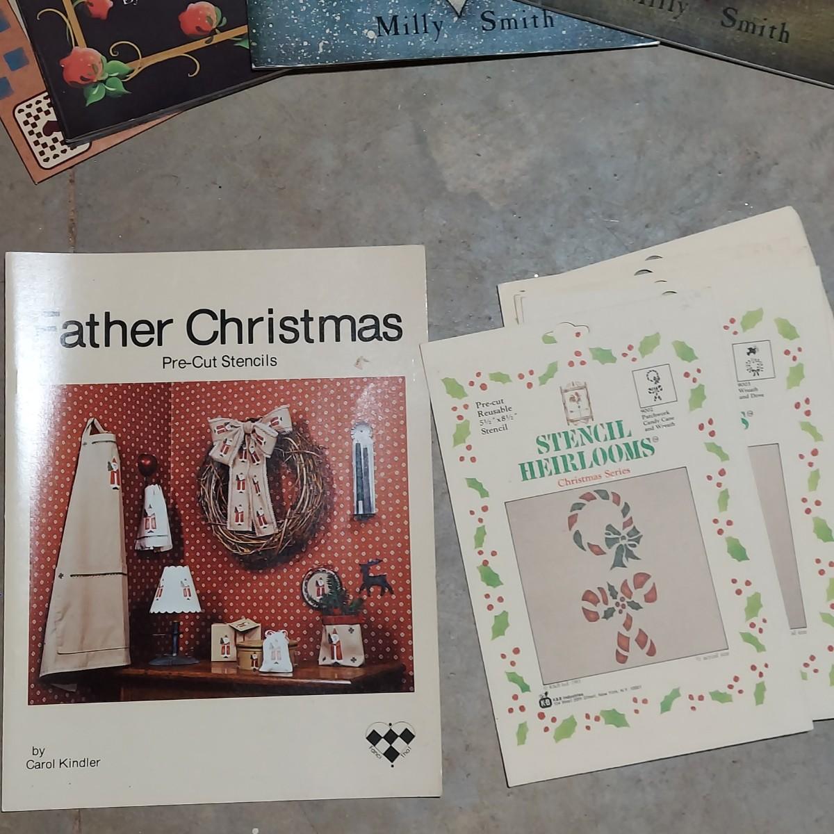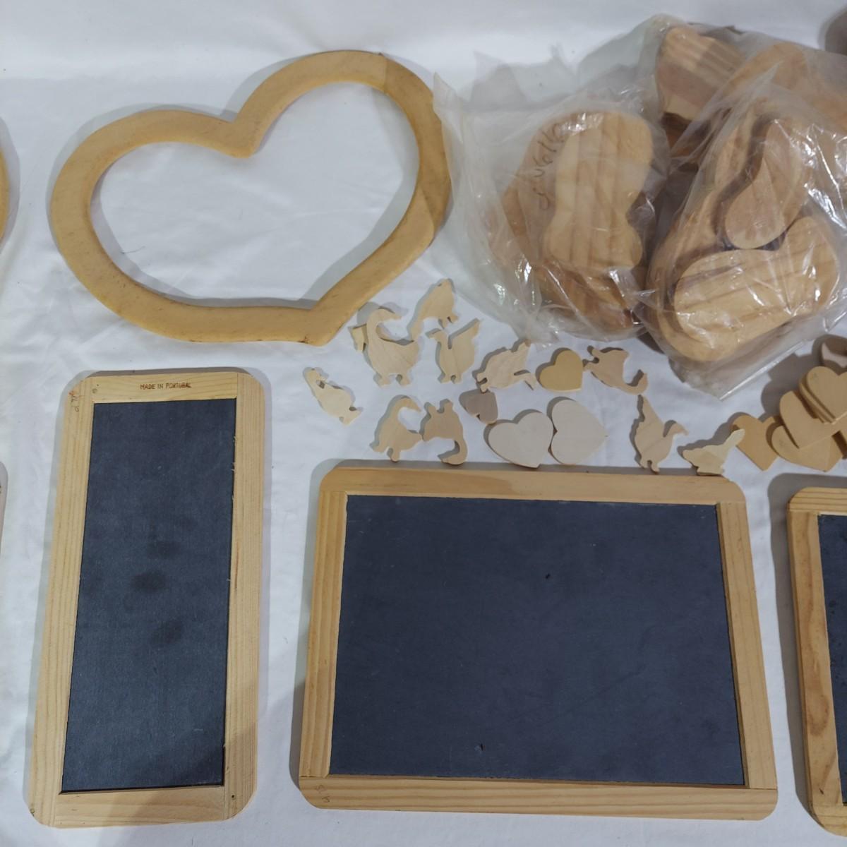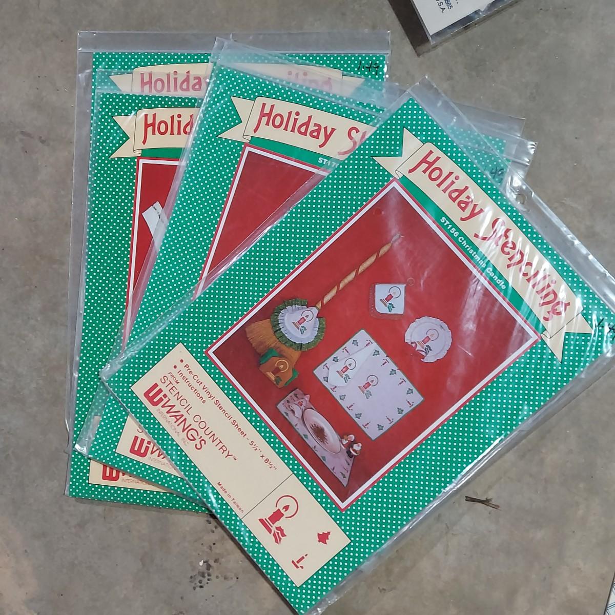 Lot includes several wood craft pieces as well as stencils and stencil painting brushes. The wood board with cutouts is 23” x 14”. The wooden carrying crate is 9” x 6” x 10"H. Please see photos for details. Local Pickup Only