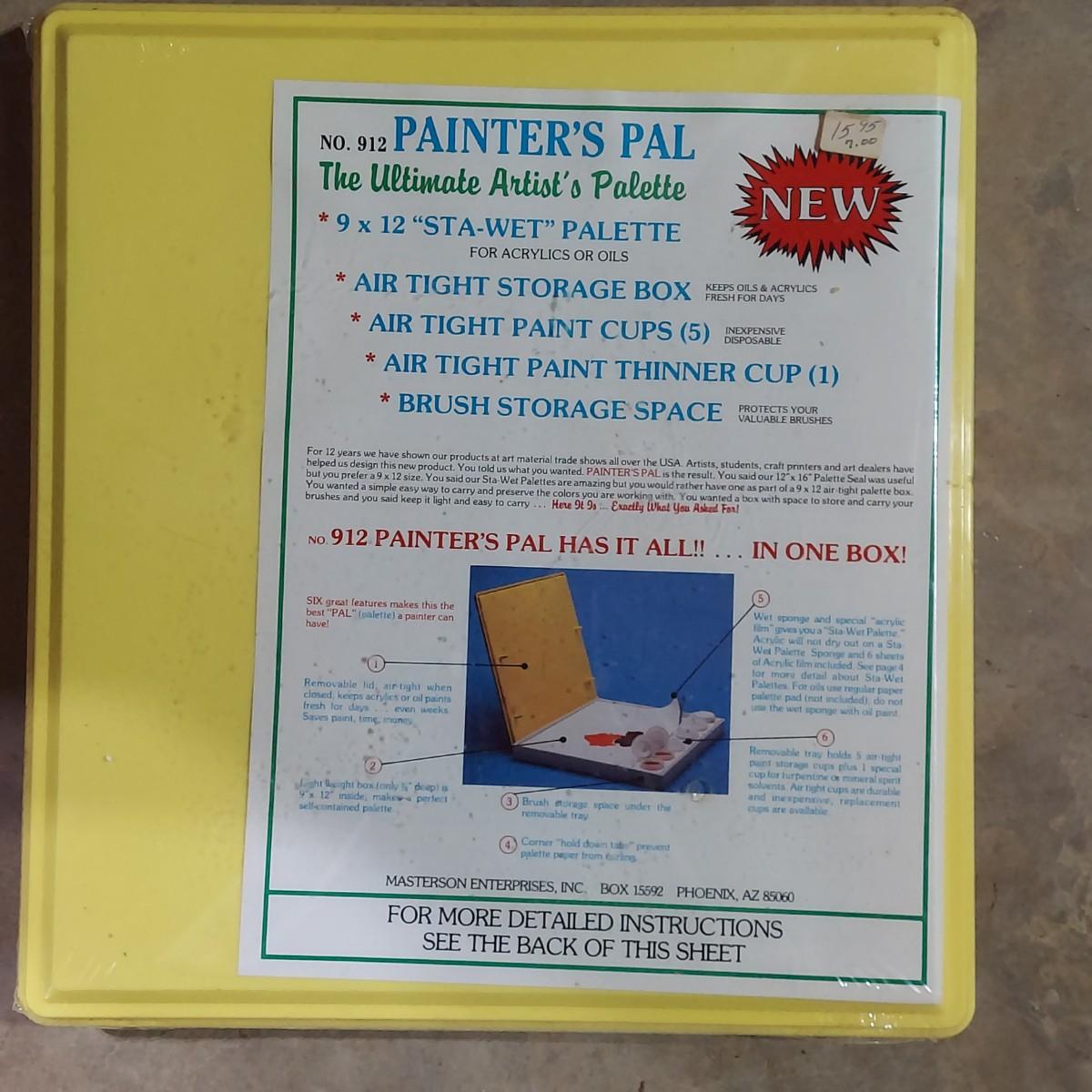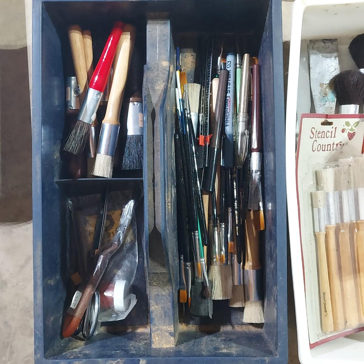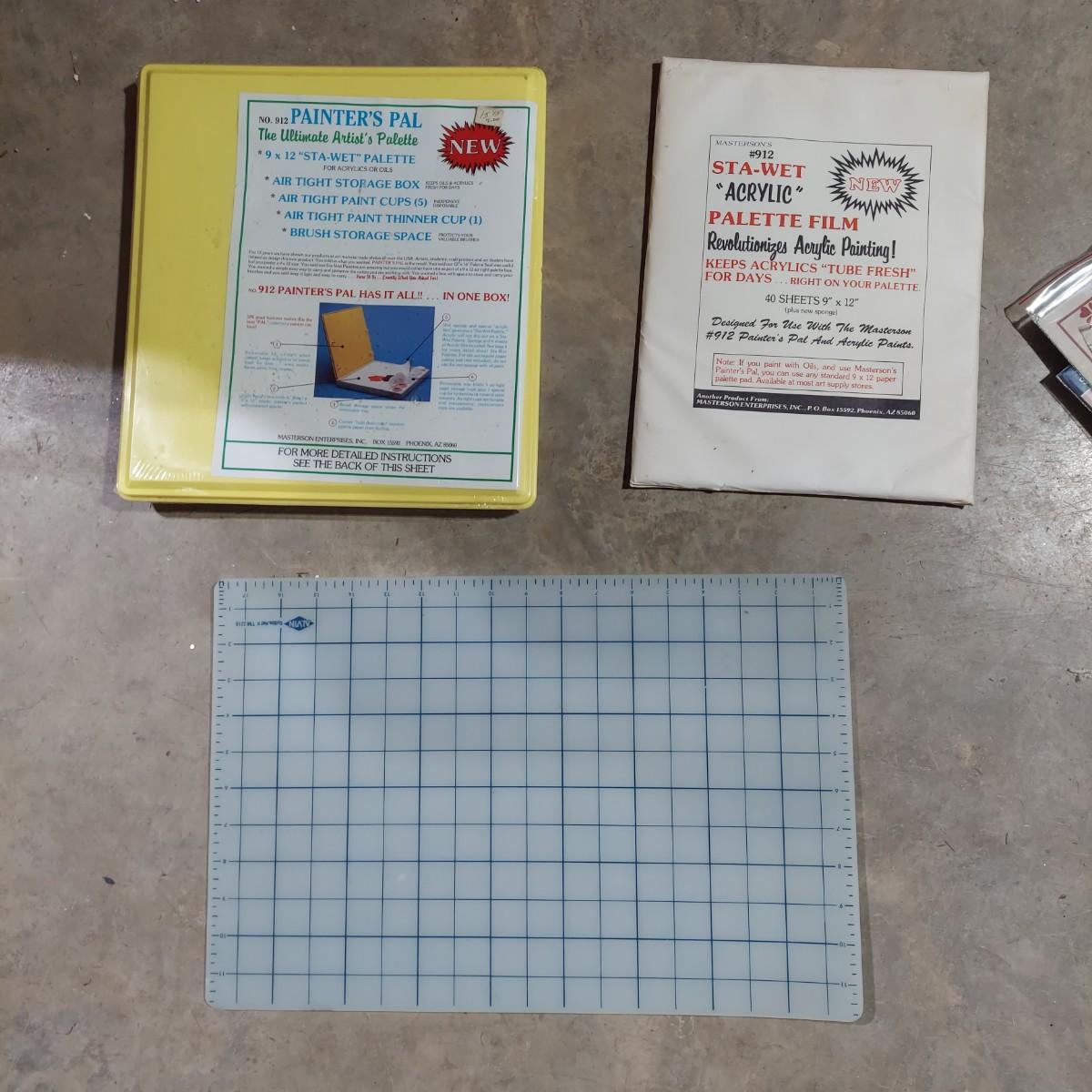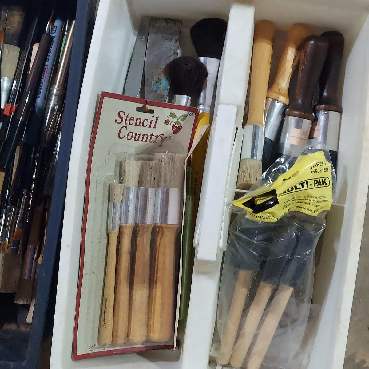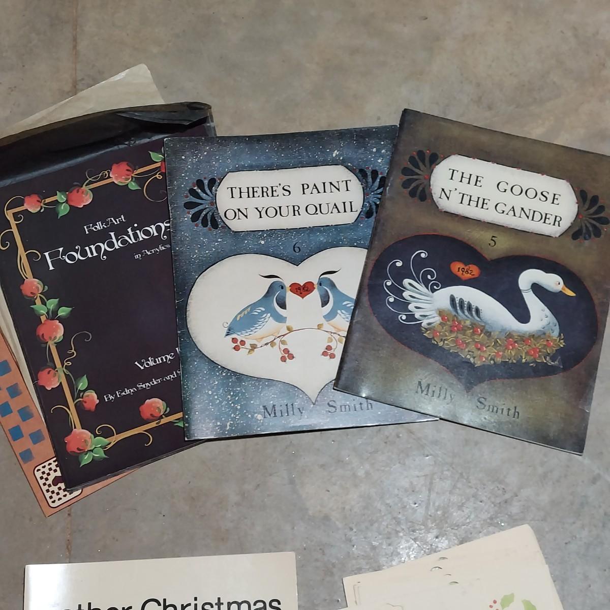 Lot includes several wood craft pieces as well as stencils and stencil painting brushes. The wood board with cutouts is 23” x 14”. The wooden carrying crate is 9” x 6” x 10"H. Please see photos for details. Local Pickup Only