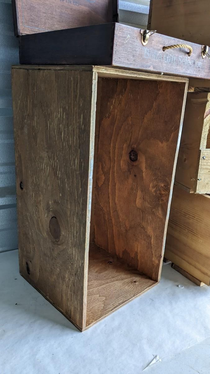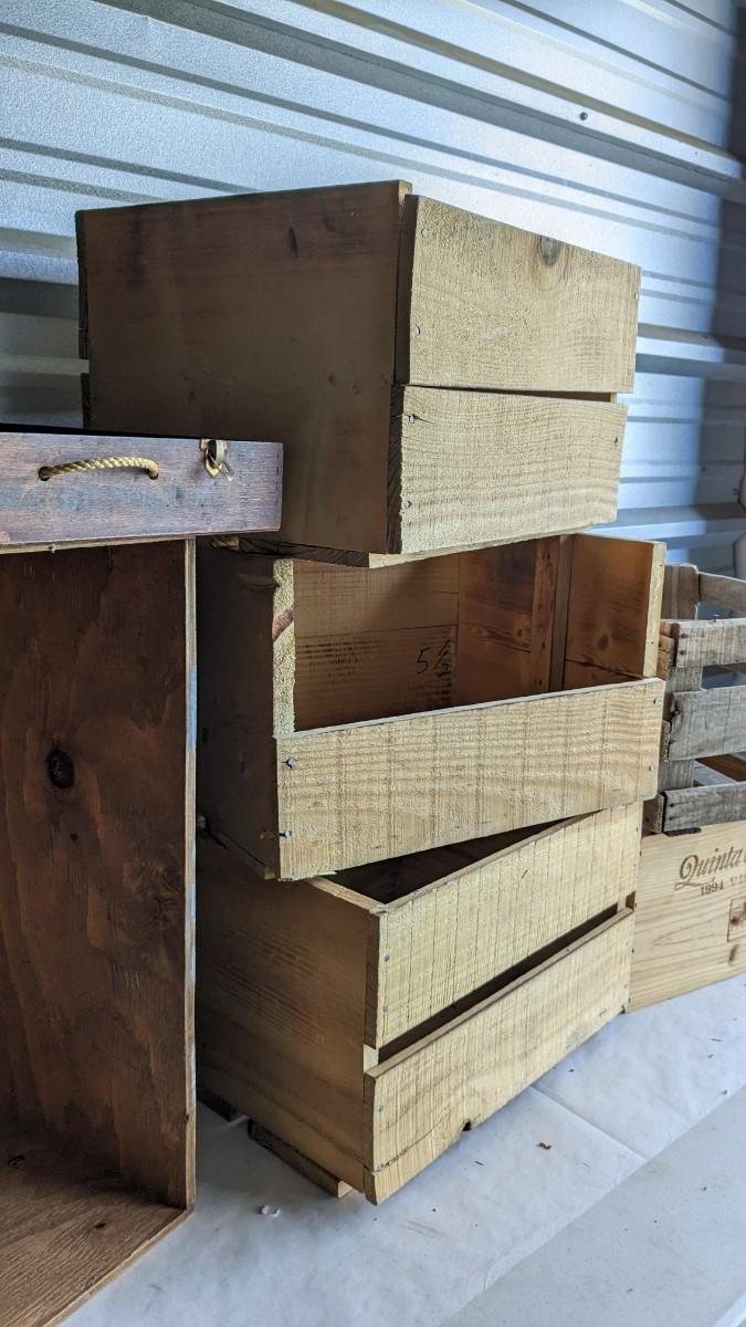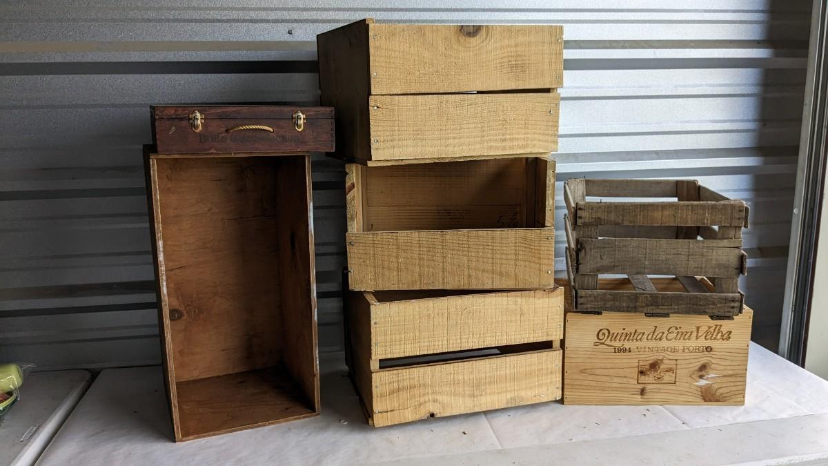a nice little assortment of wood crates for storage, display, or crafting. One is missing a panel, see in photos. No shipping. 2616
