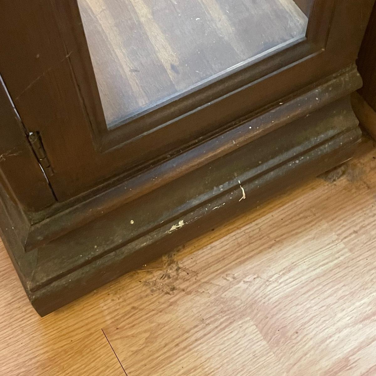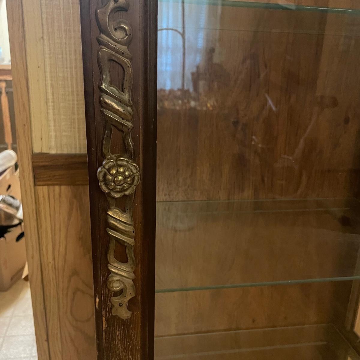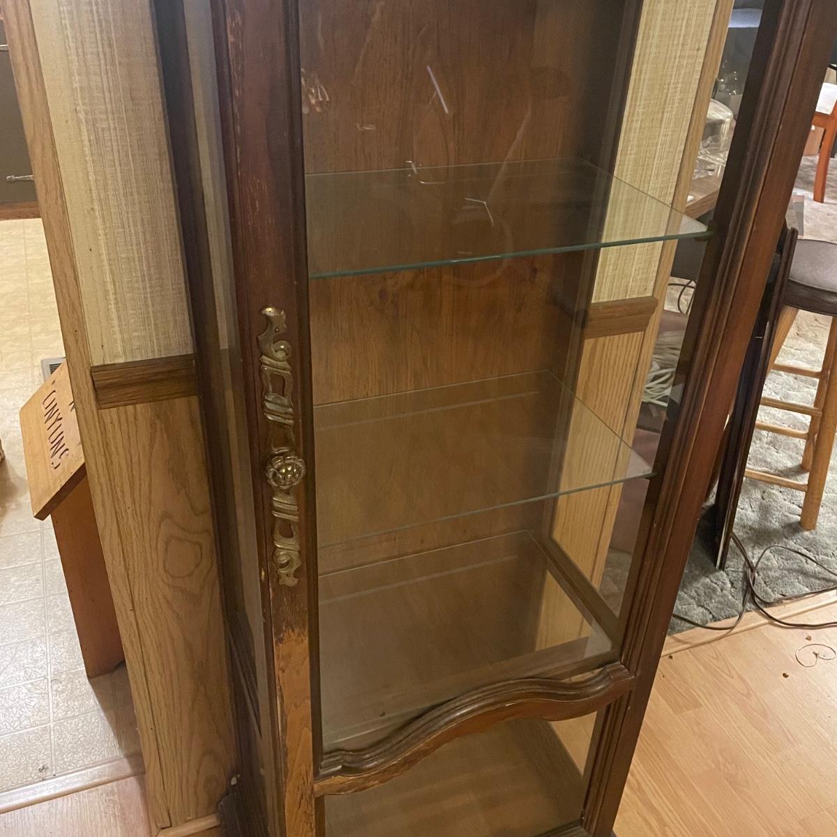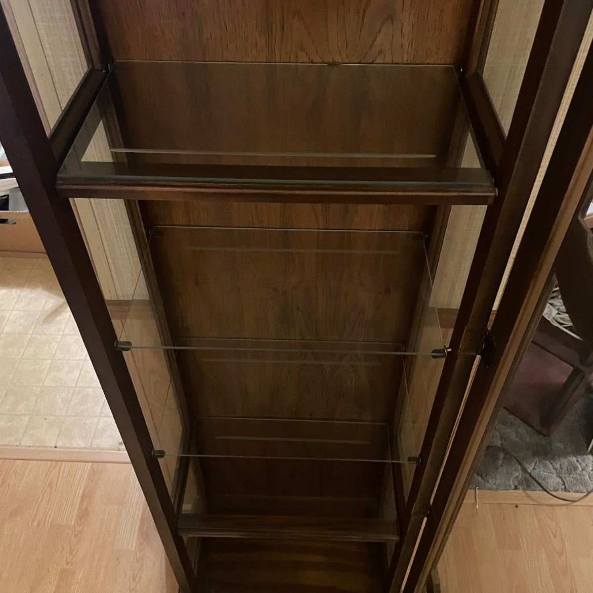 This slim solid wood curio cabinet has a light and four glass shelves with plate rails. It is in fair condition with some wearing of the varnish, scuff and paint marks shown in images.