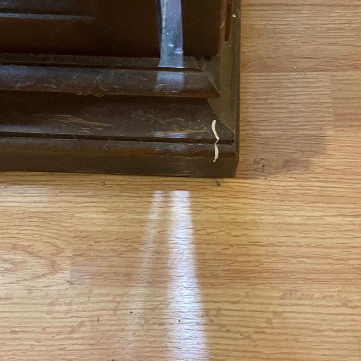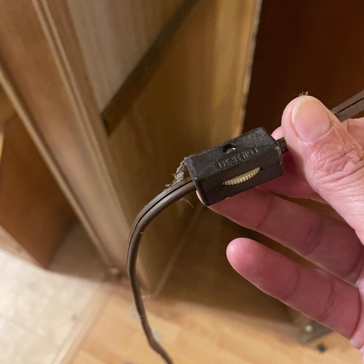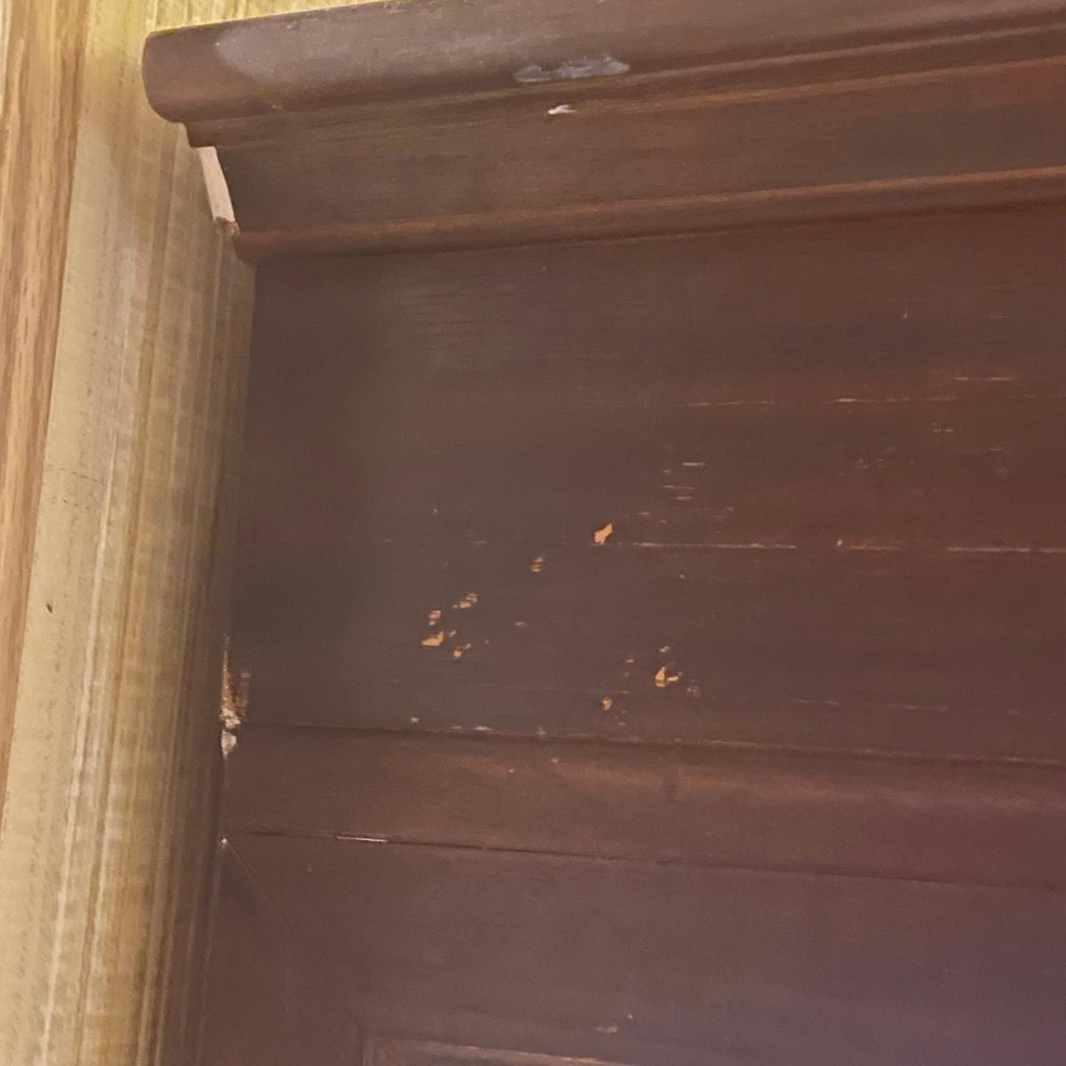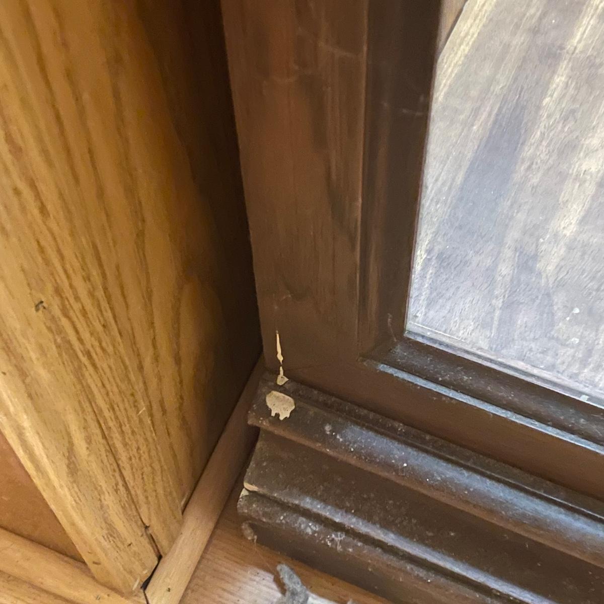 This slim solid wood curio cabinet has a light and four glass shelves with plate rails. It is in fair condition with some wearing of the varnish, scuff and paint marks shown in images.