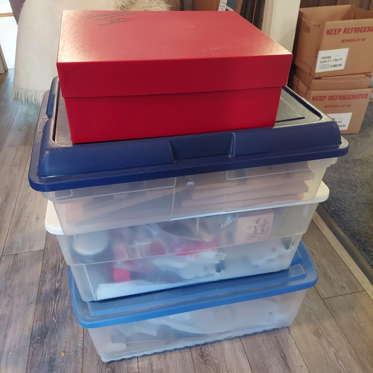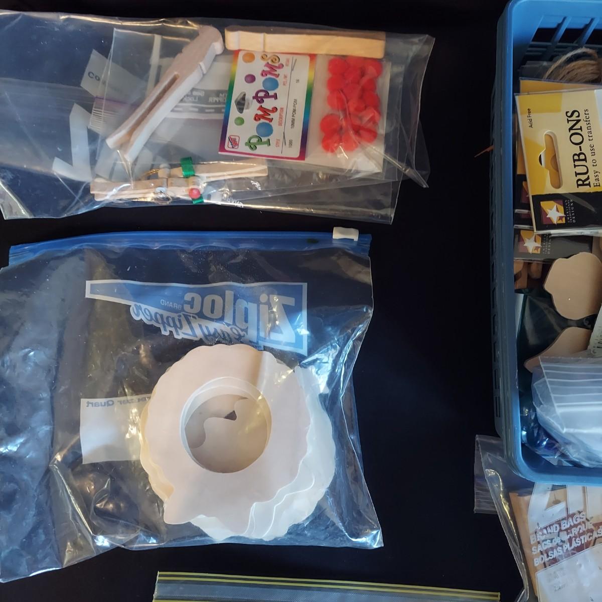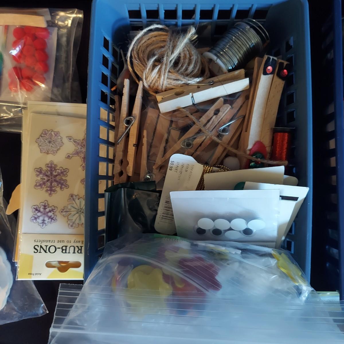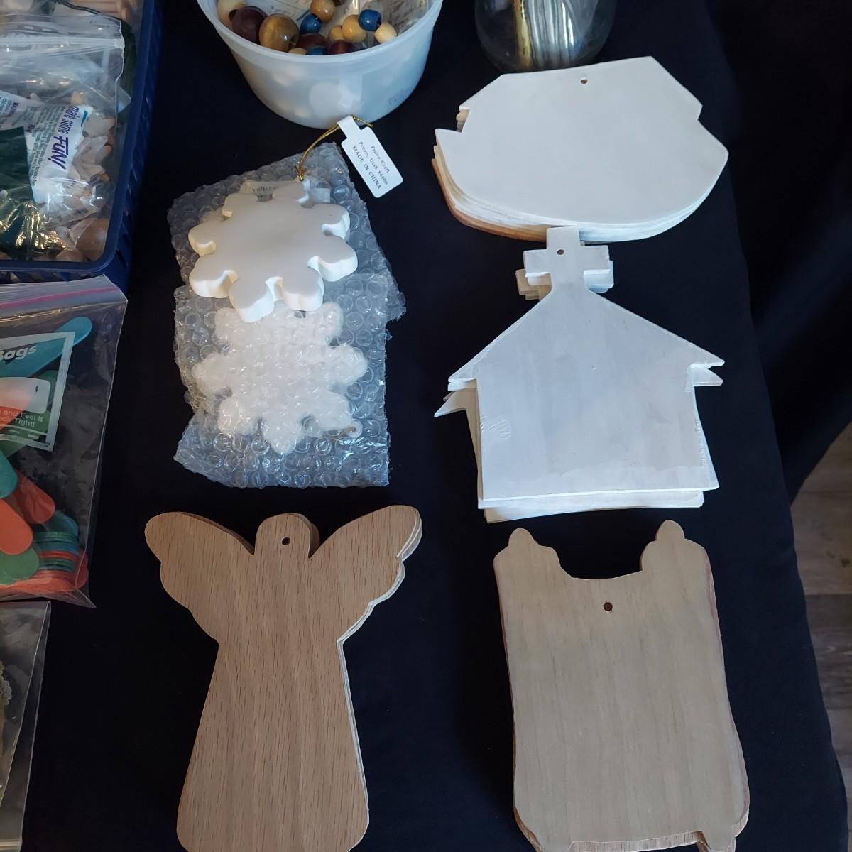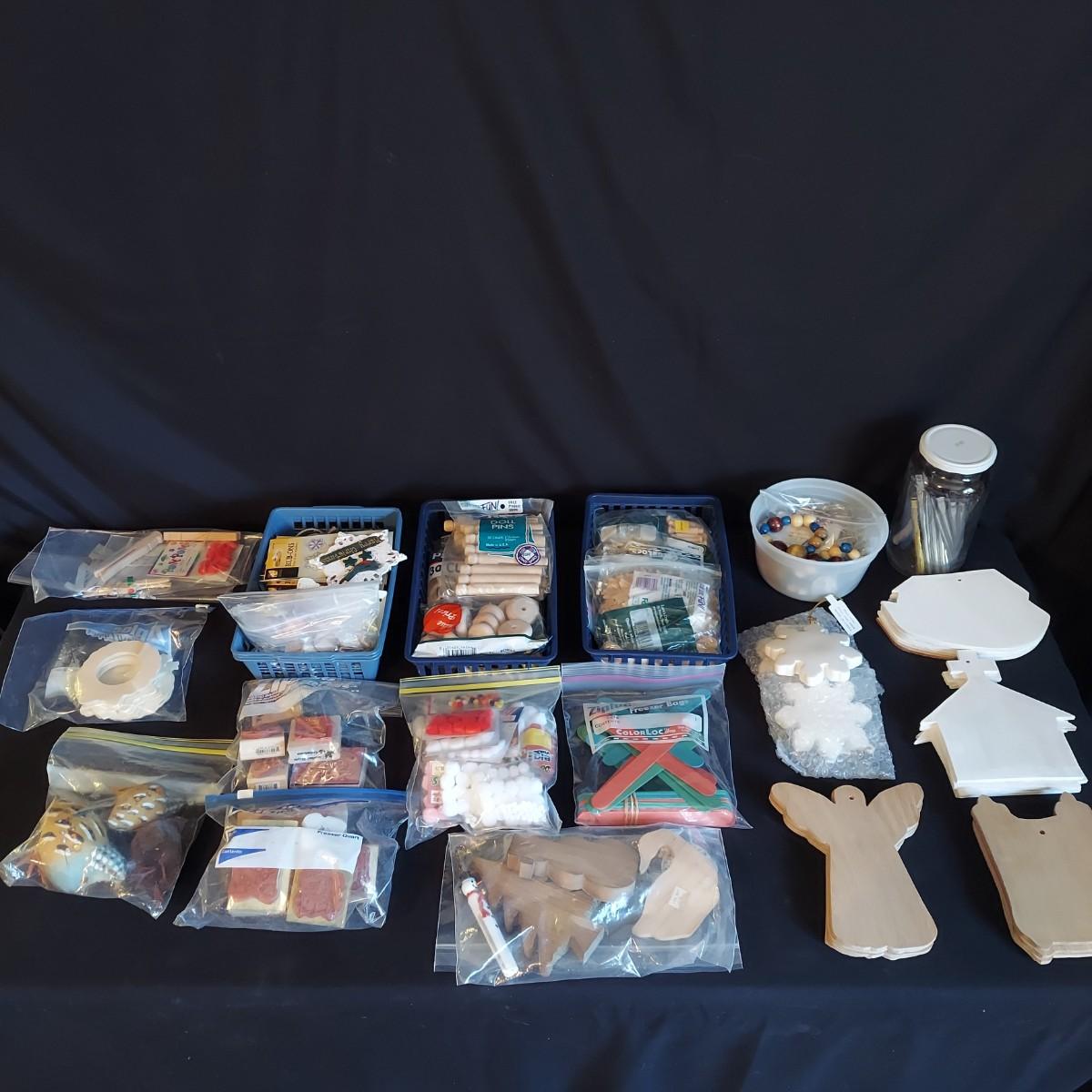 Lot includes four medium bins and one small box full of craft supplies. There are several different cut wood shapes relating to holidays. There are some Christmas ornaments as well. Local Pickup Only.
