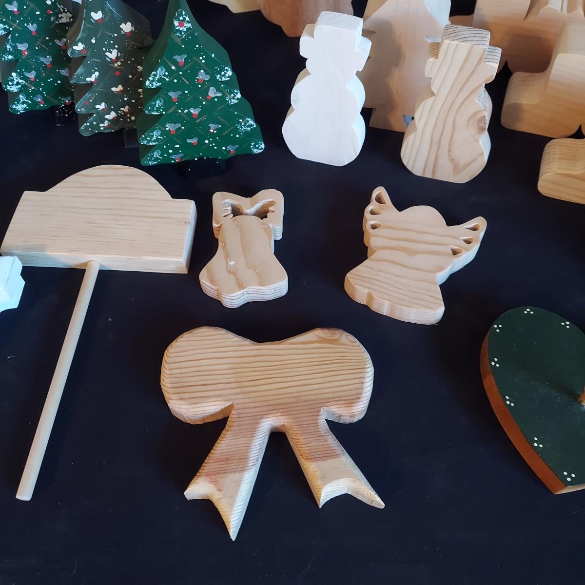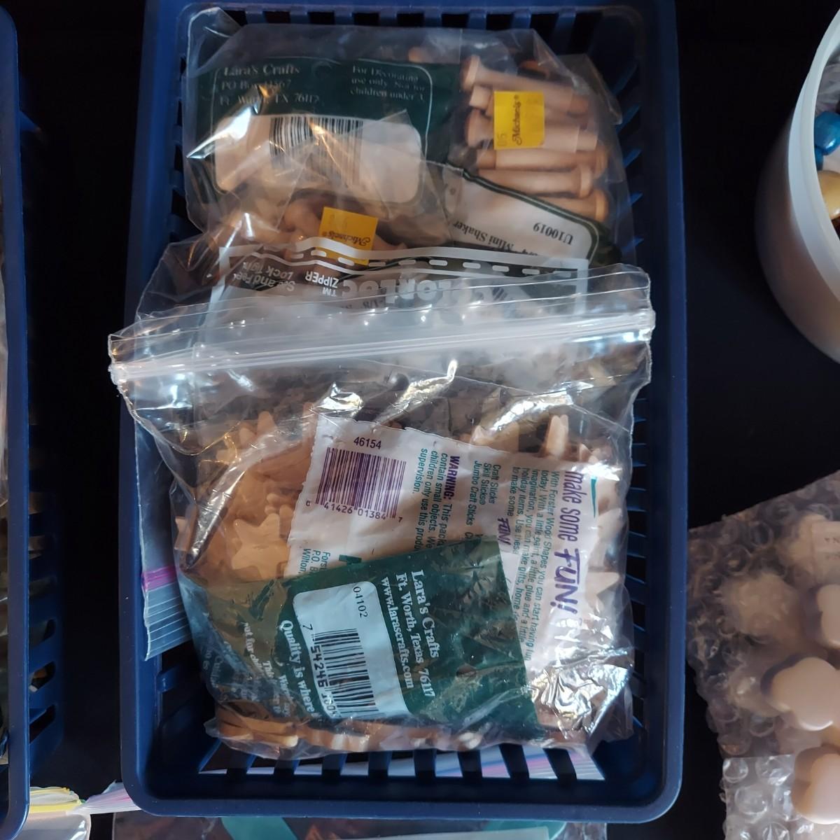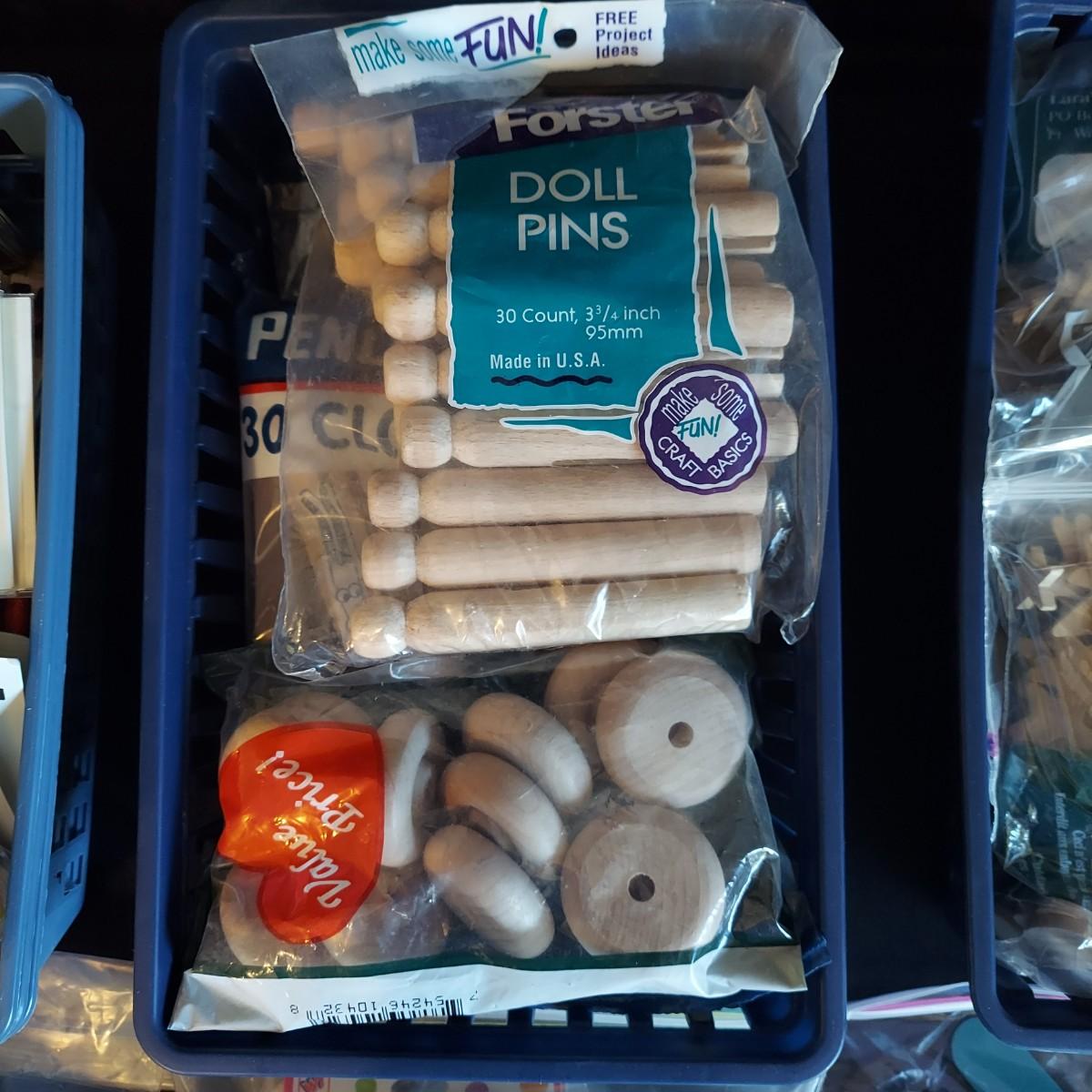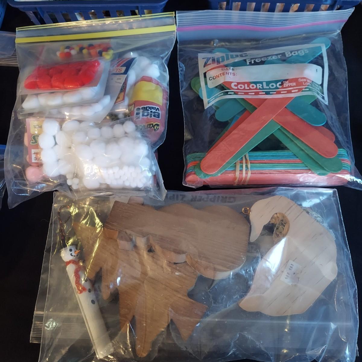 Lot includes four medium bins and one small box full of craft supplies. There are several different cut wood shapes relating to holidays. There are some Christmas ornaments as well. Local Pickup Only.