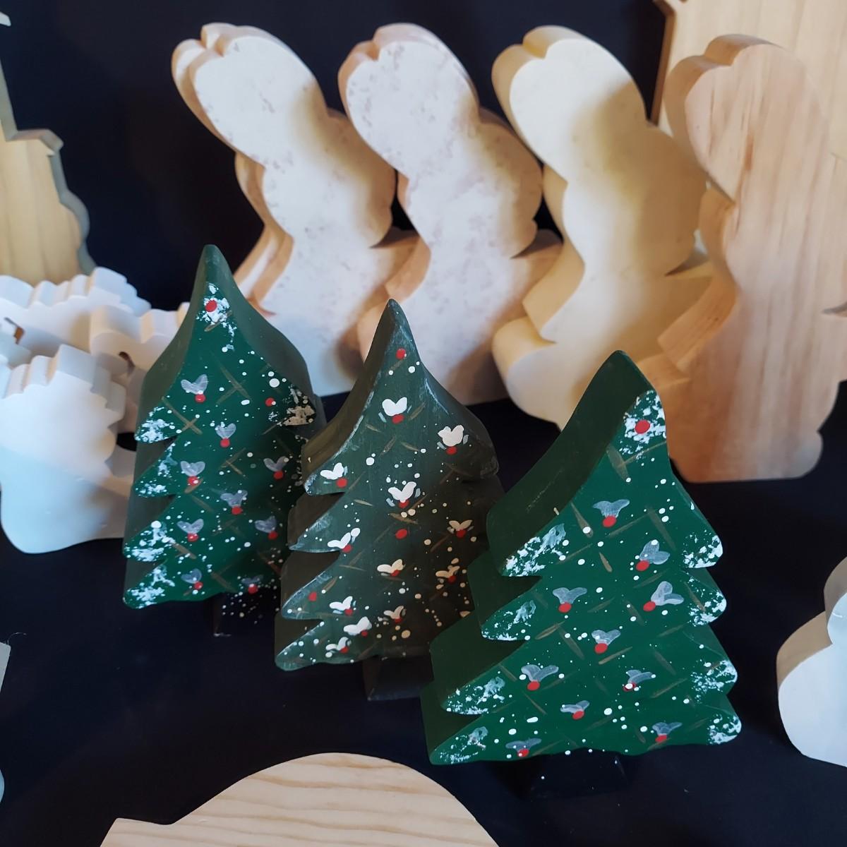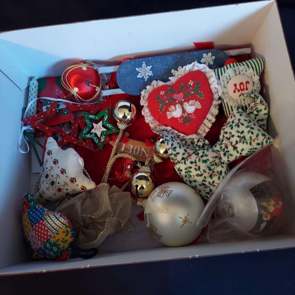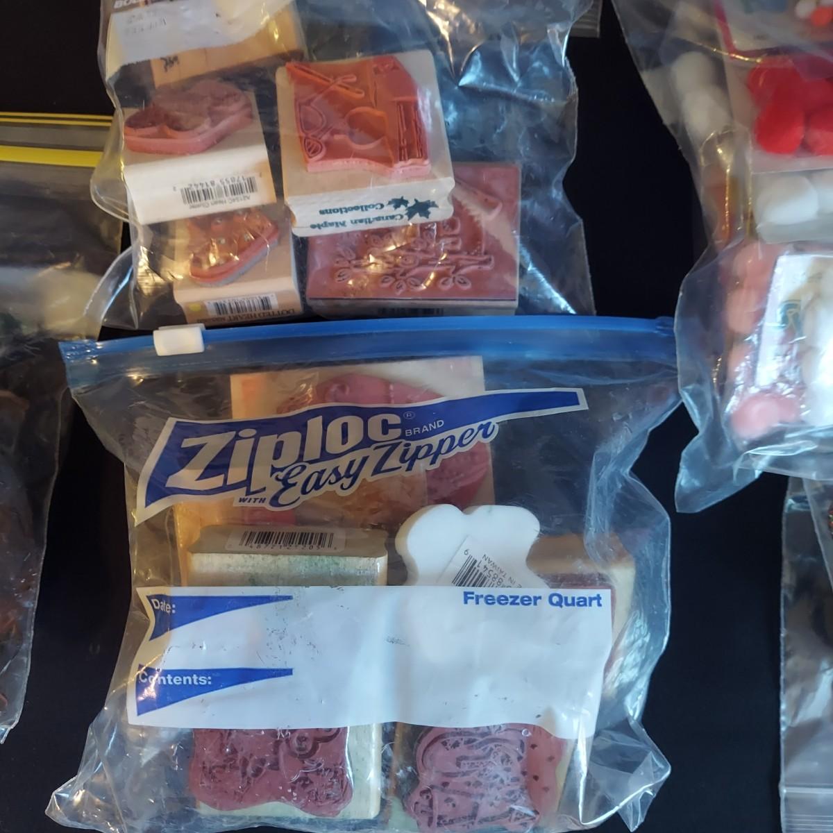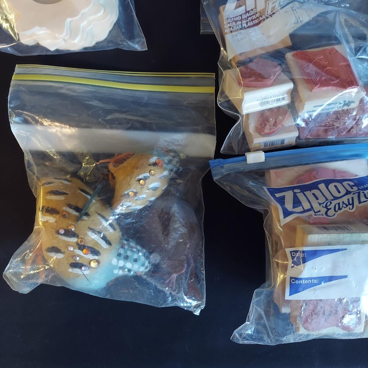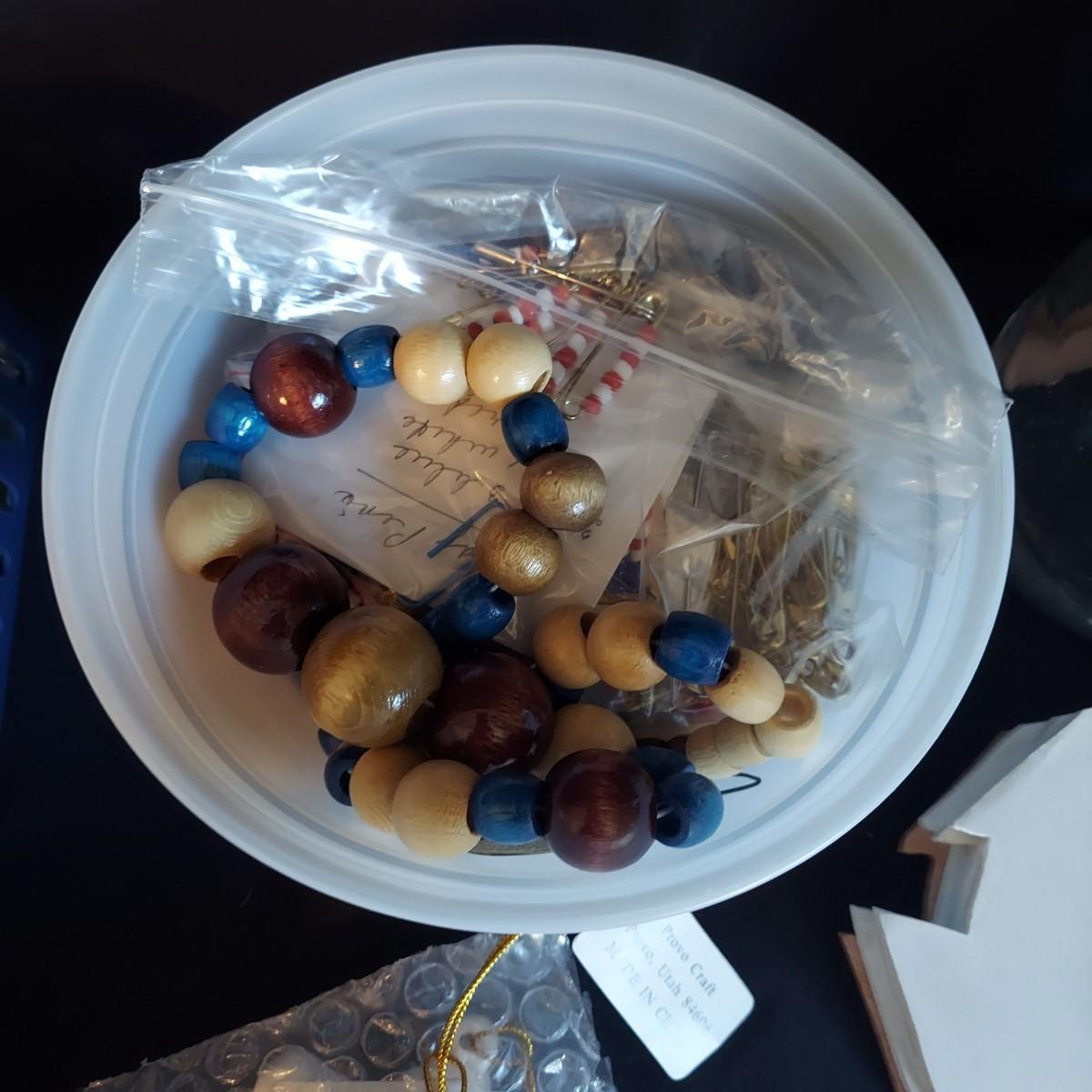 Lot includes four medium bins and one small box full of craft supplies. There are several different cut wood shapes relating to holidays. There are some Christmas ornaments as well. Local Pickup Only.
