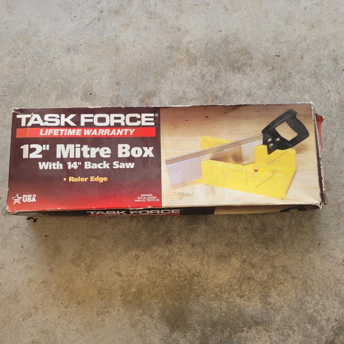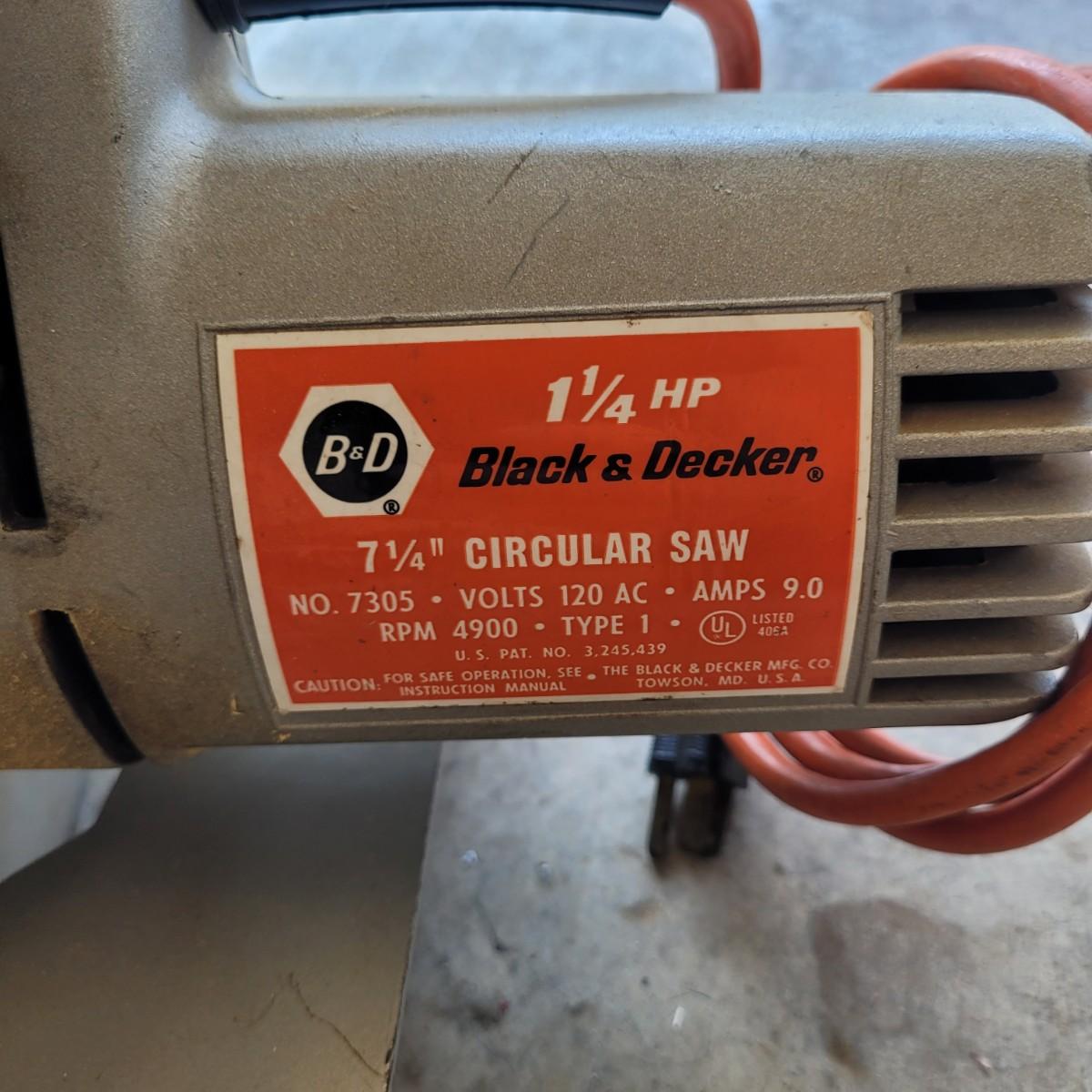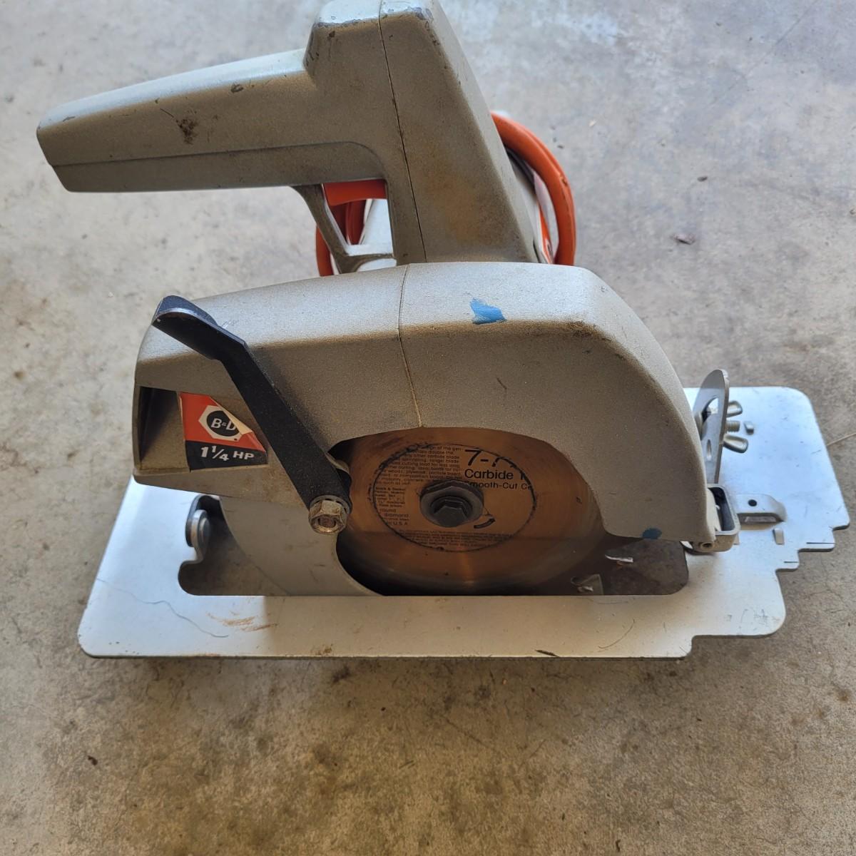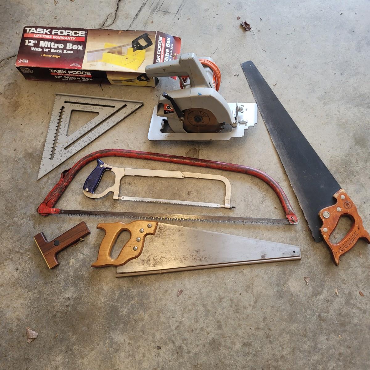 This lot includes multiple saws and wood Cutting tools. Included in this lot: a corded Black and Decker brand circular saw, four hand saws, a metal square tool, and a 12" mitre box for angled cuts. The power saw is 7-1/4" and turns on when plugged in. Three of the hand saws appear to be for wood, while one is for metal. The metal square is labeled as a rafter angle square. The mitre box includes box, but has been opened and used.